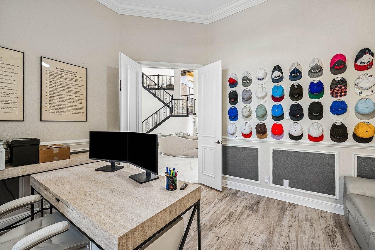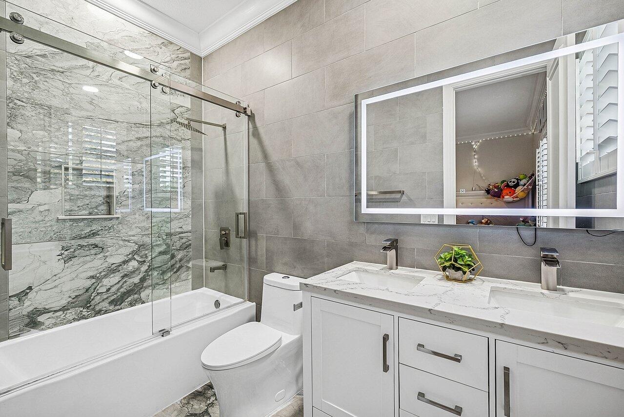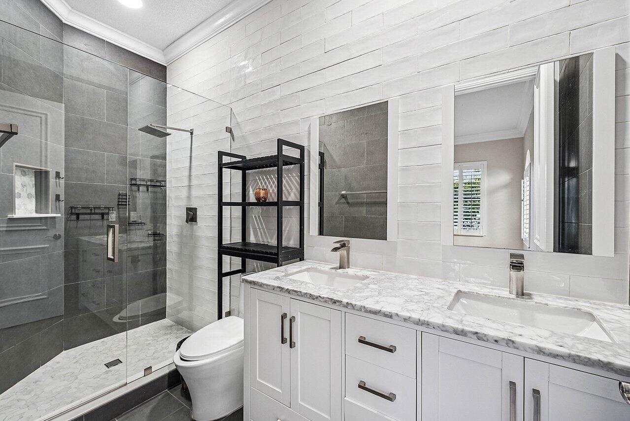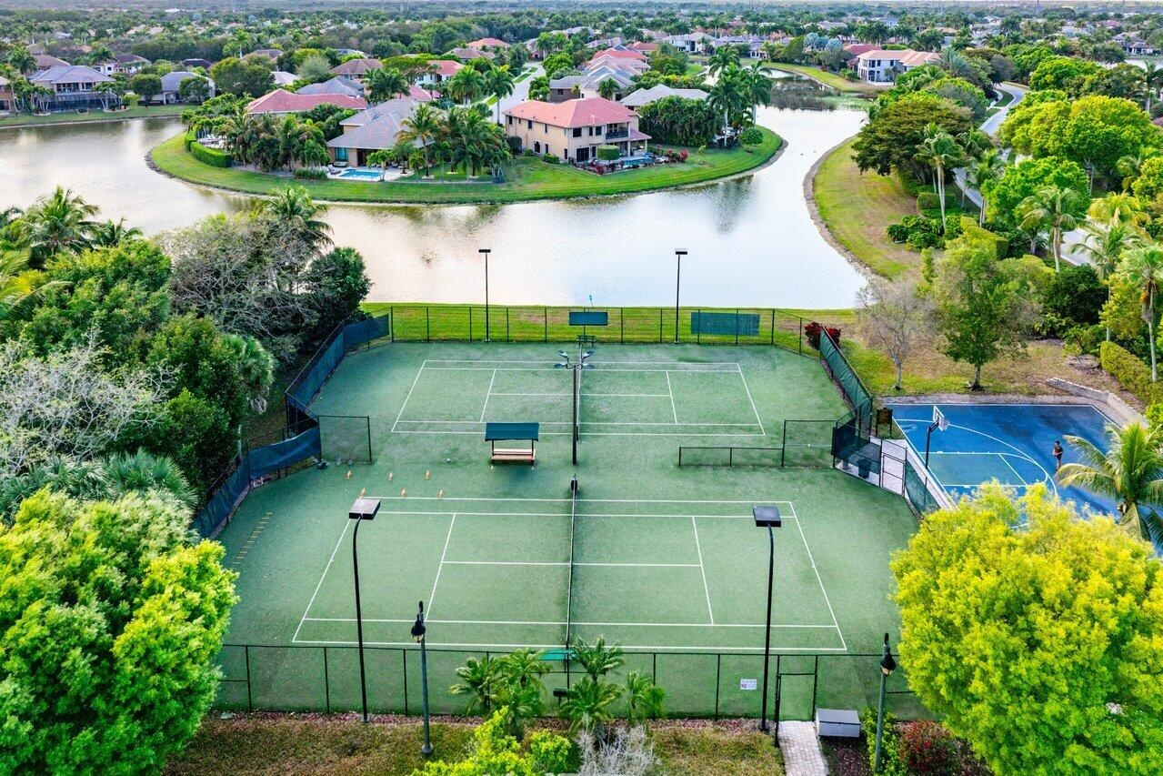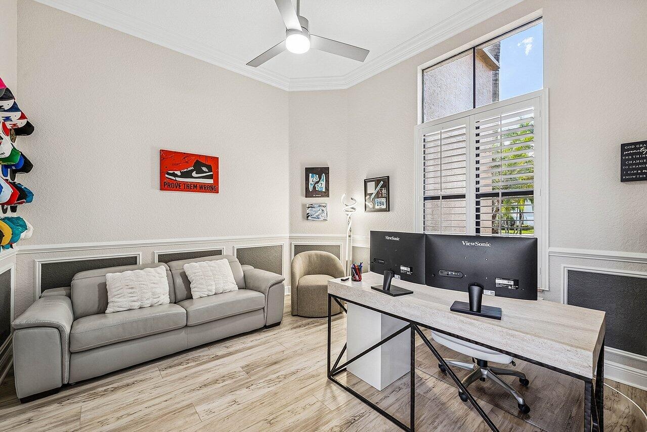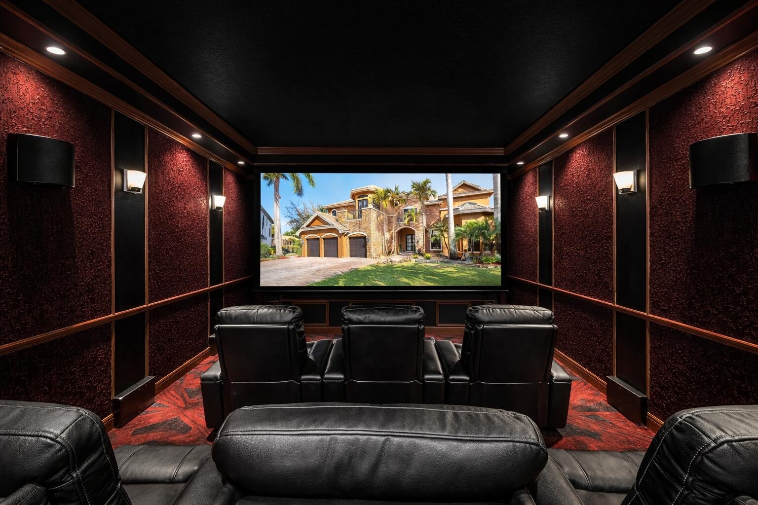 European elegance meets modern sophistication in this exquisitely updated Marseilles estate, ideally positioned on a quiet 17,000 sq ft cul-de-sac lot with sweeping lake views in Versailles. Soaring ceilings, dramatic windows, and polished Italian porcelain tile create a breathtaking first impression, with panoramic views of the resort-style pool and water beyond. Offering over 6,300 square feet, this thoughtfully designed home features 5 bedrooms, 6.5 baths, a private office, loft, media theater, and oversized 3-car garage. The stunning gourmet kitchen showcases waterfall quartz countertops, natural gas cooktop, double wall ovens, Miele built-in coffee system, custom cabinetry, apron sink, and walk-in pantry -- all flowing seamlessly into the expansive family room and casual dining area filled with natural light and tranquil lake views. A grand formal dining room with adjacent bar elevates the home's entertaining appeal. The first-floor primary suite is a private sanctuary with dual spa-inspired bathrooms, custom walk-in closets, a coffee bar, and serene sitting area with French doors overlooking the pool and preserve. A top of the line Michael Phelps therapeutic spa completes the resort experience. A guest suite, private office, and additional powder bath are also located on the main level. Upstairs offers three spacious bedrooms, three baths, an open loft, and a fully customized media theater room with acoustic walls, premium seating, and top-tier projection system for a true cinematic experience. The backyard is a private waterfront oasis featuring a saltwater pool with slide, new natural gas heater and pump, and a brand-new lakeside summer kitchen with grill, flat-top, refrigerator, beverage chiller, stone counters, sink, and two flat-screen TVs. An expansive travertine patio, outdoor sound system, LED lighting, and large fenced grassy area make this home ideal for entertaining or quiet evenings under the palms. Versailles residents enjoy 24-hour manned security, a renovated clubhouse, resort-style pool, fitness center, tennis and basketball courts, playground, and HOA-included lawn care, cable, and WiFi. Just minutes from Wellington's equestrian venues, International Polo Club, Whole Foods, Trader Joe's, fine dining, shopping, the Florida Turnpike, and PBI Airport. Meticulously updated and impeccably maintained -- this is luxury lakefront living at its finest.
