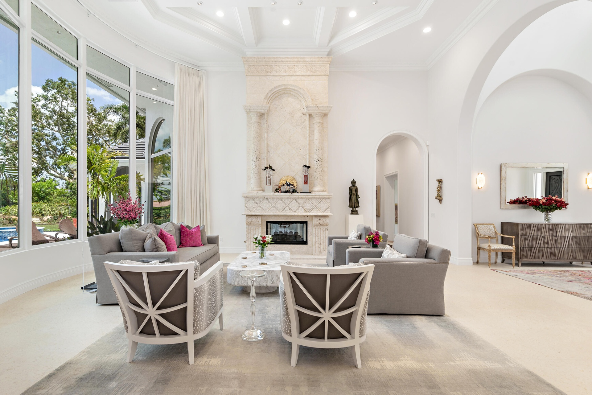 An extraordinary one level offering within the prestigious Palm Beach Polo Club, this impeccably reimagined estate embodies refined luxury and effortless sophistication. Spanning more than 6,700 square feet, the residence showcases four expansive bedroom suites, two private offices, and four exquisitely appointed baths. Soaring volume ceilings and a grand open floor plan create a majestic sense of scale and light, while newly installed marble flooring flows seamlessly throughout. Designed for both elegant entertaining and intimate living, the home opens to masterfully landscaped grounds with expansive covered terraces and curated outdoor living and dining areas. A newly constructed resort-style pool and spa serve as the centerpiece of the private oasis, complemented by a fully equipped kitchen for distinctive al fresco gatherings. Impact-rated glass throughout ensures security, tranquility, and energy efficiency, while a brand-new roof and whole-house generator deliver peace of mind and further elevate the home's comfort and reliability. A four-car garage, providing generous space for prized vehicles and storage, completes this exceptional retreat. Set within one of South Florida's most coveted gated communities - renowned for its world-class equestrian and golf lifestyle - this timeless residence represents a rare opportunity to acquire turnkey luxury in a premier Wellington address.