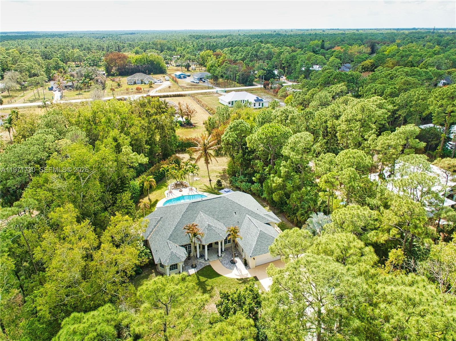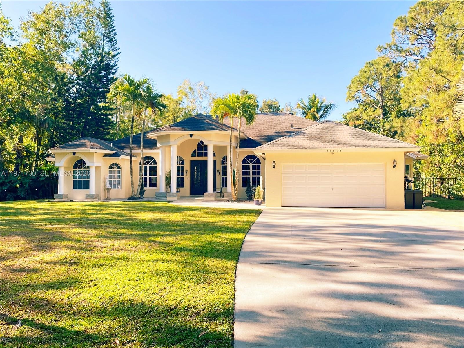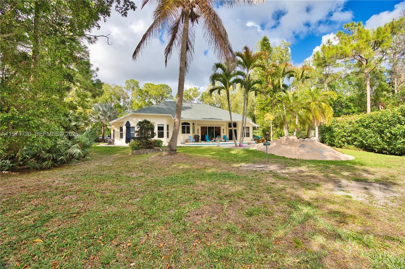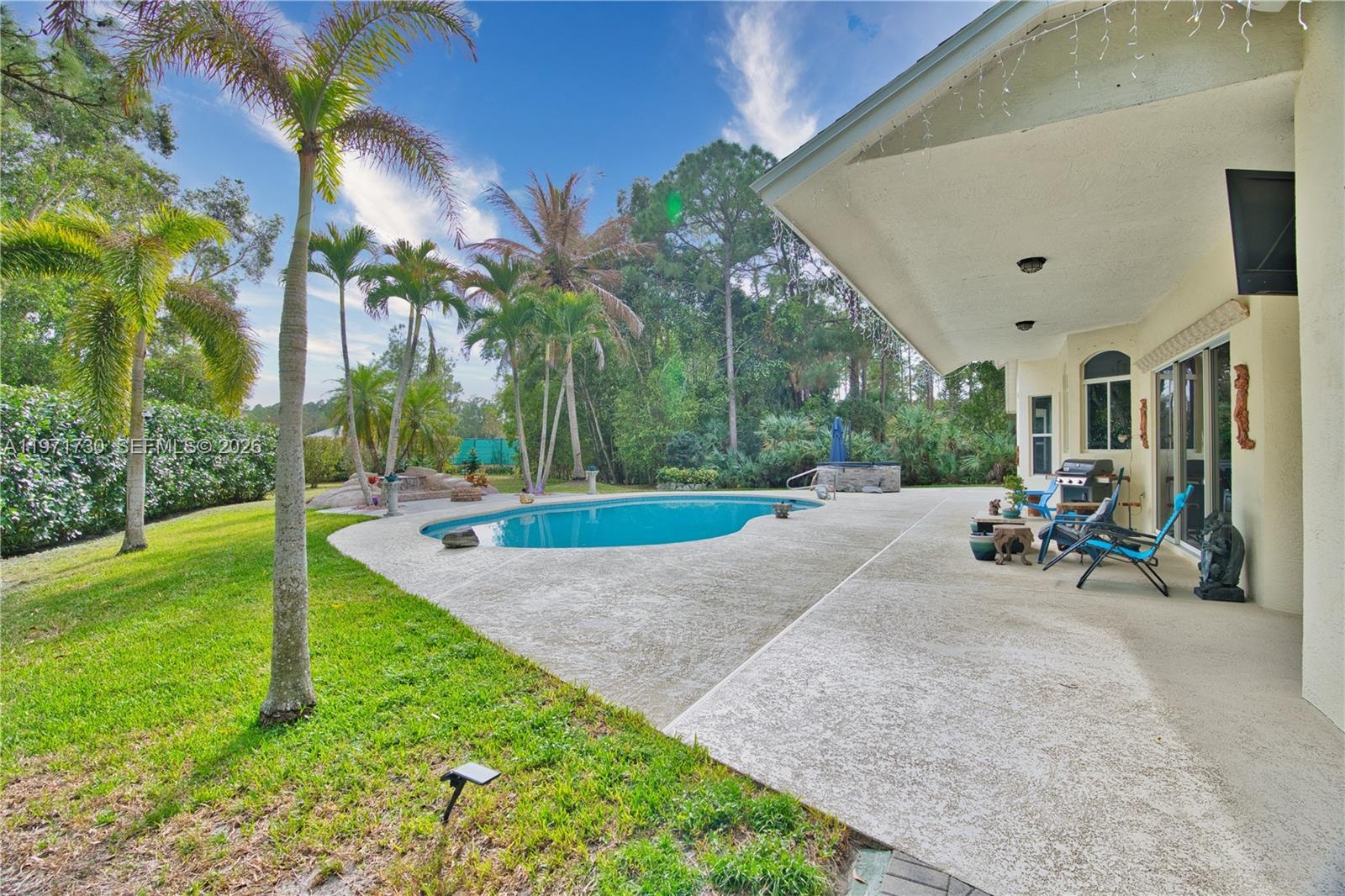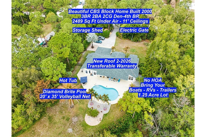 Situated in a beautiful equestrian community, this CBS BLOCK 3BR 2BA Home has a spacious Den or 4th Bedroom, 2 Car Garage, and Pool in Jupiter Farms on a large 1.25 Acre Lot. This newer home was built in 2000, and is 2,574 Sq Ft under air with 11’ ceilings. New Roof in February 2026 with a transferable warranty and wind mitigation report! New Air Conditioning units. New Water Filtration system with a phone app. New Well Pump. New Rheem Tankless Water Heater 2024. New Master Bath Electric Blinds. New Mastercraft Twilight 240 Hot Tub. New Aleko Front Gate and actuator 2026.. Septic tank was cleaned out and new filter 2025. Spacious Kitchen, with all new appliances. Elegant Master Bedroom and Master Bath. New carpet with Tempur-Pedic padding in the bedrooms, and Berber carpeting in the Den. Fiberglass wall insulation. Spacious 2 Car Garage with side door and epoxy floors. Lush tropical landscaping with a Sparkling 35’ x 20’ Diamond Brite Pool (3’–5’–3’) with a removable volleyball net and a 2,000 plus square foot pool deck. Mastercraft Twilight 240 dual pump Hot Tub in 2022. Beautifully lighted Waterfall Fountain. Large covered patio 12’ x 32’. NO HOA bring your Horses, Boats, RVs, Jet Skis, and Trailers. Large 12’ x 12’ storage shed. Excellent location close to Beautiful Beaches, I-95, Florida Turnpike, Gardens Mall, and West Palm Beach Airport. Excellent A-Rated schools. Paradise Awaits!