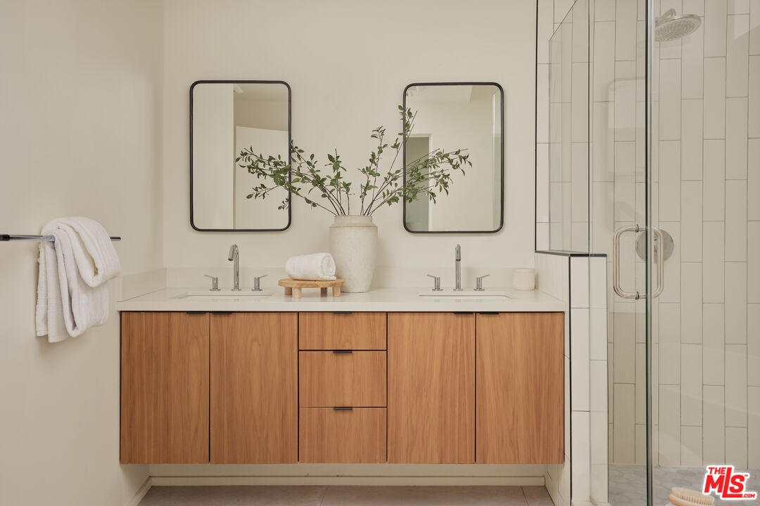 This rare and stylish tri-level townhome presents a unique offering in one of Santa Monica's most sought-after newer developments. Featuring over 600 square feet of private outdoor space, the exceptional design of this modern 2 bedroom, 2.5 bathroom retreat features seamless indoor-outdoor California living with a functional layout, oversized main level terrace and expansive private rooftop deck. Upon entering the home, one is met with a dramatic open concept layout of impressive scale. The chef's kitchen is both striking and functional, featuring custom walnut cabinetry, open shelving and Miele appliances. A generous center island anchors the space, with thoughtful extras throughout including a built-in desk and expansive walk-in pantry. The spacious living area is elevated by custom white-oak built-ins designed by Venice-based interior design firm Tumbleweed & Dandelion. The floor-to-ceiling pocket doors bathe the home in natural light and open to the large private terrace, California living at its finest. The second level features a primary bedroom suite of impressive scale with floor-to-ceiling windows, an oversized walk-in closet and a bathroom with a double vanity, deep soaking tub and separate shower. Rounding out the upper level of the home is a second bedroom with an en suite bath, a laundry room and interior stairs leading to the full-floor rooftop deck on the third level. This serene rooftop terrace features upgraded landscaping for added privacy and ample space for outdoor entertaining and dining, ideal for morning yoga, every day enjoyment and evenings showcasing sweeping views and impressive sunsets. Additional highlights include a private enclosed subterranean side-by-side 2-car garage with gated rear access and multiple gated pedestrian entrances to the 6-unit boutique complex. This spectacular residence is ideally located just moments from the beaches of Santa Monica and perfectly situated in one of California's most vibrant coastal communities.