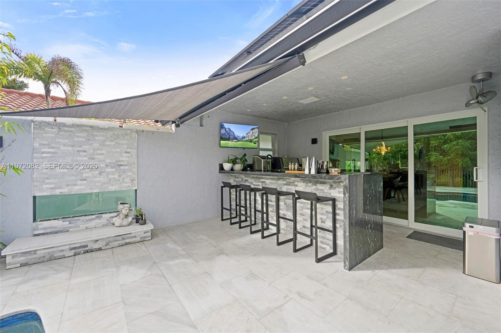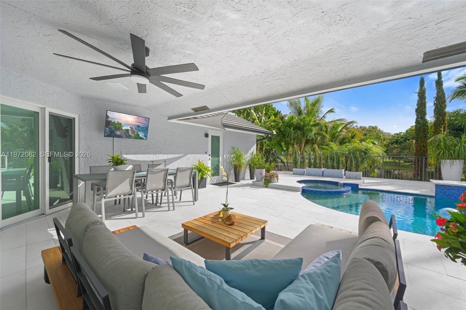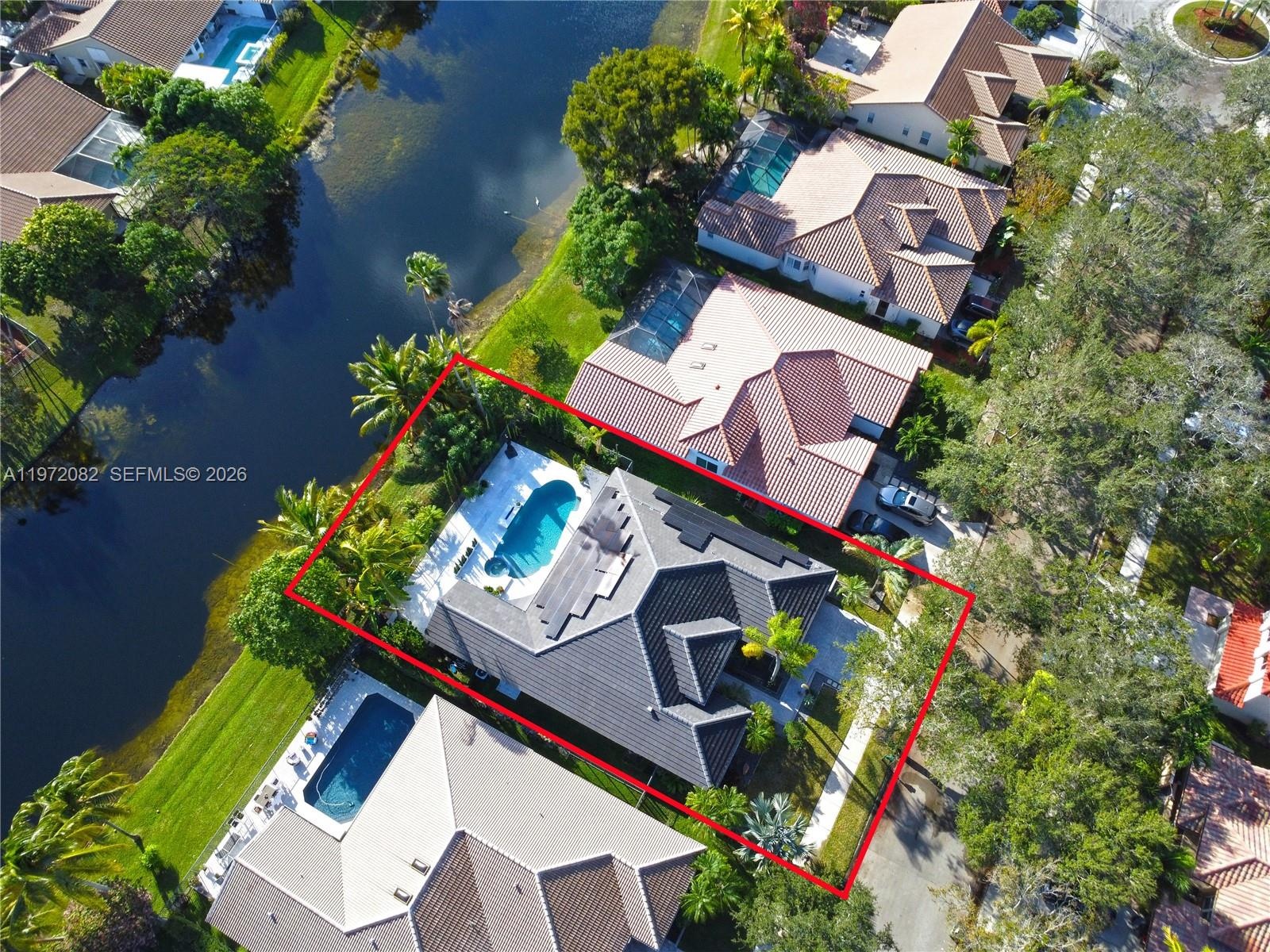 The kitchen flows seamlessly to an entertainer’s dream backyard. Enjoy a resort-style heated salt pool and jacuzzi, two fire features, and a premium outdoor BBQ kitchen with a bar and wine fridge—all overlooking peaceful lake views. The property is a private tropical orchard, featuring mature Mango, Fig, Papaya, Avocado, and Kiwi trees, accented by Italian Cypresses and custom landscape lighting.Built for efficiency and peace of mind, the home includes a full solar system, EV charger, hurricane impact windows (4 yrs), a new flat tile roof (2 yrs), and new AC (2.5 yrs). The garage features custom storage, closets, and a second refrigerator. This turnkey, waterfront gem in one of Weston’s most verdant communities won’t last long again.