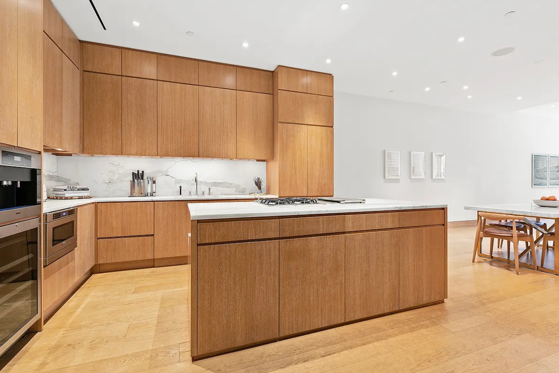 The open chef’s kitchen is a showpiece designed for both entertaining and everyday living. Honed Calacatta marble countertops and backsplash pair seamlessly with custom oak cabinetry and an elite appliance suite including Liebherr refrigeration and wine storage, multiple Gaggenau ovens and cooktop, Miele integrated dishwasher, Miele coffee system, and more.