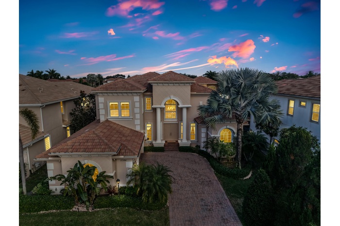 Experience refined luxury living in the heart of Boca Raton's coveted Millionaire's Mile at Azura on the Jog Road corridor. Ideally located near Boca's top-rated private and public schools, this exceptional residence is tucked away on a quiet cul-de-sac with no rear neighbors, offering a rare sense of privacy in a highly sought-after setting. An extended driveway leads to a three-car garage and welcomes you into an impressive interior. The thoughtfully designed floor plan features five bedrooms, four and one-half baths, a private office, and a spacious loft. Soaring 23-foot ceilings enhance the home's grand, open feel. The primary suite is conveniently located on the main level and includes an additional sitting area, perfect for a home office or workout space. The primary bath offers dual sinks, a soaking tub, and a large walk-in shower. Upstairs, you'll find three additional bedrooms and two full baths, including a Jack-and-Jill layout.