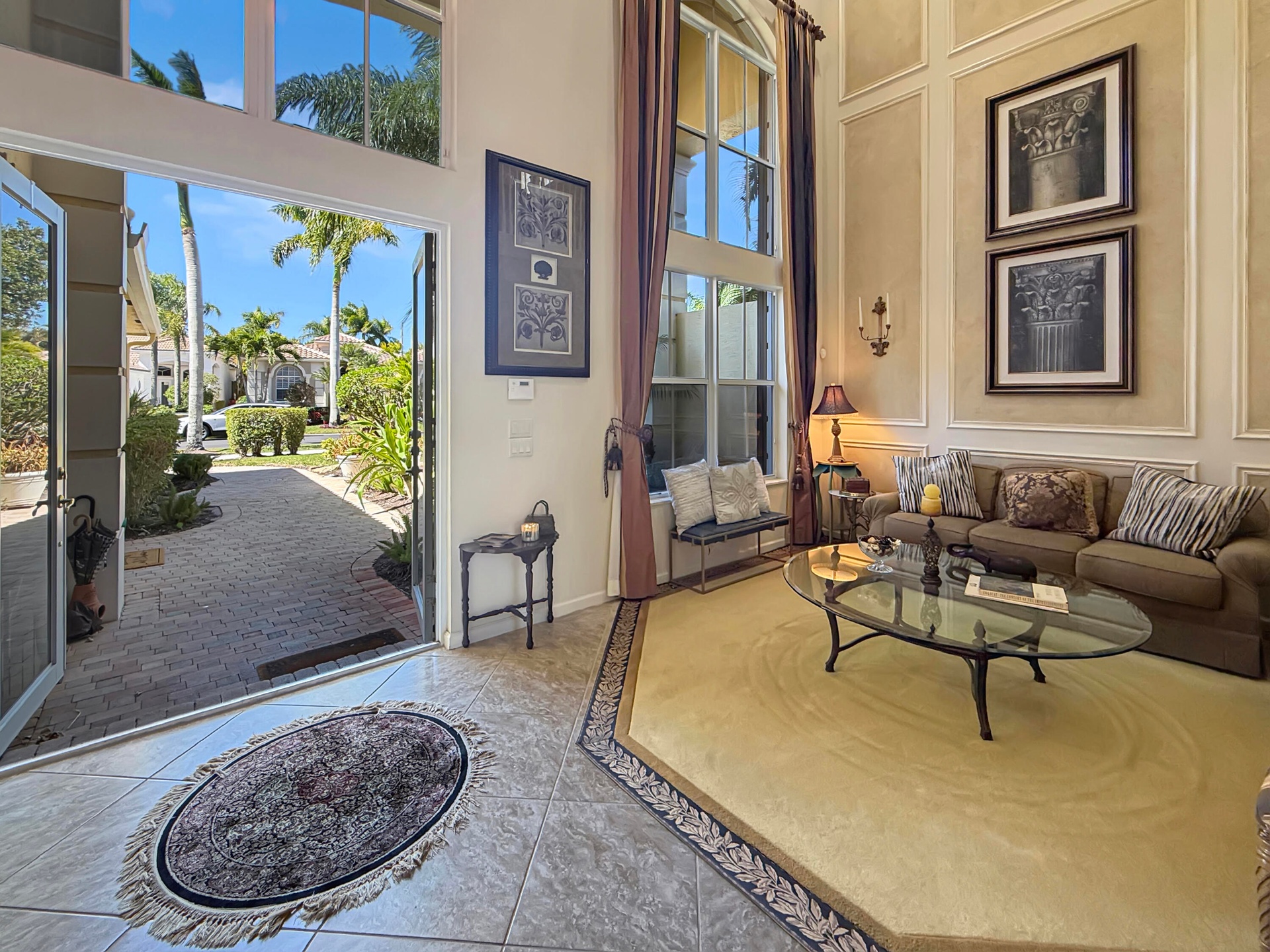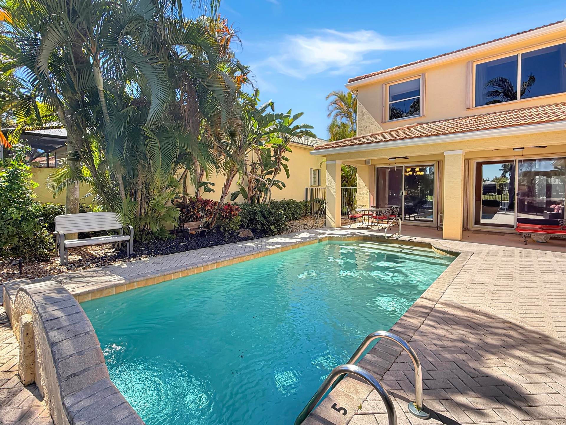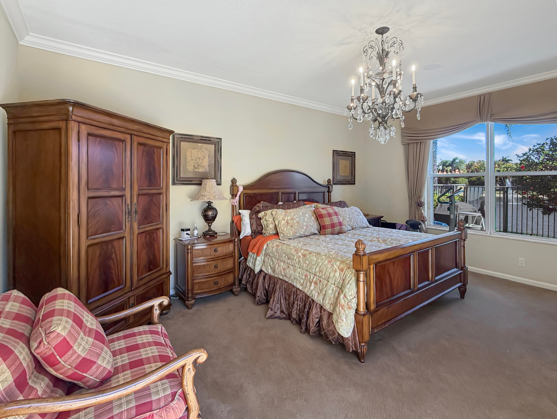 Sliding glass doors from both the primary suite and main living area lead to a covered patio and sparkling pool, all overlooking a serene lake perfect for enjoying Florida's indoor-outdoor lifestyle.