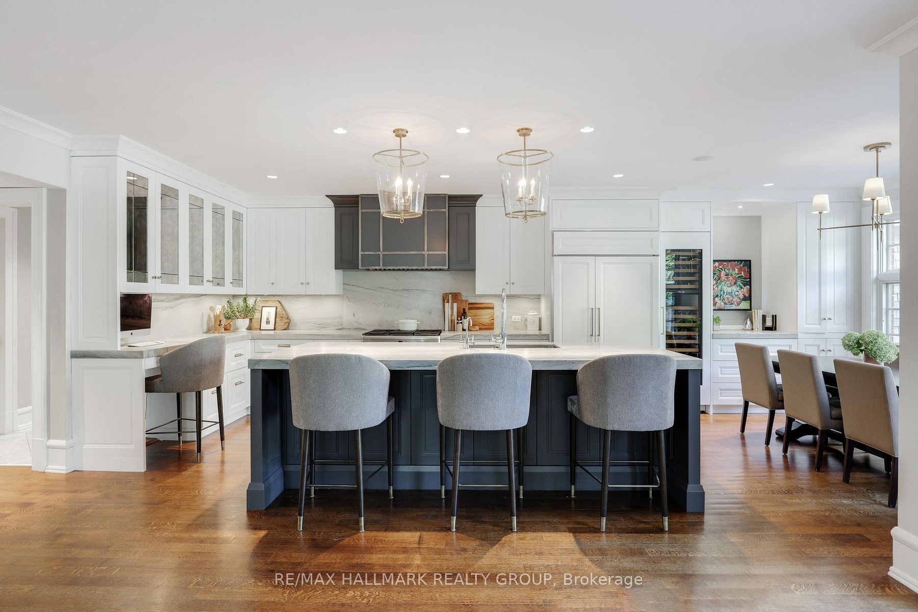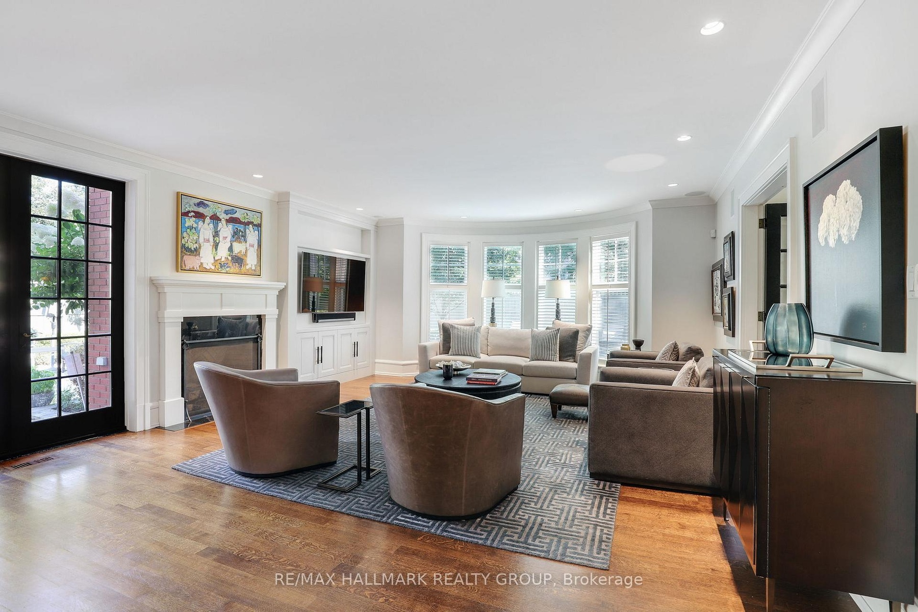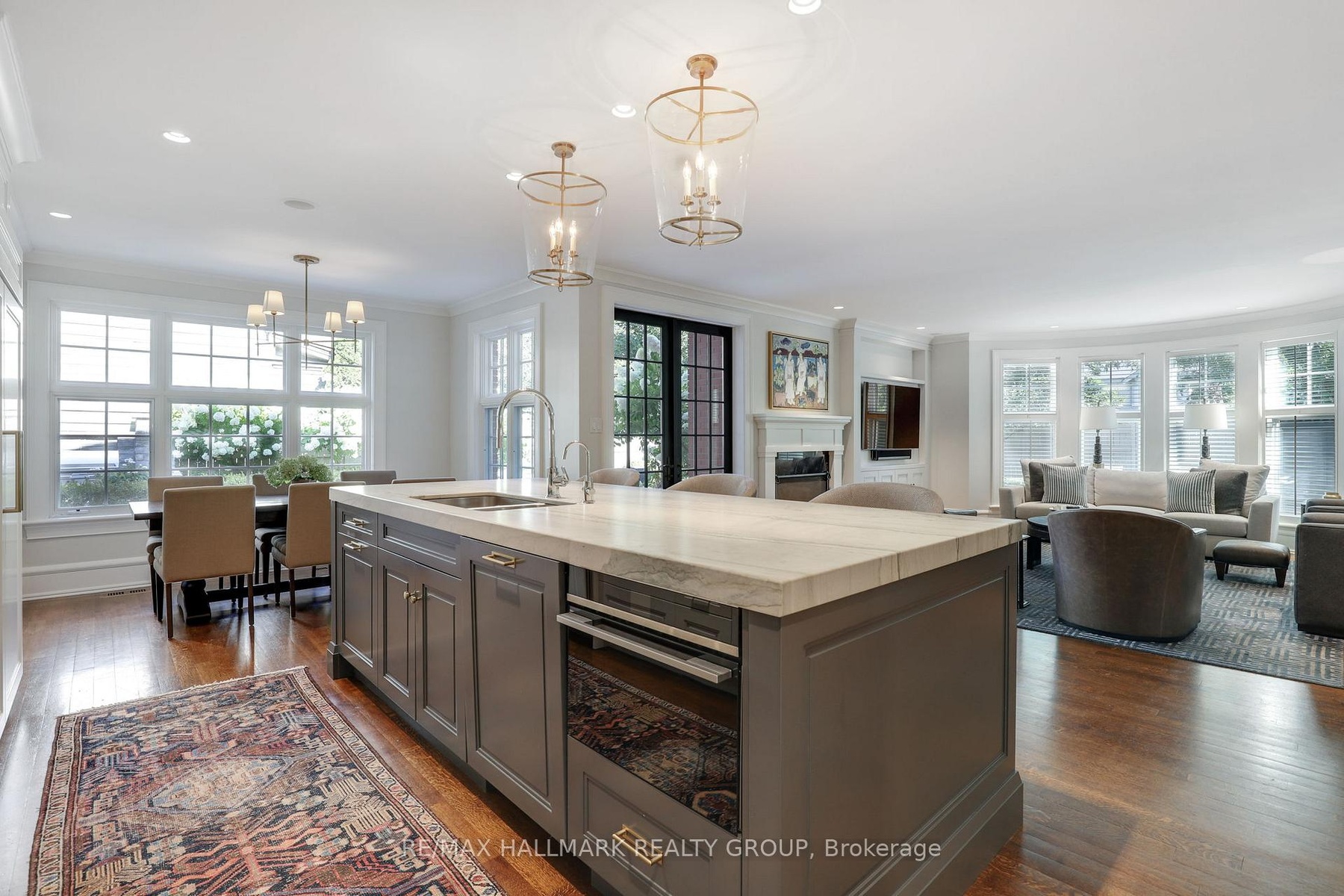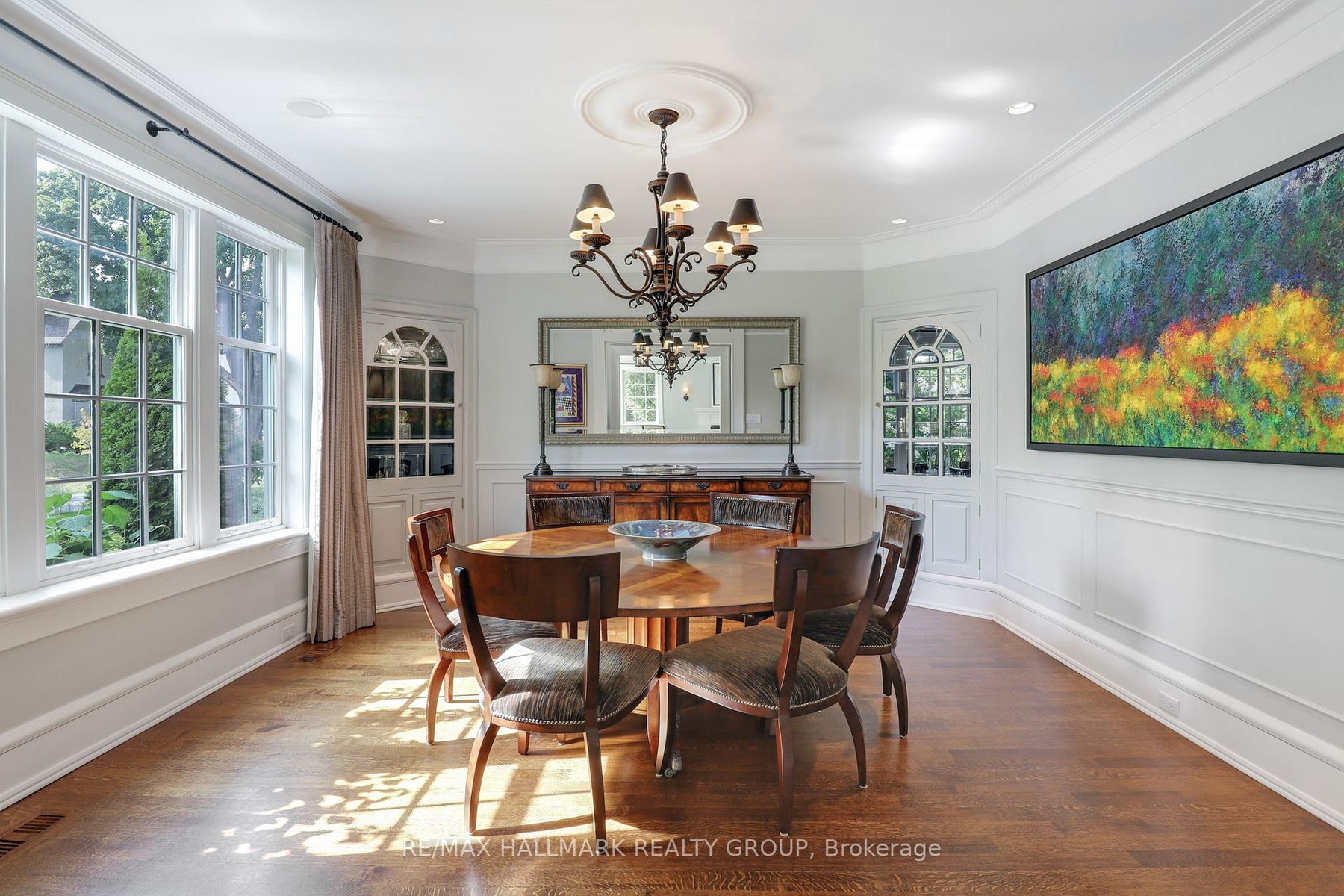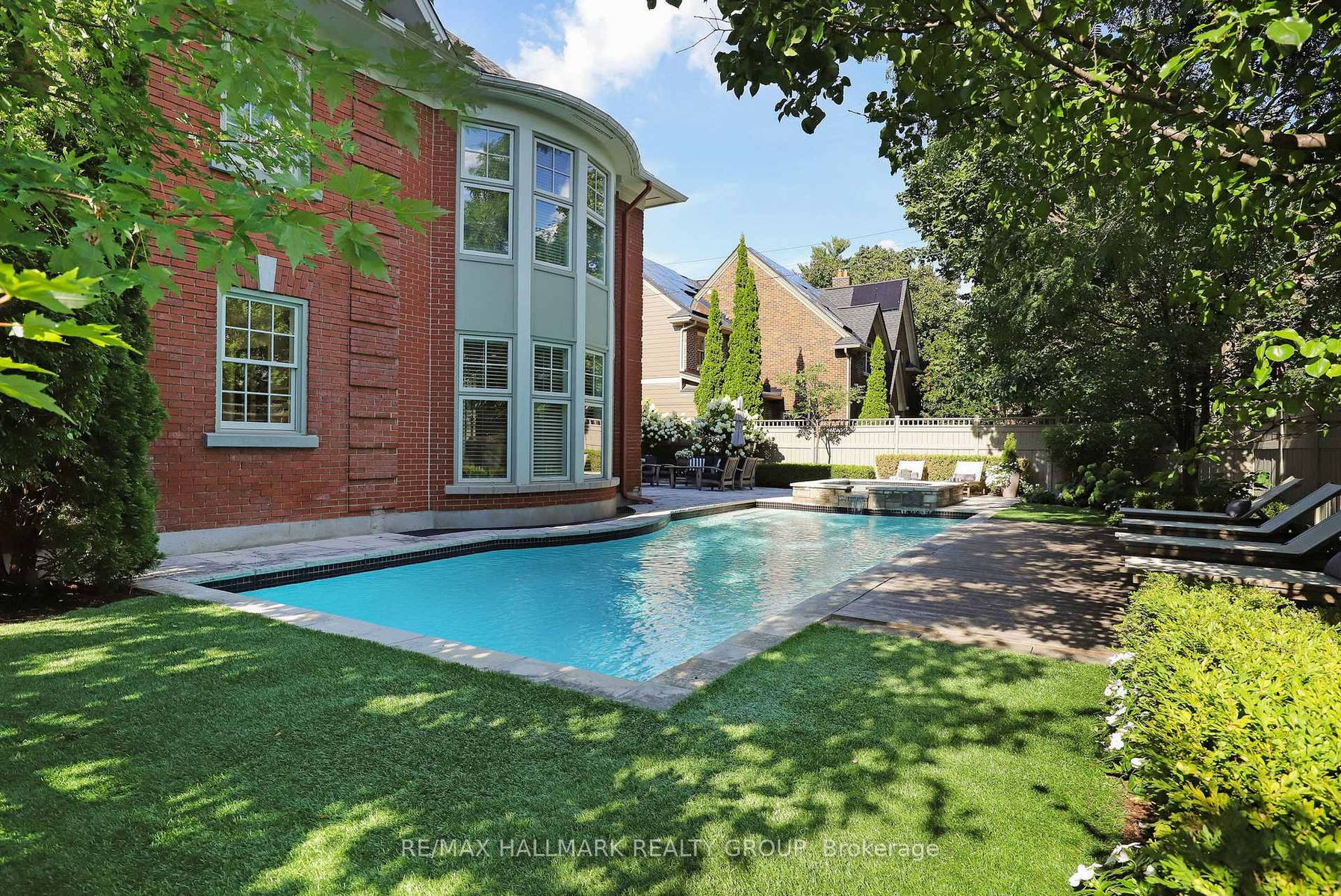 A rare offering in Ottawa's prestigious Island Park neighbourhood - 525 Piccadilly Avenue is a Barry Hobin designed corner estate with interiors by 2H Design, blending heritage character and modern luxury across four levels. The grand foyer sets the tone with soaring ceilings, rich hardwood, and detailed millwork. Formal living and dining rooms feature original hutches, restored shelving, and a marble fireplace. A spacious family room with bay windows, marble gas fireplace, and custom cabinetry opens to the designer kitchen and outdoor living. The kitchen showcases antique mirrored cabinetry, leathered quartz counters, a custom range hood with gas range and steam oven, wine tower, and oversized island paired with a breakfast room complete with serving area and office nook. A herringbone marble tiled mudroom with custom cubbies connects via breezeway from the over-sized garage for discreet family entry. French doors lead to a resort-style backyard with terraced dining, built-in BBQ kitchen, gunite pool with spa and water feature, and multiple lounge decks surrounded by manicured gardens. The second level offers a serene primary suite with bay window views, travertine and limestone ensuite, and dual walk-in closets. Two more bedrooms incl. another with ensuite as well as one currently used as den/office, and four-piece bath complete the floor. The third level is host to spacious bedrooms with full bath between the two. The lower level includes a recreation room, gym with infrared sauna, custom wine cellar, nanny/guest suite with bath, laundry, and ample storage. Timeless architecture, designer finishes, and exceptional outdoor living make this Island Park residence an extraordinary opportunity.