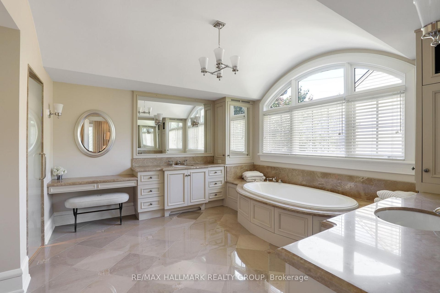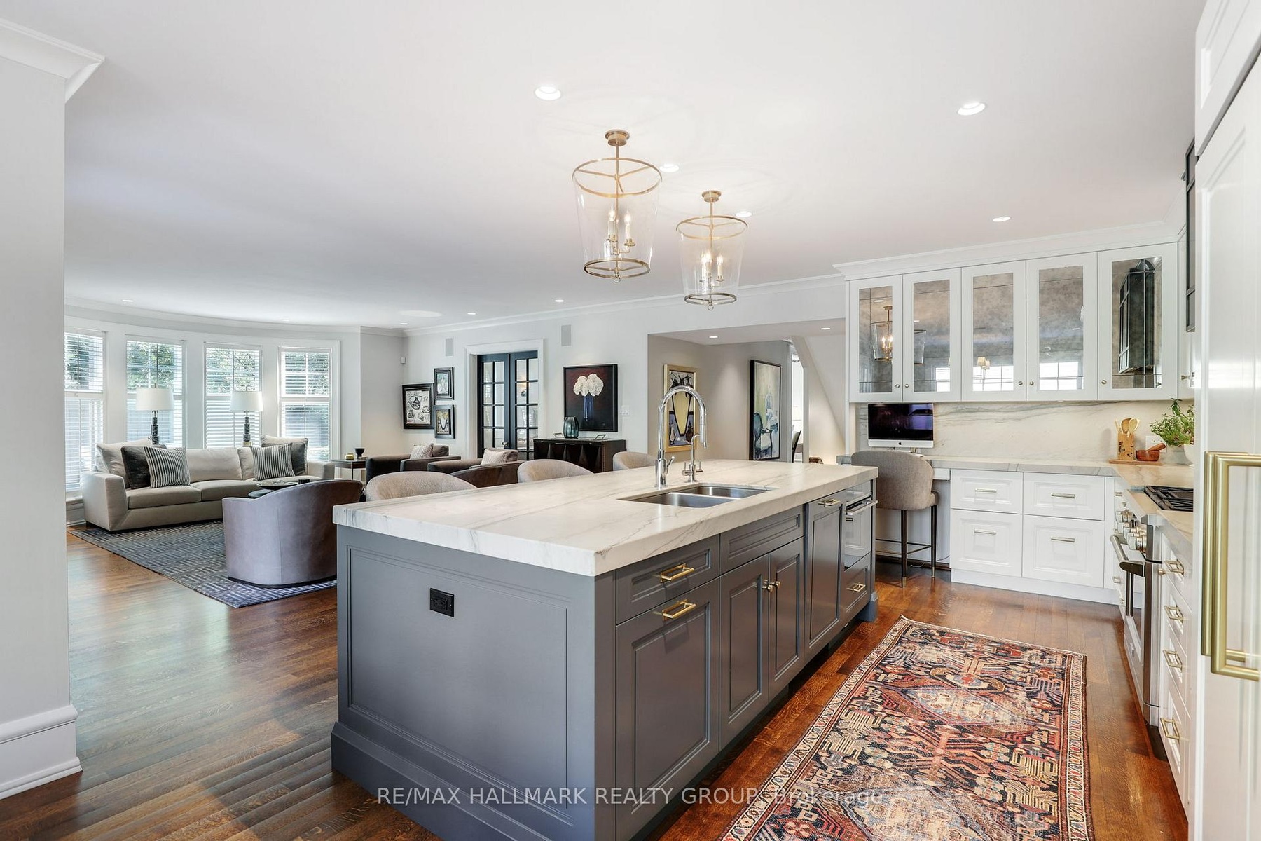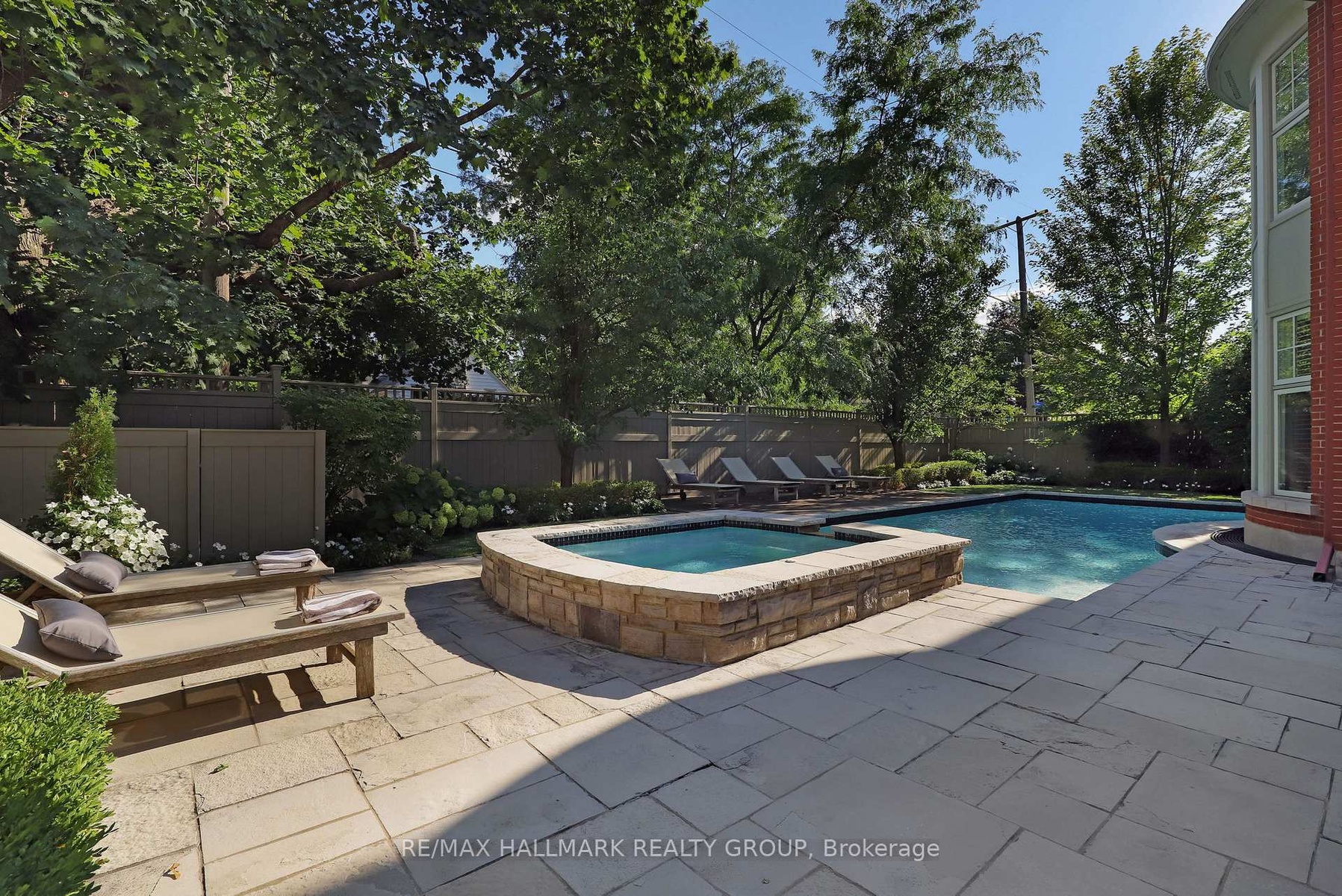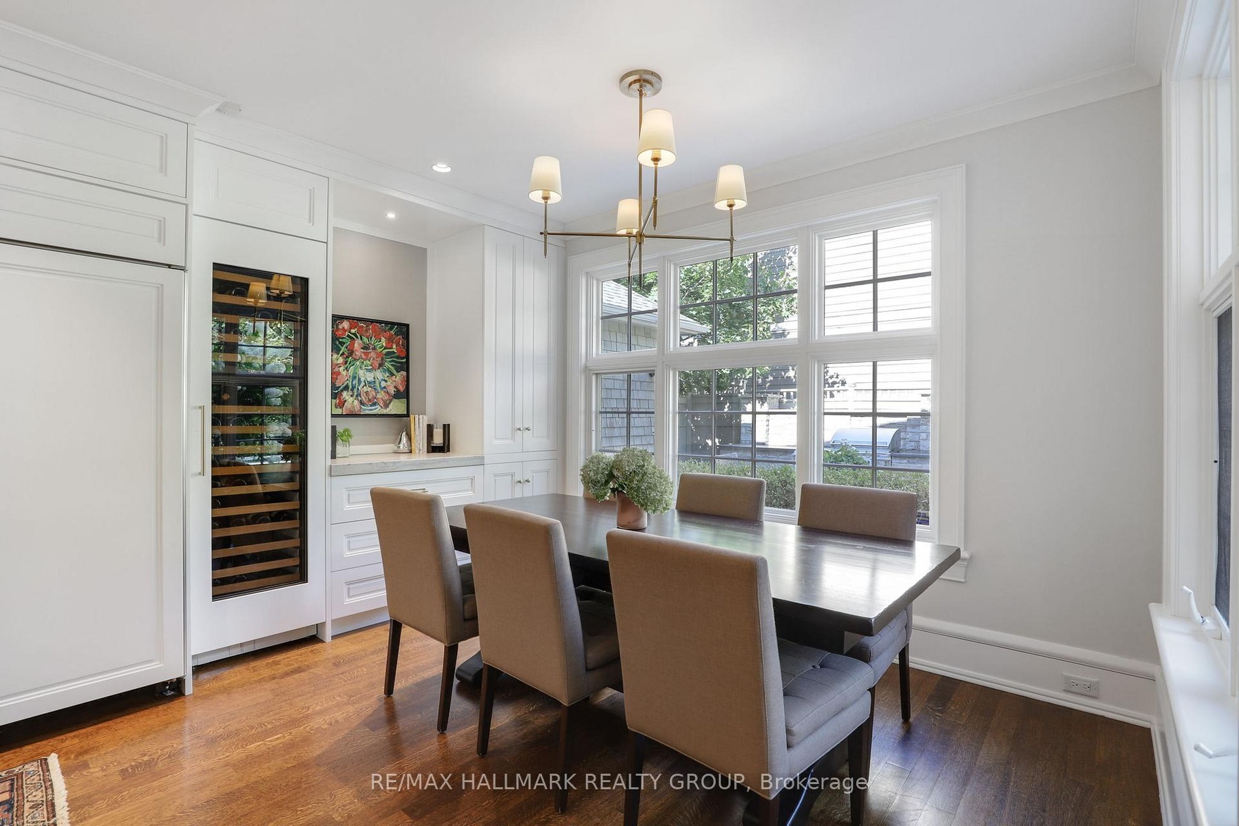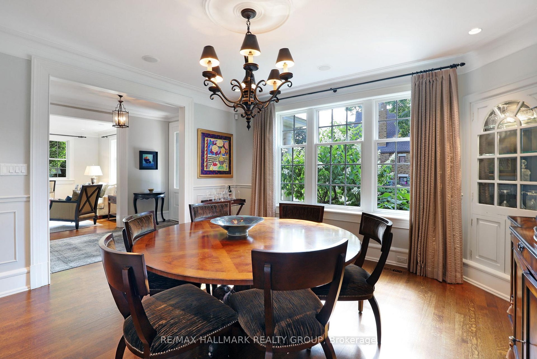 A rare offering in Ottawa's prestigious Island Park neighbourhood - 525 Piccadilly Avenue is a Barry Hobin designed corner estate with interiors by 2H Design, blending heritage character and modern luxury across four levels. The grand foyer sets the tone with soaring ceilings, rich hardwood, and detailed millwork. Formal living and dining rooms feature original hutches, restored shelving, and a marble fireplace. A spacious family room with bay windows, marble gas fireplace, and custom cabinetry opens to the designer kitchen and outdoor living. The kitchen showcases antique mirrored cabinetry, leathered quartz counters, a custom range hood with gas range and steam oven, wine tower, and oversized island paired with a breakfast room complete with serving area and office nook. A herringbone marble tiled mudroom with custom cubbies connects via breezeway from the over-sized garage for discreet family entry. French doors lead to a resort-style backyard with terraced dining, built-in BBQ kitchen, gunite pool with spa and water feature, and multiple lounge decks surrounded by manicured gardens. The second level offers a serene primary suite with bay window views, travertine and limestone ensuite, and dual walk-in closets. Two more bedrooms incl. another with ensuite as well as one currently used as den/office, and four-piece bath complete the floor. The third level is host to spacious bedrooms with full bath between the two. The lower level includes a recreation room, gym with infrared sauna, custom wine cellar, nanny/guest suite with bath, laundry, and ample storage. Timeless architecture, designer finishes, and exceptional outdoor living make this Island Park residence an extraordinary opportunity.