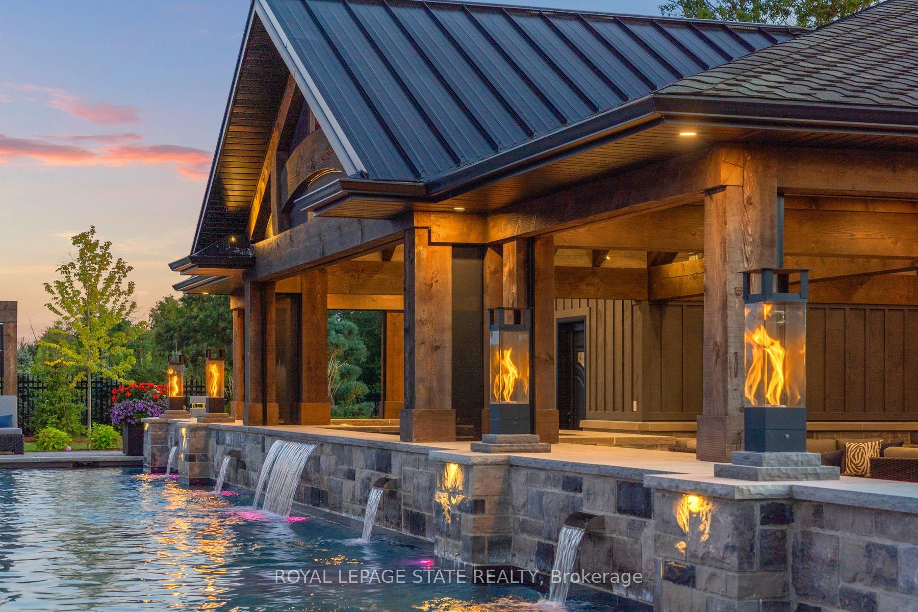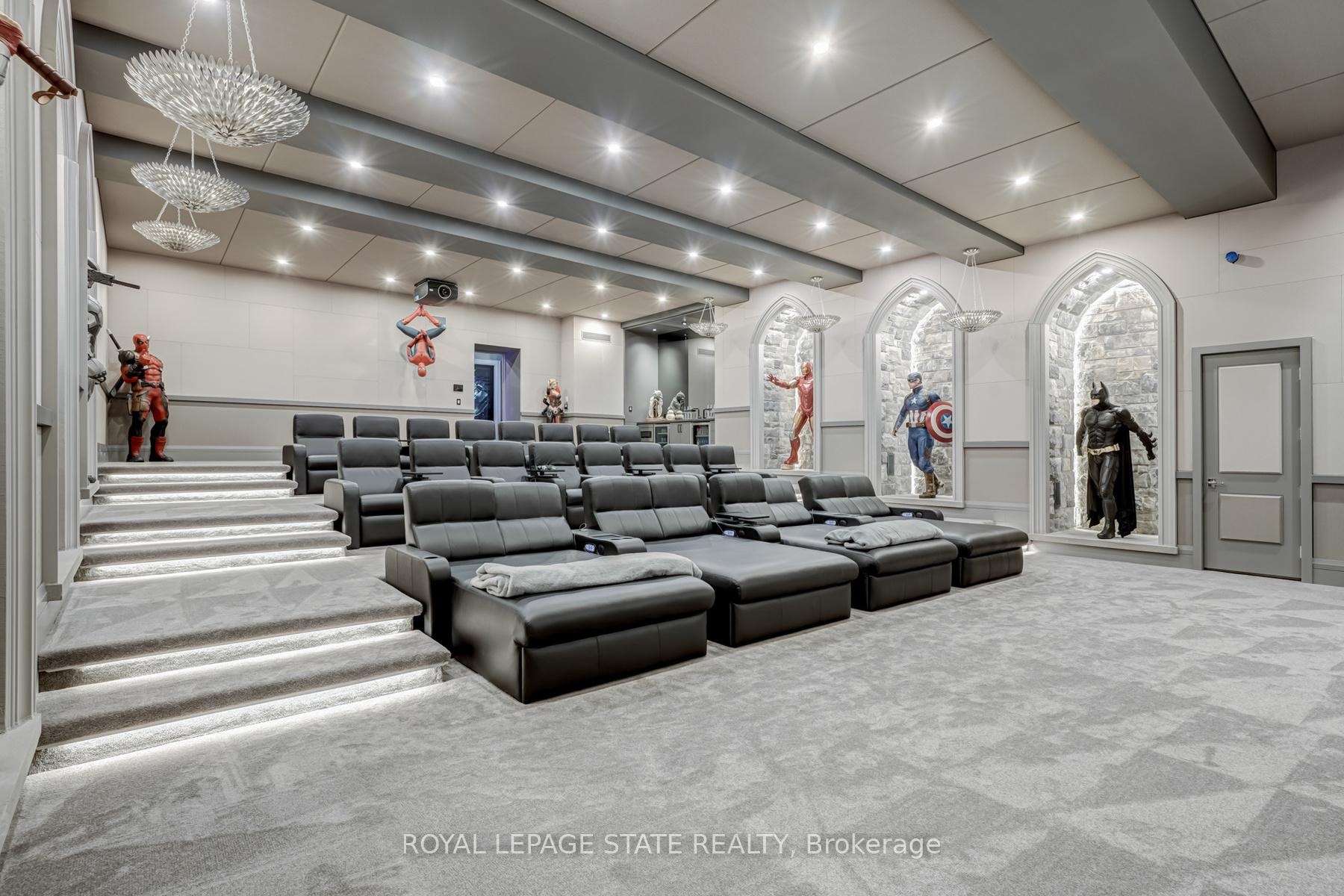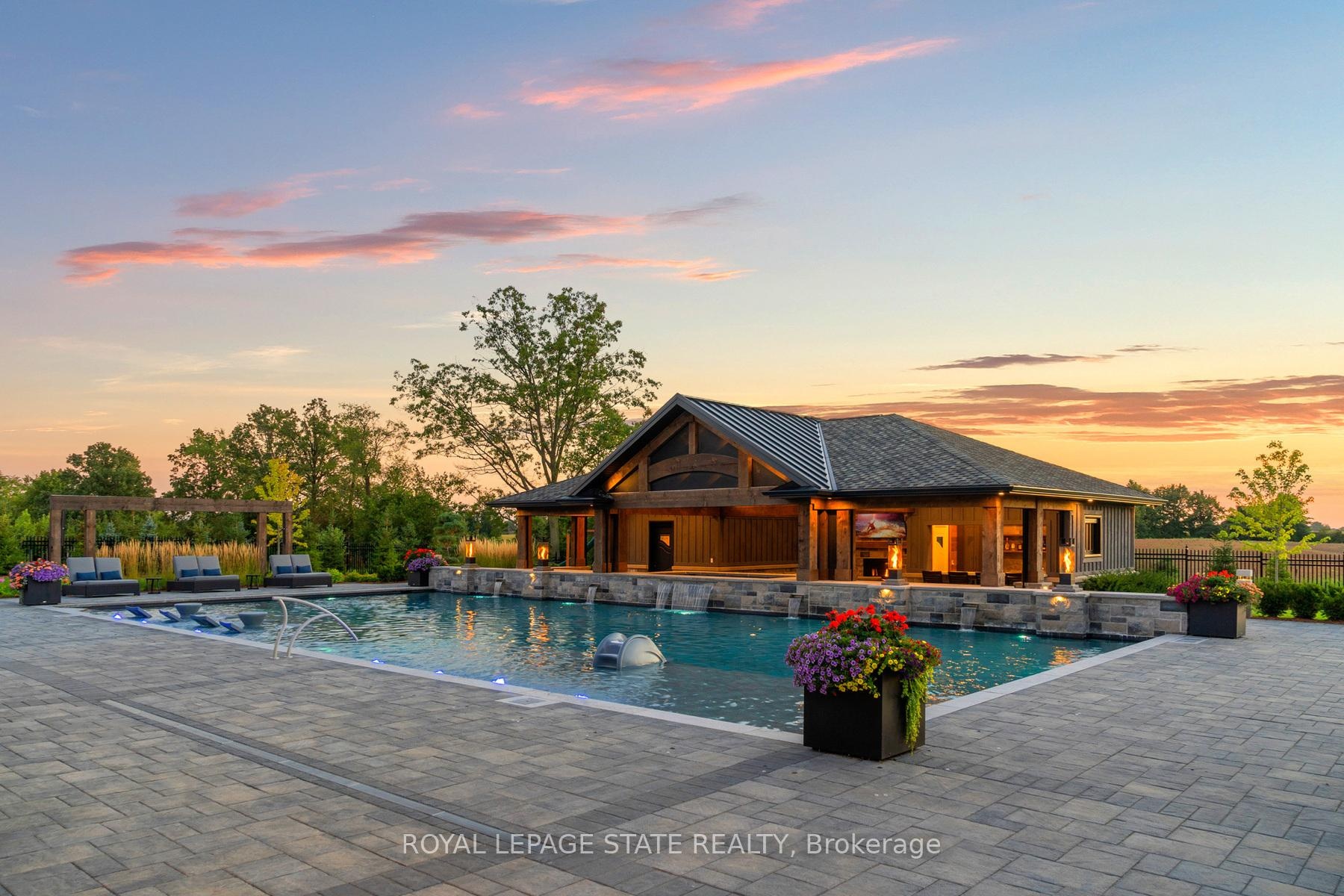 Set amidst a 5.2-acre estate, this extraordinary 32,000+ sq ft mansion offers unparalleled luxury and privacy. The gated and secured property features a stunning 1/3-acre aerated pond leading to a sprawling contemporary bungalow with lofted in-law quarters and a 5,210 sq ft detached garage with lounge, wash bay, and private gas pump-ideal for car enthusiasts.Surrounded by serene countryside, yet minutes from the heart of Ancaster, the renowned Hamilton Golf & Country Club, and Highway 403, offering both seclusion and convenience. Inside, every room showcases soaring 14 to 18-foot custom moulded ceilings, 32-inch porcelain flooring, and the highest quality materials and craftsmanship. The state-of-the-art home features whole-home automation by Control4. Spacious living areas feature custom granite walls with Town & Country fireplaces. A gourmet kitchen is equipped with top-tier appliances, including Sub-Zero, Thermador, and Miele. The luxurious lanai is perfect for entertaining, with heated Eramosa flagstone, a full outdoor kitchen, 72" Woods gas fireplace, and phantom screens. The opulent primary suite includes a private patio with hot tub and an expansive dressing room. The ensuite features heated herringbone floors, a soaker tub with fireplace, towel warmer drawers and a digital rain shower. The opposite wing offers three additional bedroom suites, each with walk-in closets and ensuites. A Cambridge elevator provides access to the entertainer's dream basement, with a party room, full bar, professional gym with sauna and steam shower, games room, and a state-of-the-art home theatre. This 24-seat Dolby Atmos theatre features a 254-inch screen, 24-foot ceiling height, and a Kaleidoscope movie server for the ultimate cinematic experience. Outdoor amenities include a 35' x 75' heated pool, a 14-person hot tub, and an entertainment cabana with a media area and hosting bar. A regulation-size sports court and a children's playground complete this family-friendly estate.