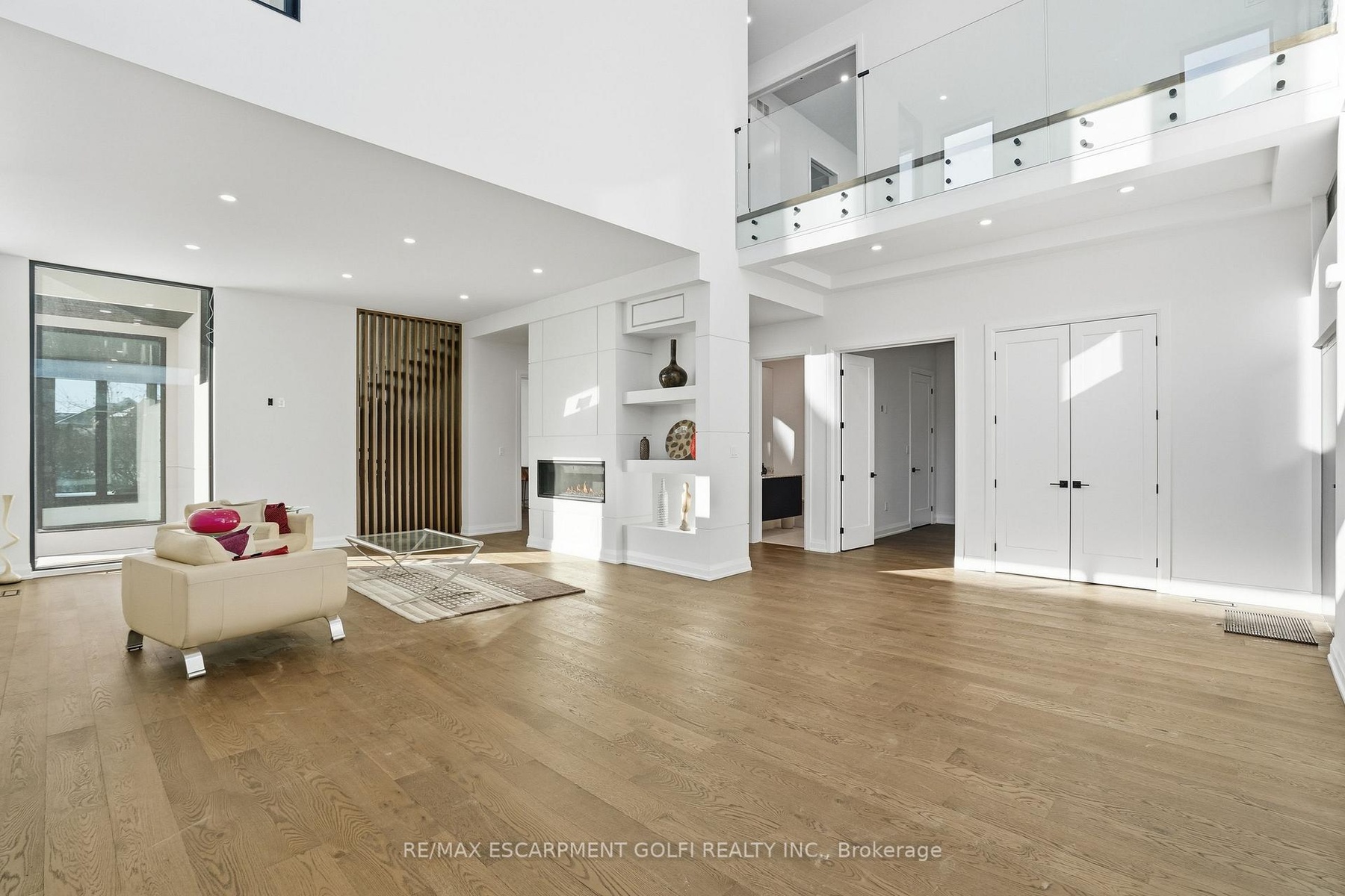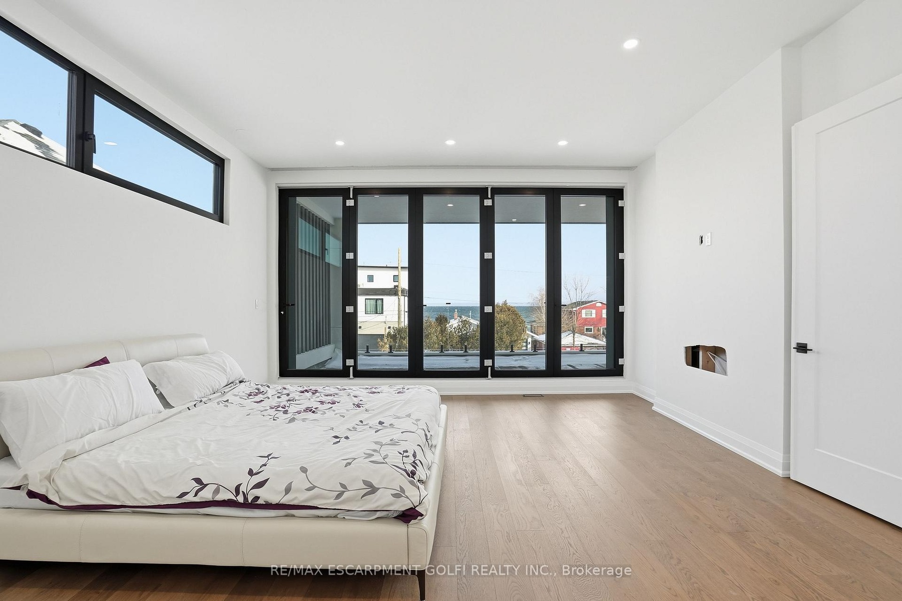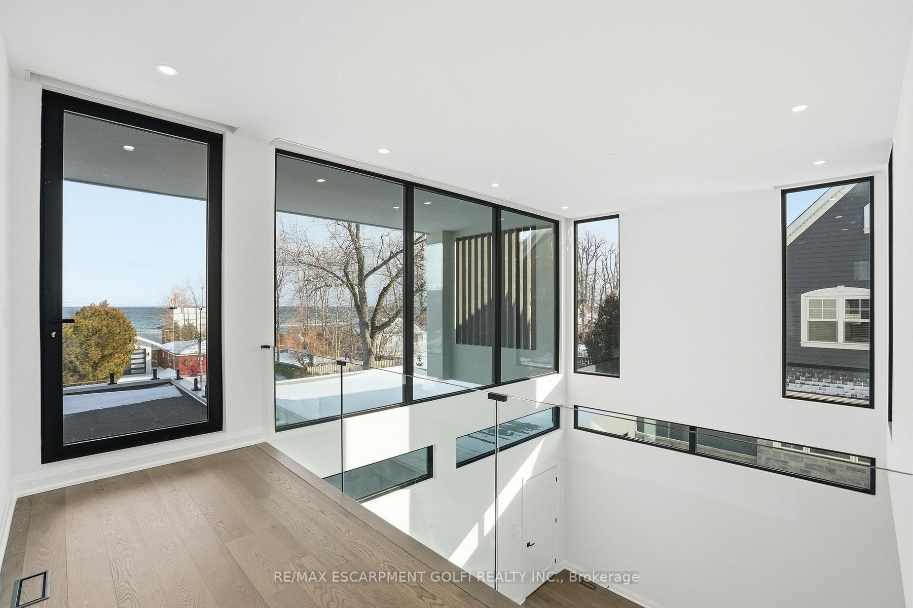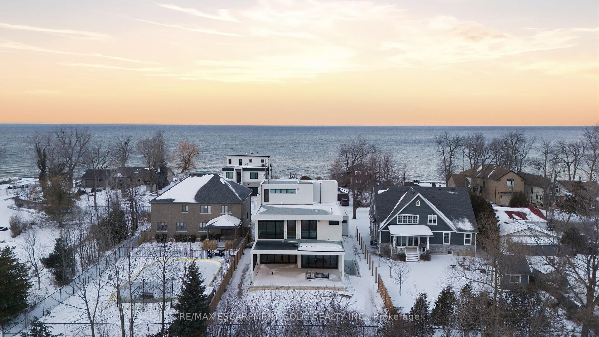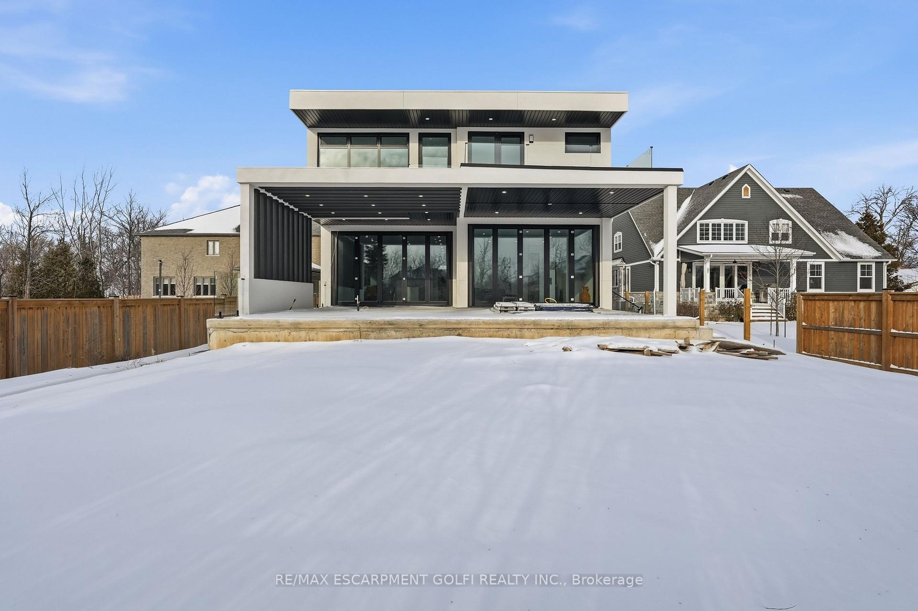 An exceptional newly built residence in Stoney Creek, completed in 2025 and offering nearly 7,500 square feet of refined living space. Designed to maximize natural light, the home features expansive floor to ceiling windows, clean contemporary lines, and elevated finishes throughout. A private elevator provides seamless access to all levels. The main floor opens into a dramatic two storey living room and flows into a statement chef's kitchen with waterfall island and fully equipped prep kitchen. Dining and family rooms are framed by floor to ceiling bifold doors leading to a covered deck and spacious backyard, creating effortless indoor-outdoor living. A private office and powder room complete the level. Upstairs, four bedrooms each offer private ensuites, while the master bedroom features bifold doors to a covered balcony with lake views, a generous walk-in closet, and a spa inspired bath with soaker tub. The third level includes a kitchenette and rooftop terrace with uninterrupted Lake Ontario views. The bright basement offers a large rec room with full glass walkout, two bedrooms with shared ensuite, private office, and additional powder room. A rare opportunity for contemporary luxury in a premier lake oriented community.