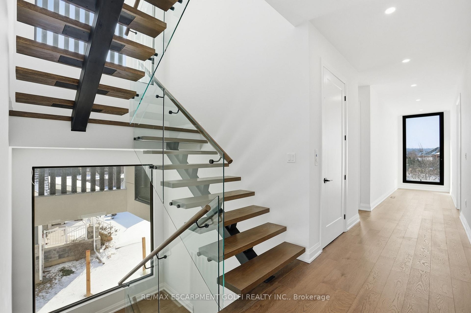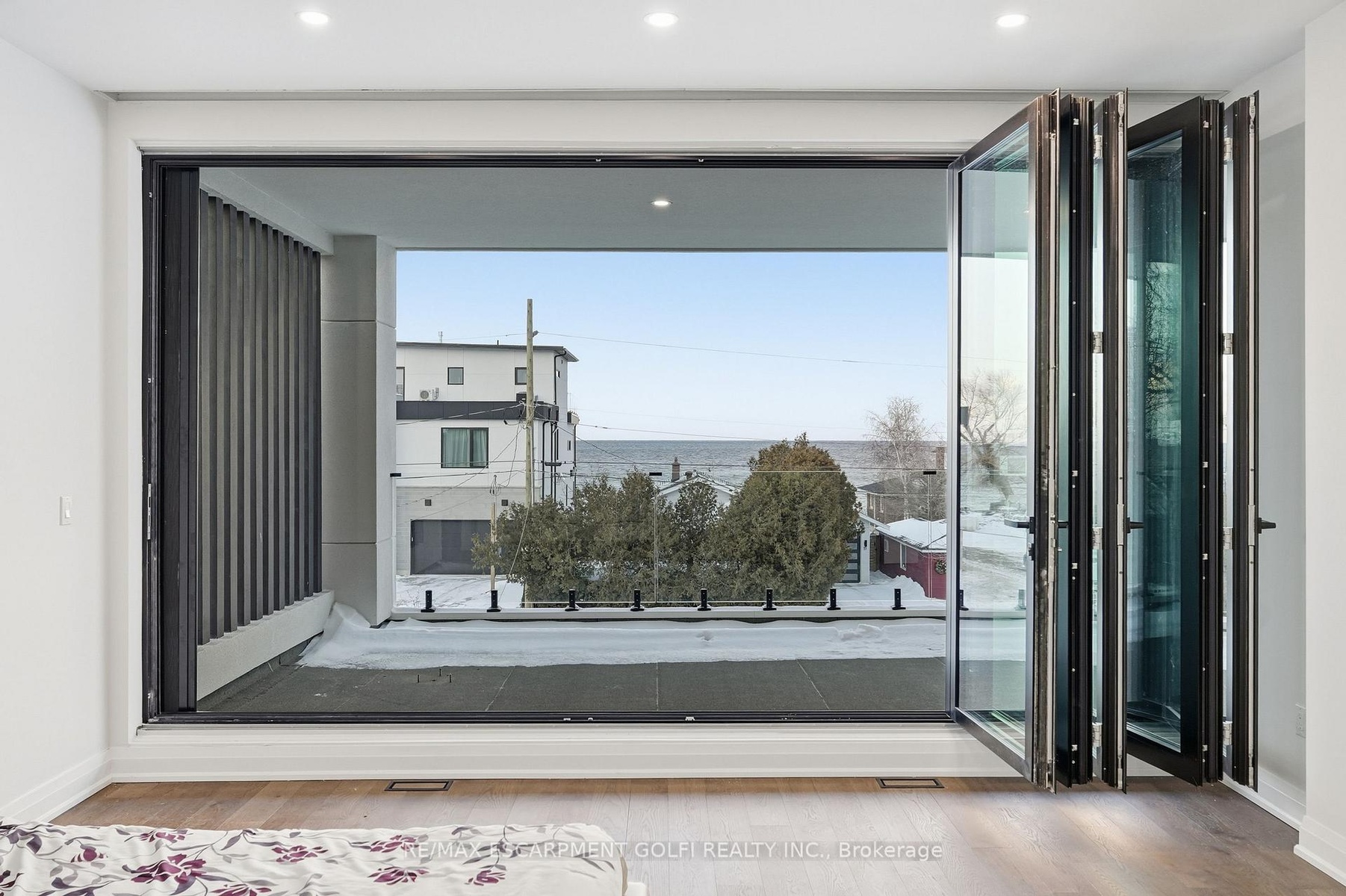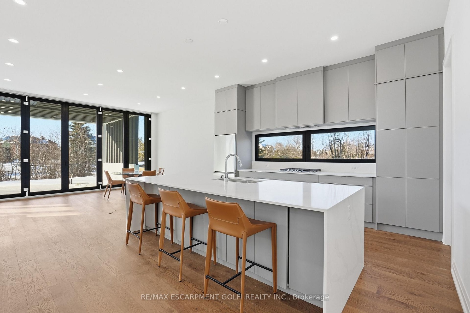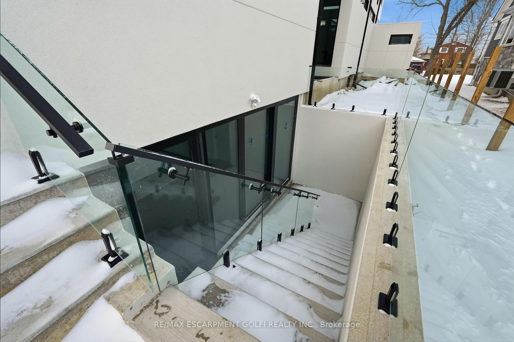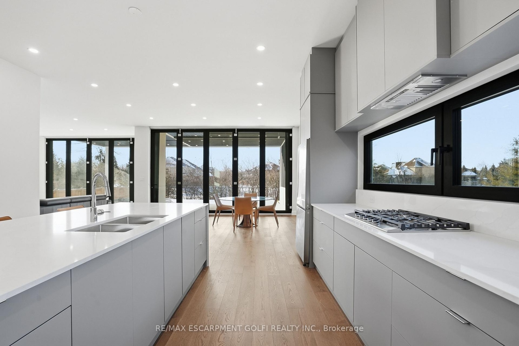 An exceptional newly built residence in Stoney Creek, completed in 2025 and offering nearly 7,500 square feet of refined living space. Designed to maximize natural light, the home features expansive floor to ceiling windows, clean contemporary lines, and elevated finishes throughout. A private elevator provides seamless access to all levels. The main floor opens into a dramatic two storey living room and flows into a statement chef's kitchen with waterfall island and fully equipped prep kitchen. Dining and family rooms are framed by floor to ceiling bifold doors leading to a covered deck and spacious backyard, creating effortless indoor-outdoor living. A private office and powder room complete the level. Upstairs, four bedrooms each offer private ensuites, while the master bedroom features bifold doors to a covered balcony with lake views, a generous walk-in closet, and a spa inspired bath with soaker tub. The third level includes a kitchenette and rooftop terrace with uninterrupted Lake Ontario views. The bright basement offers a large rec room with full glass walkout, two bedrooms with shared ensuite, private office, and additional powder room. A rare opportunity for contemporary luxury in a premier lake oriented community.