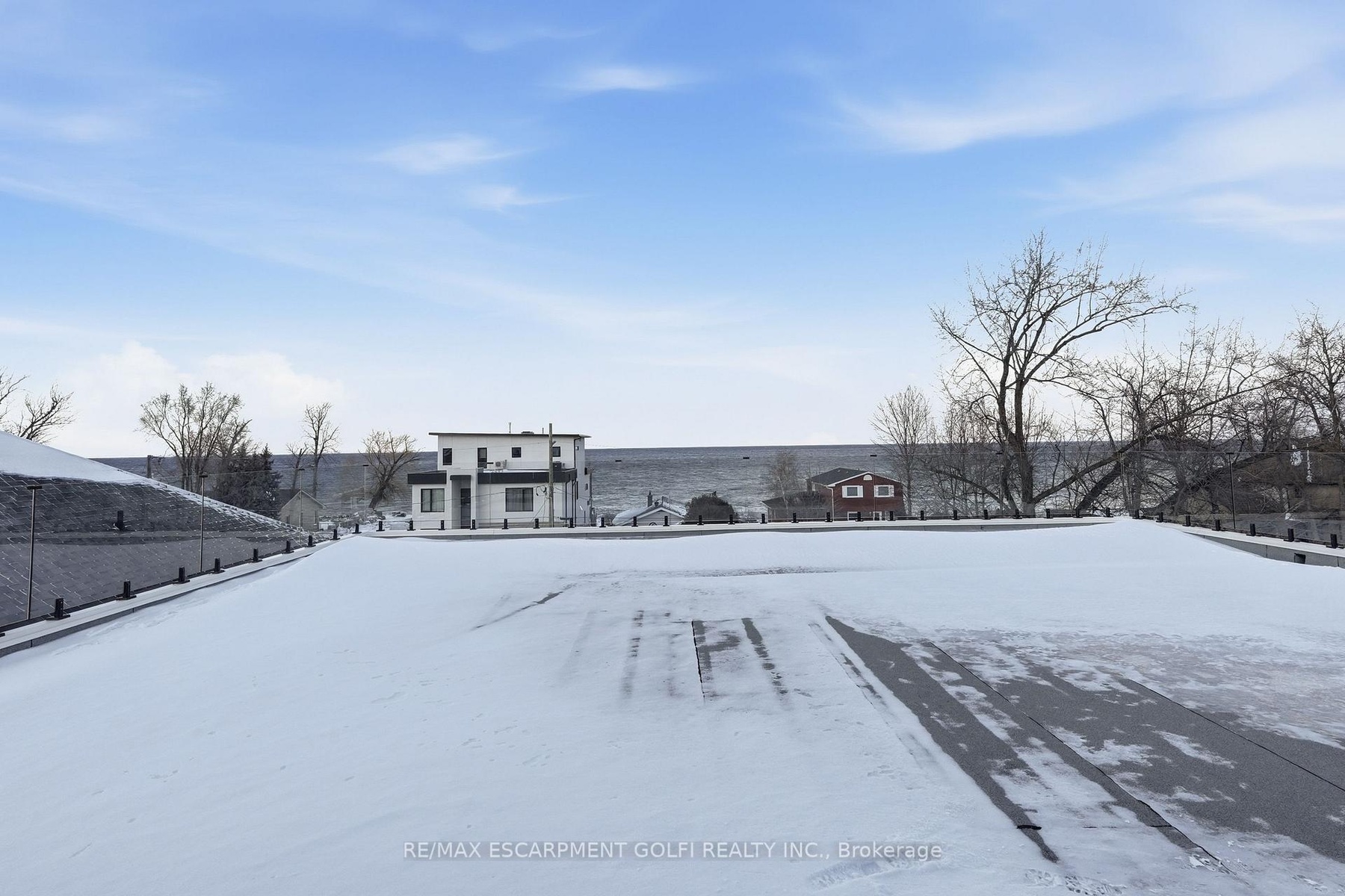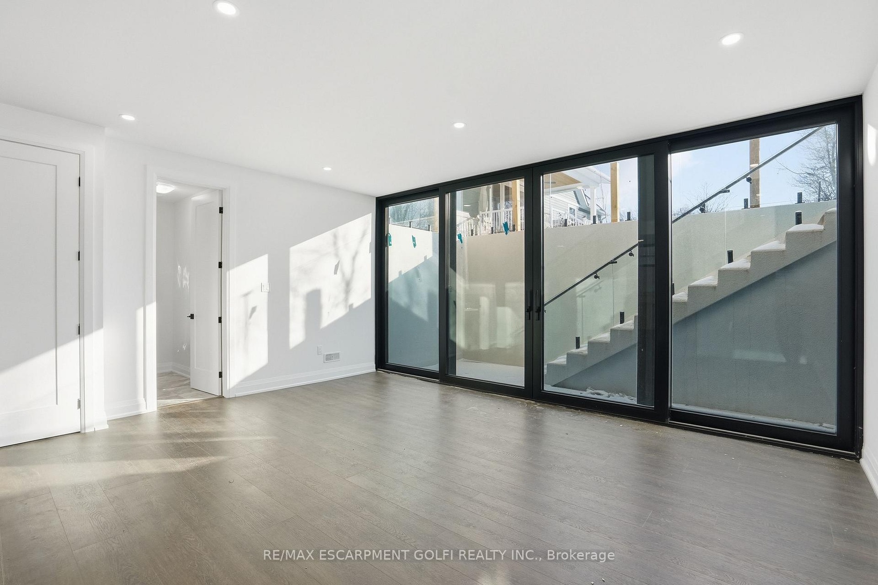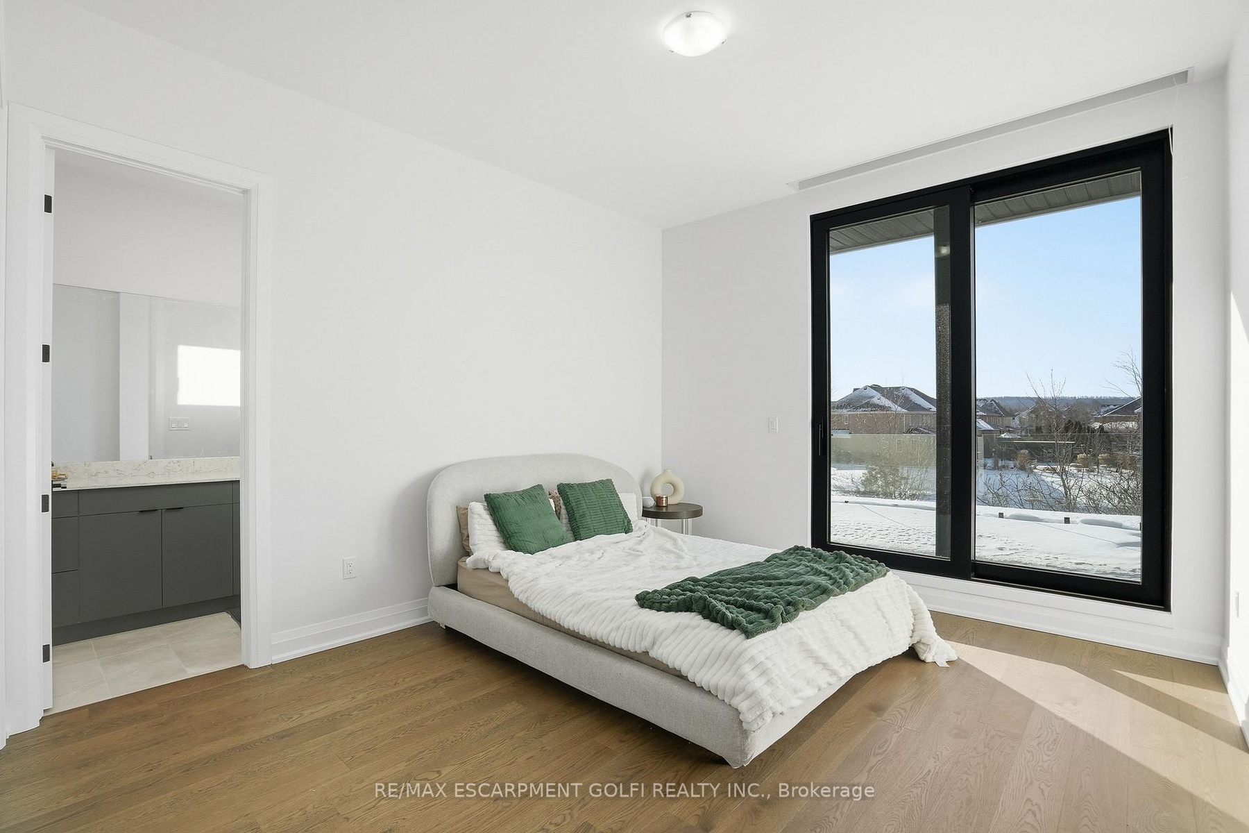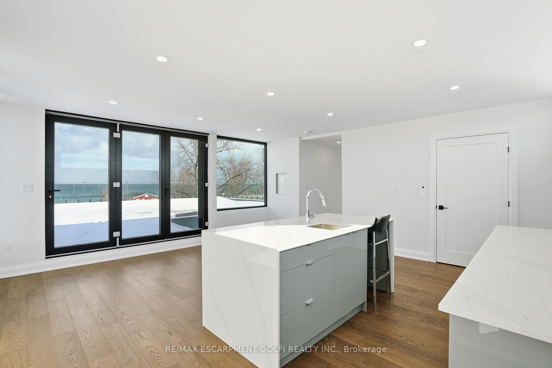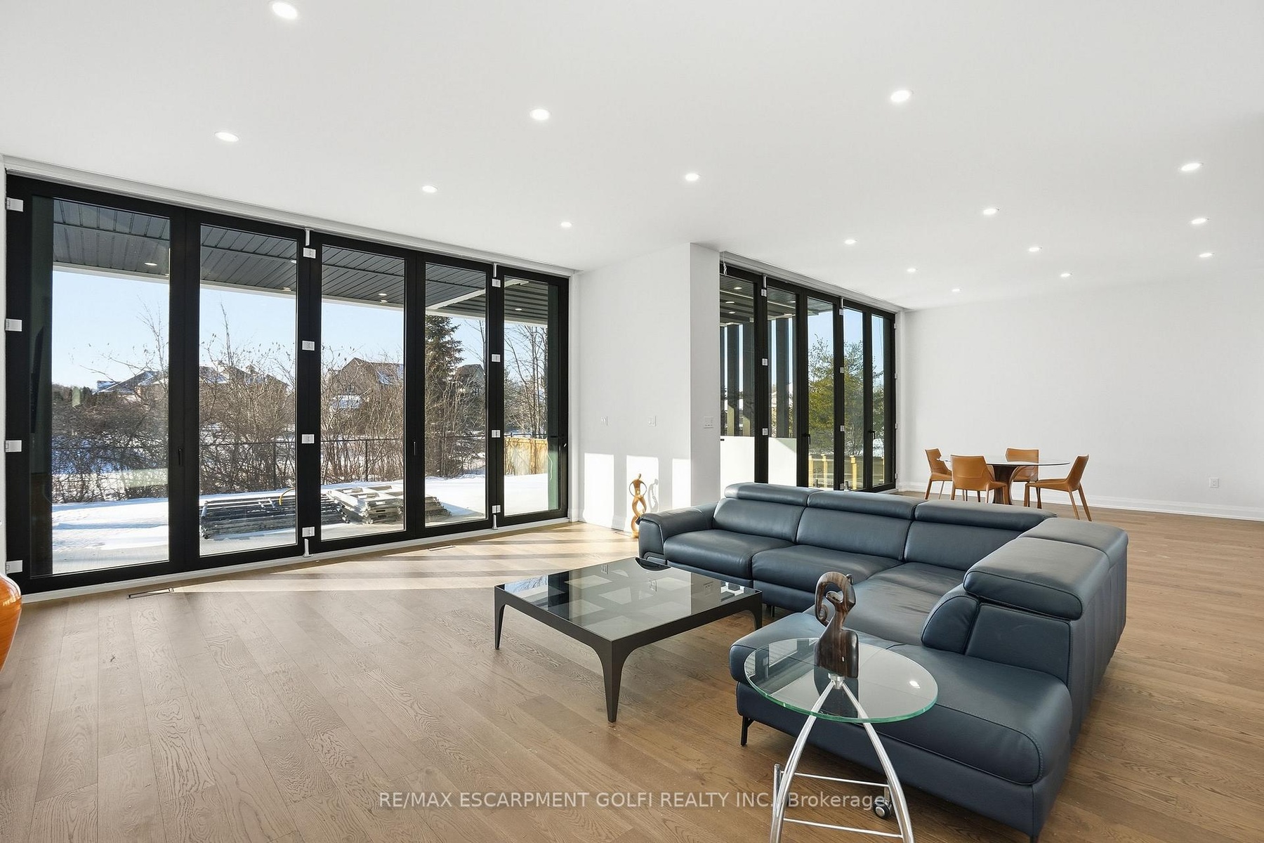An exceptional newly built residence in Stoney Creek, completed in 2025 and offering nearly 7,500 square feet of refined living space. Designed to maximize natural light, the home features expansive floor to ceiling windows, clean contemporary lines, and elevated finishes throughout. A private elevator provides seamless access to all levels. The main floor opens into a dramatic two storey living room and flows into a statement chef's kitchen with waterfall island and fully equipped prep kitchen. Dining and family rooms are framed by floor to ceiling bifold doors leading to a covered deck and spacious backyard, creating effortless indoor-outdoor living. A private office and powder room complete the level. Upstairs, four bedrooms each offer private ensuites, while the master bedroom features bifold doors to a covered balcony with lake views, a generous walk-in closet, and a spa inspired bath with soaker tub. The third level includes a kitchenette and rooftop terrace with uninterrupted Lake Ontario views. The bright basement offers a large rec room with full glass walkout, two bedrooms with shared ensuite, private office, and additional powder room. A rare opportunity for contemporary luxury in a premier lake oriented community.