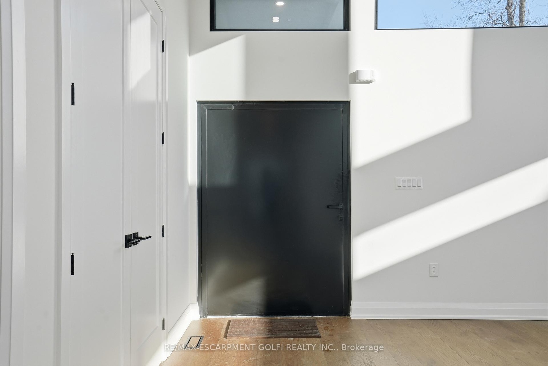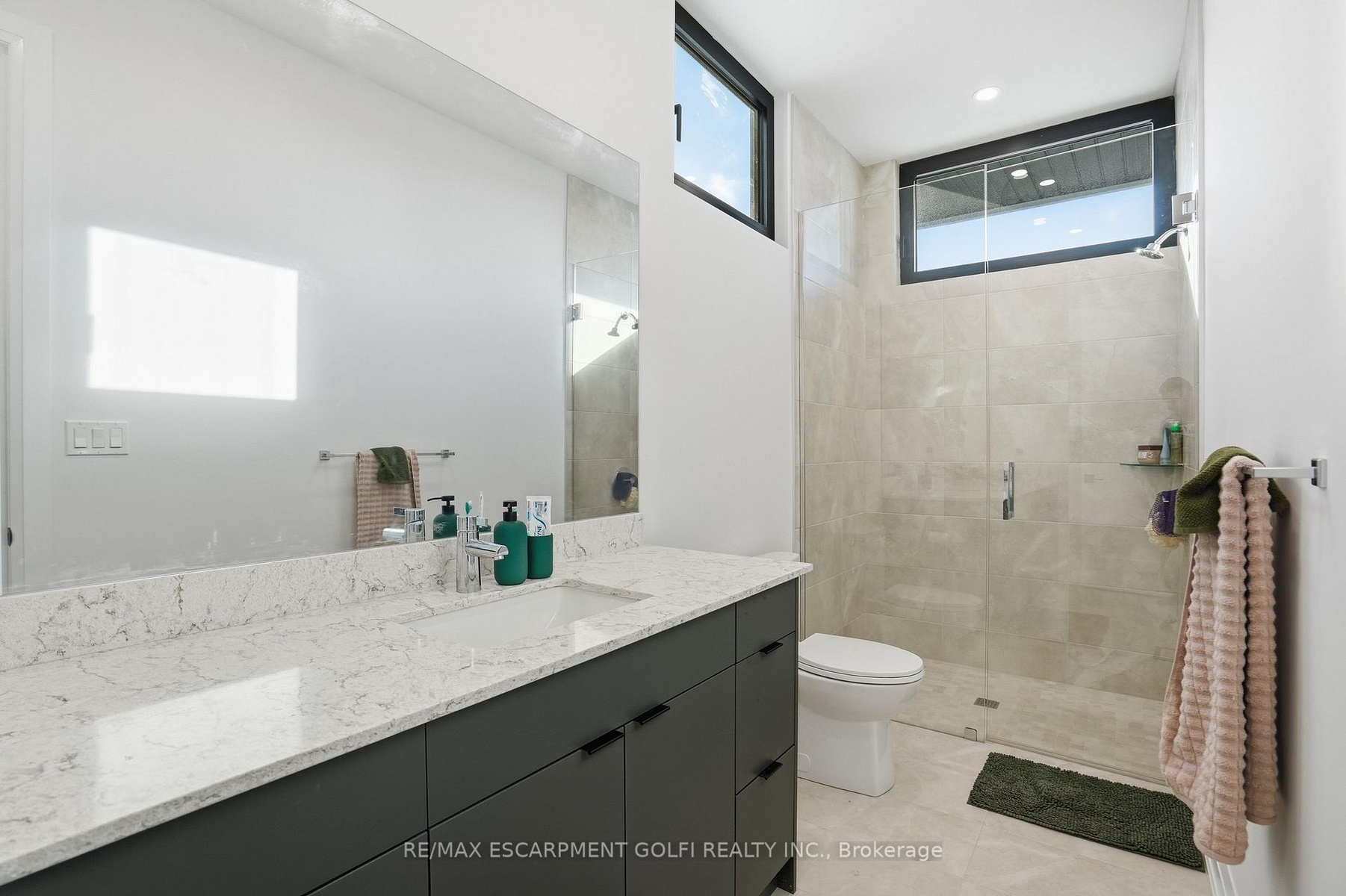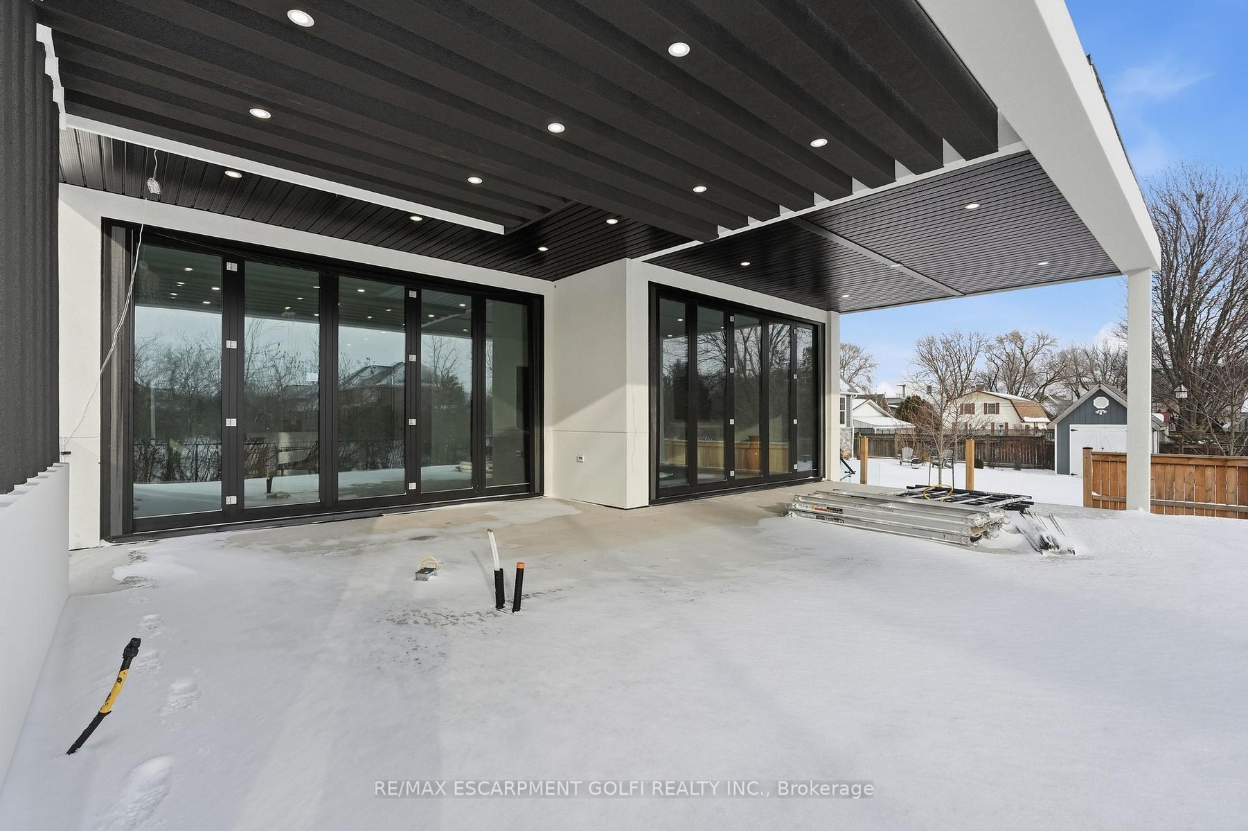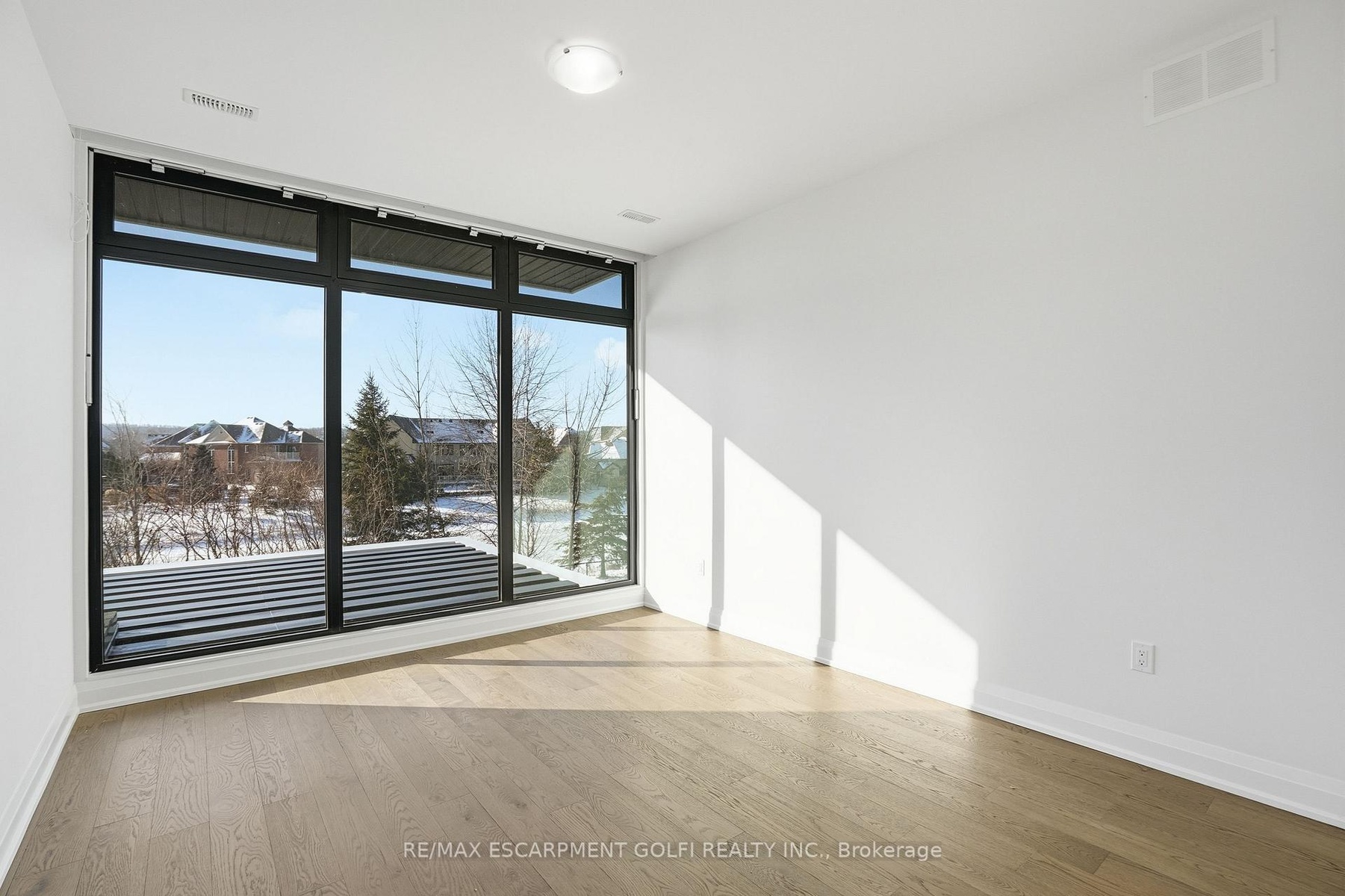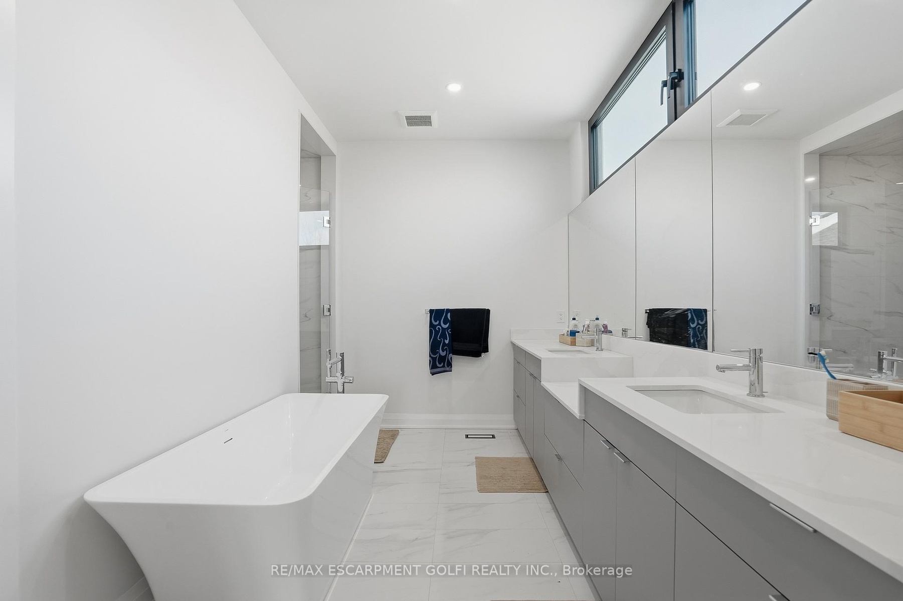 An exceptional newly built residence in Stoney Creek, completed in 2025 and offering nearly 7,500 square feet of refined living space. Designed to maximize natural light, the home features expansive floor to ceiling windows, clean contemporary lines, and elevated finishes throughout. A private elevator provides seamless access to all levels. The main floor opens into a dramatic two storey living room and flows into a statement chef's kitchen with waterfall island and fully equipped prep kitchen. Dining and family rooms are framed by floor to ceiling bifold doors leading to a covered deck and spacious backyard, creating effortless indoor-outdoor living. A private office and powder room complete the level. Upstairs, four bedrooms each offer private ensuites, while the master bedroom features bifold doors to a covered balcony with lake views, a generous walk-in closet, and a spa inspired bath with soaker tub. The third level includes a kitchenette and rooftop terrace with uninterrupted Lake Ontario views. The bright basement offers a large rec room with full glass walkout, two bedrooms with shared ensuite, private office, and additional powder room. A rare opportunity for contemporary luxury in a premier lake oriented community.