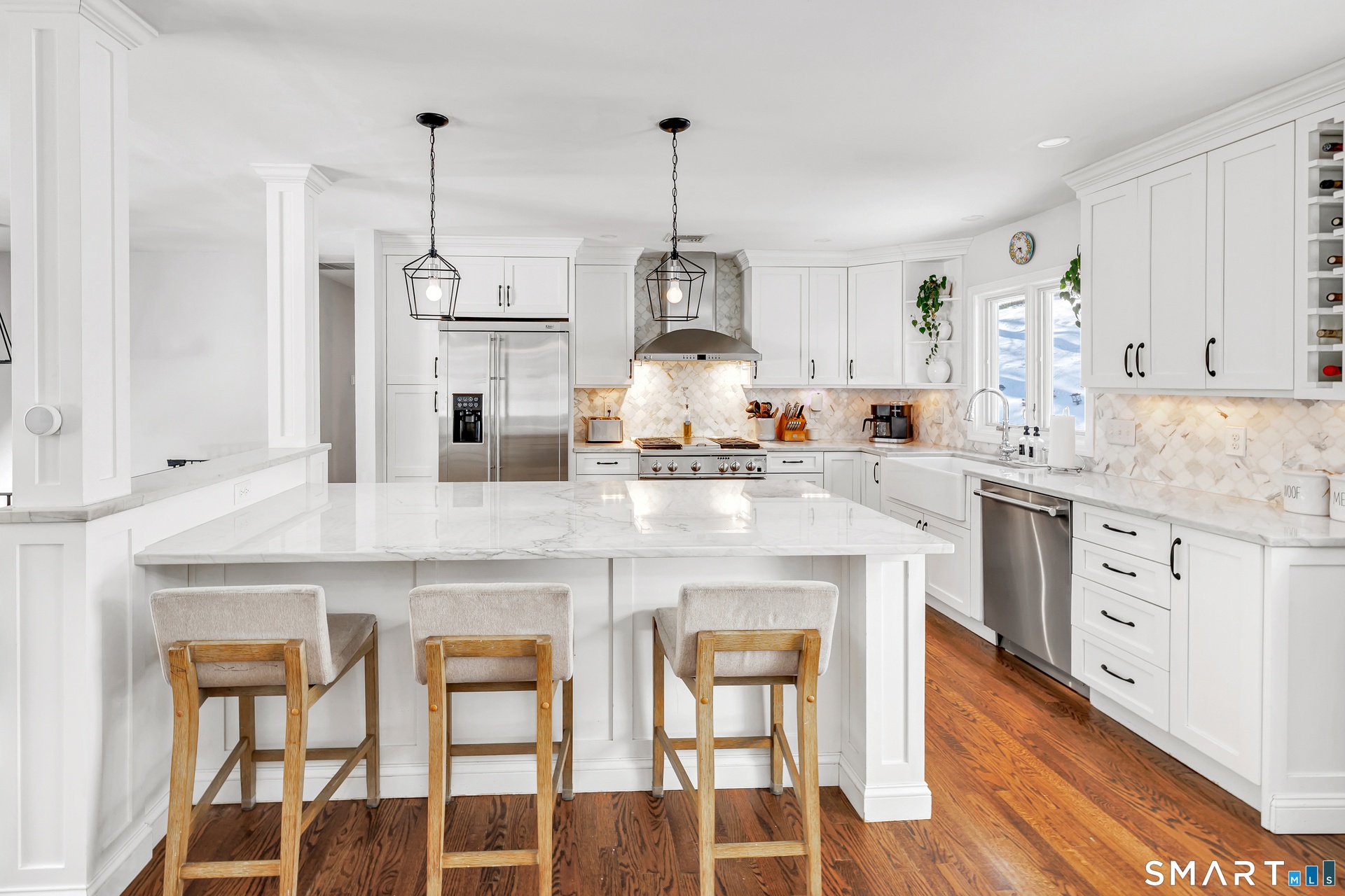 The main level features a bright, open floor plan centered around an updated kitchen with a quartzite island, Calacatta marble backsplash, farmhouse sink, custom-built-in wine rack, and a new dishwasher. Newly sanded and stained hardwood floors continue through the main living areas and bedrooms. Large windows overlook mature trees, stone walls, and a creek with waterfall views.