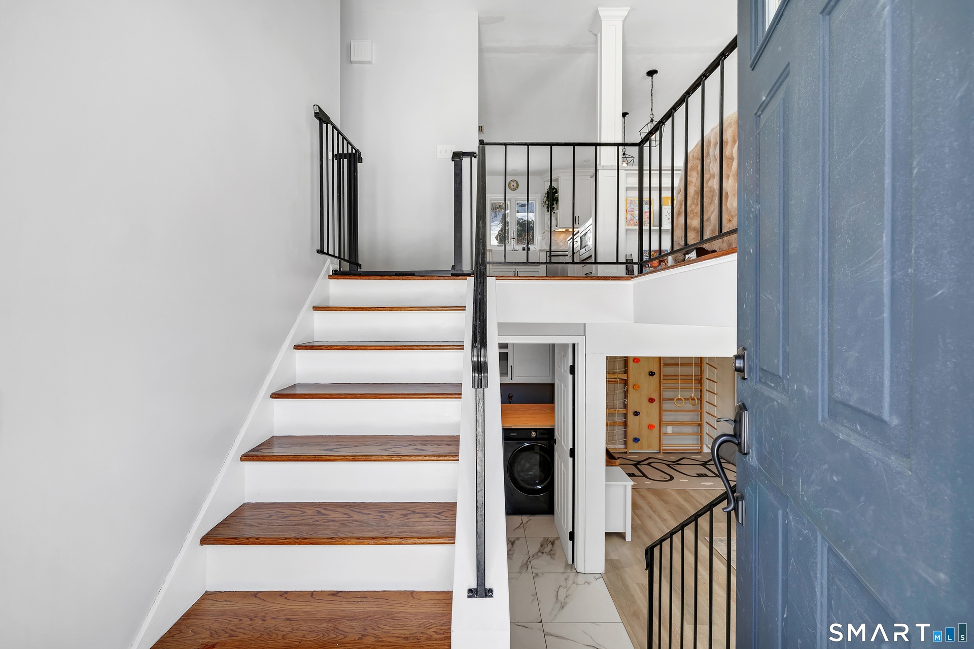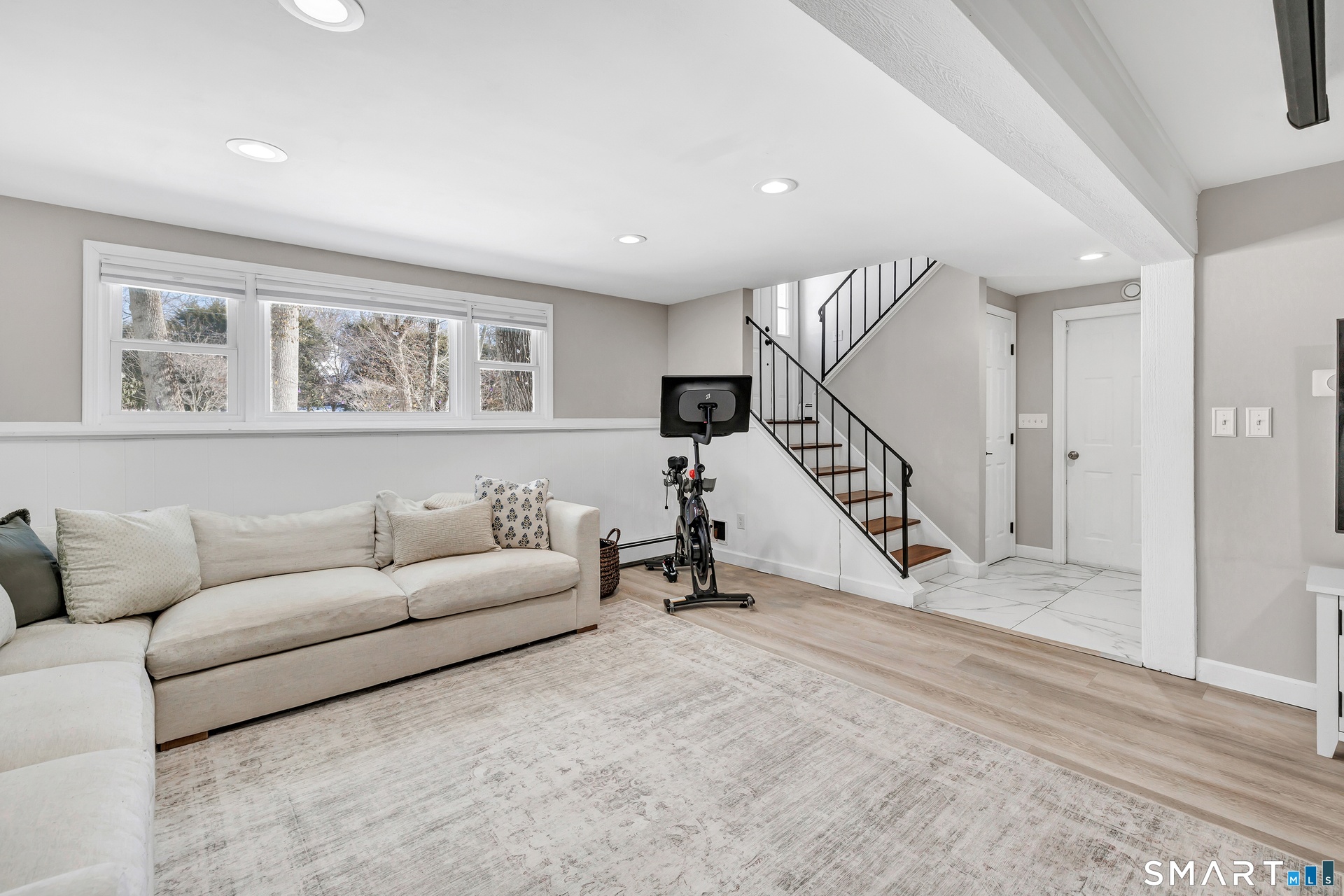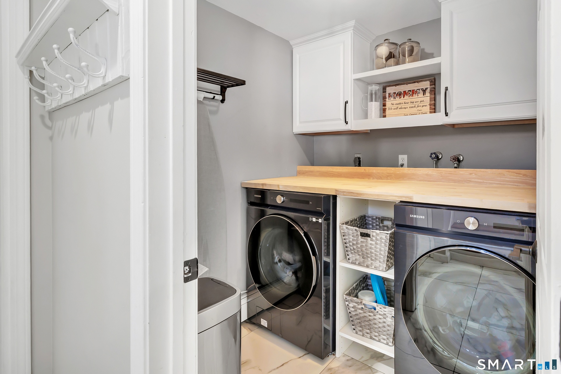 From the kitchen, step out to the deck and private backyard with a custom pergola, well-suited for outdoor dining or everyday relaxing. The finished lower level adds flexible space with new premium Italian luxury vinyl flooring and a fireplace, ideal for a media room, recreation space, or home office. Custom laundry cabinetry with a butcher block counter and a new smart washer and dryer complete the lower level.