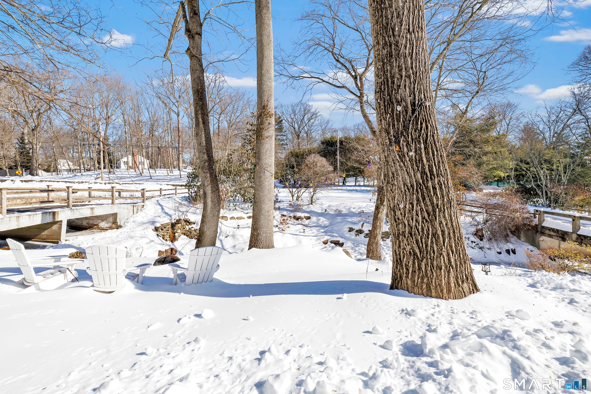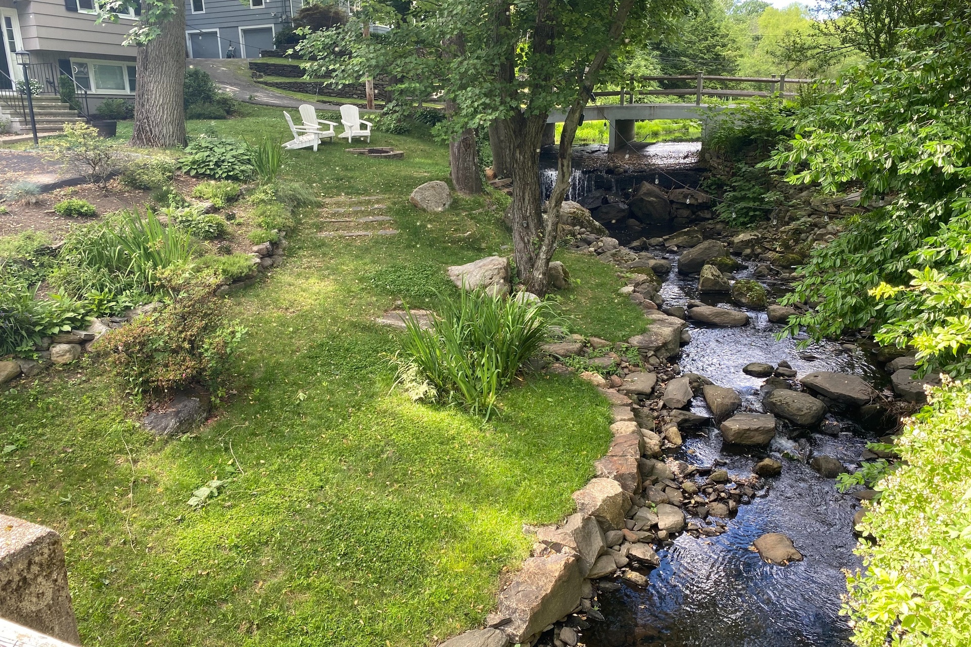 Recent mechanical and infrastructure updates include a high-efficiency boiler and water tank, updated piping, a zone system, and upgraded 200-amp electrical service with a generator hookup. Exterior improvements include a newly paved Belgian-block driveway, freshly painted cedar-shake exterior, an extended backyard with boulder walls, stone steps leading to the creek and waterfall, a storage shed, and professionally designed landscaping.