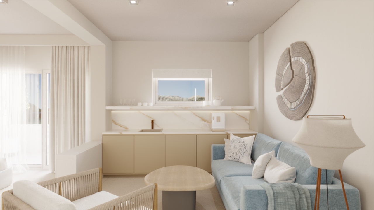 These luxury holiday apartments finished to an exceptional standard, featuring elegant communal areas with ambient lighting, high-tech hydraulic lift and excellent security including video entry, CCTV and alarm pre-installation. Interiors feature polished plaster walls, eco-friendly finishes, large format tiling and energy efficient double-glazed aluminium windows with a bioclimatic façade.