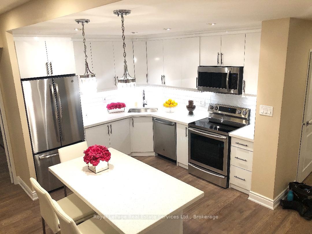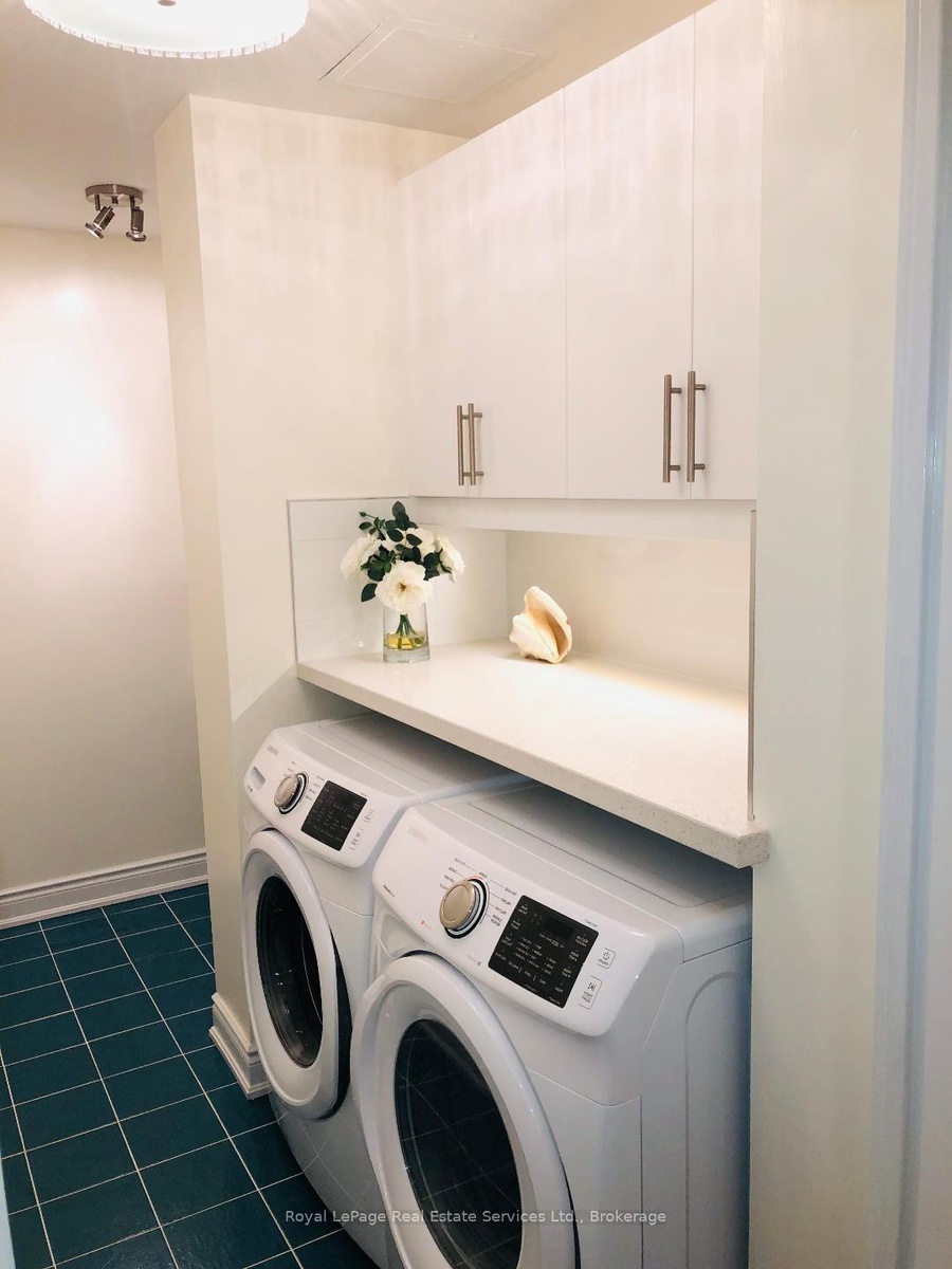 Welcome to refined, effortless living in the heart of prestigious Bronte - just steps from Lake Ontario, waterfront trails, boutique shops, restaurants, parks, and top-rated schools.This fully renovated executive condo offers approximately 1,300 square feet of elegant, open-concept space, designed for both comfort and style.From the moment you walk in, you're greeted by stunning views of lush greenery and manicured grounds, filling the oversized living and dining area with natural light.The custom designer kitchen features premium finishes, thoughtful storage, and a layout that's perfect for everyday living or entertaining.The spacious primary suite includes beautifully built-in cabinetry, while the second bedroom offers flexibility for guests, a home office, or family. You'll also love the rare, oversized laundry room with extensive custom storage.The spa-inspired main bathroom brings a true sense of luxury, and custom velvet drapery throughout adds warmth and sophistication.Located on the main floor, this unit offers exceptional convenience - no stairs, no elevator - making it ideal for executive couples, downsizers, or anyone seeking easy, turnkey living.All within a quiet, impeccably managed building in one of the most desirable lakeside communities.This is a rare opportunity to own a fully renovated, move-in-ready home in an unbeatable location.To book your private showing, contact Robert Wodz at 905-334-8040
