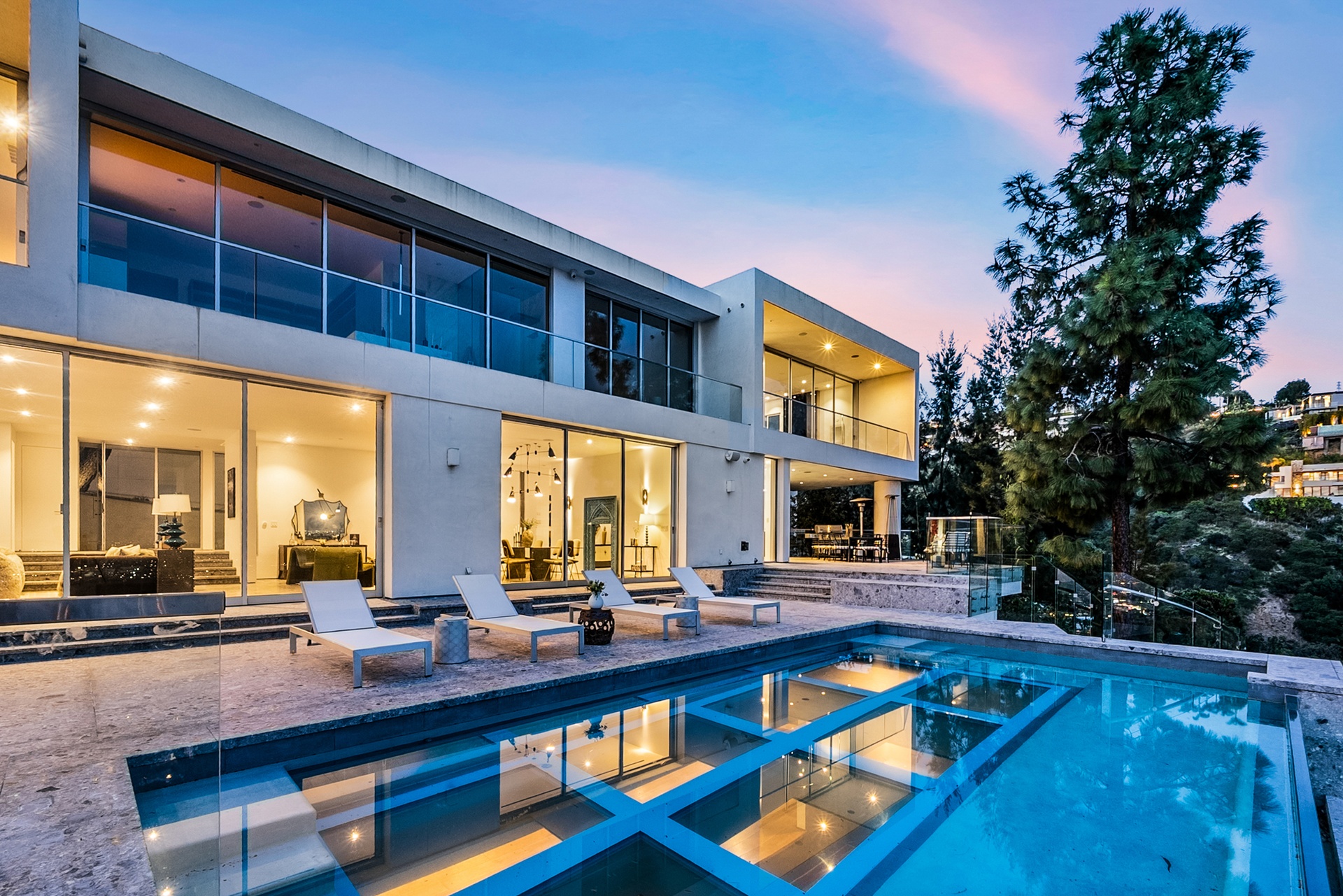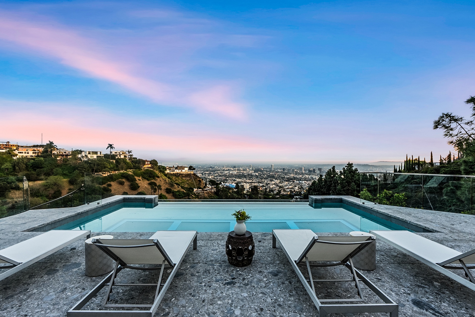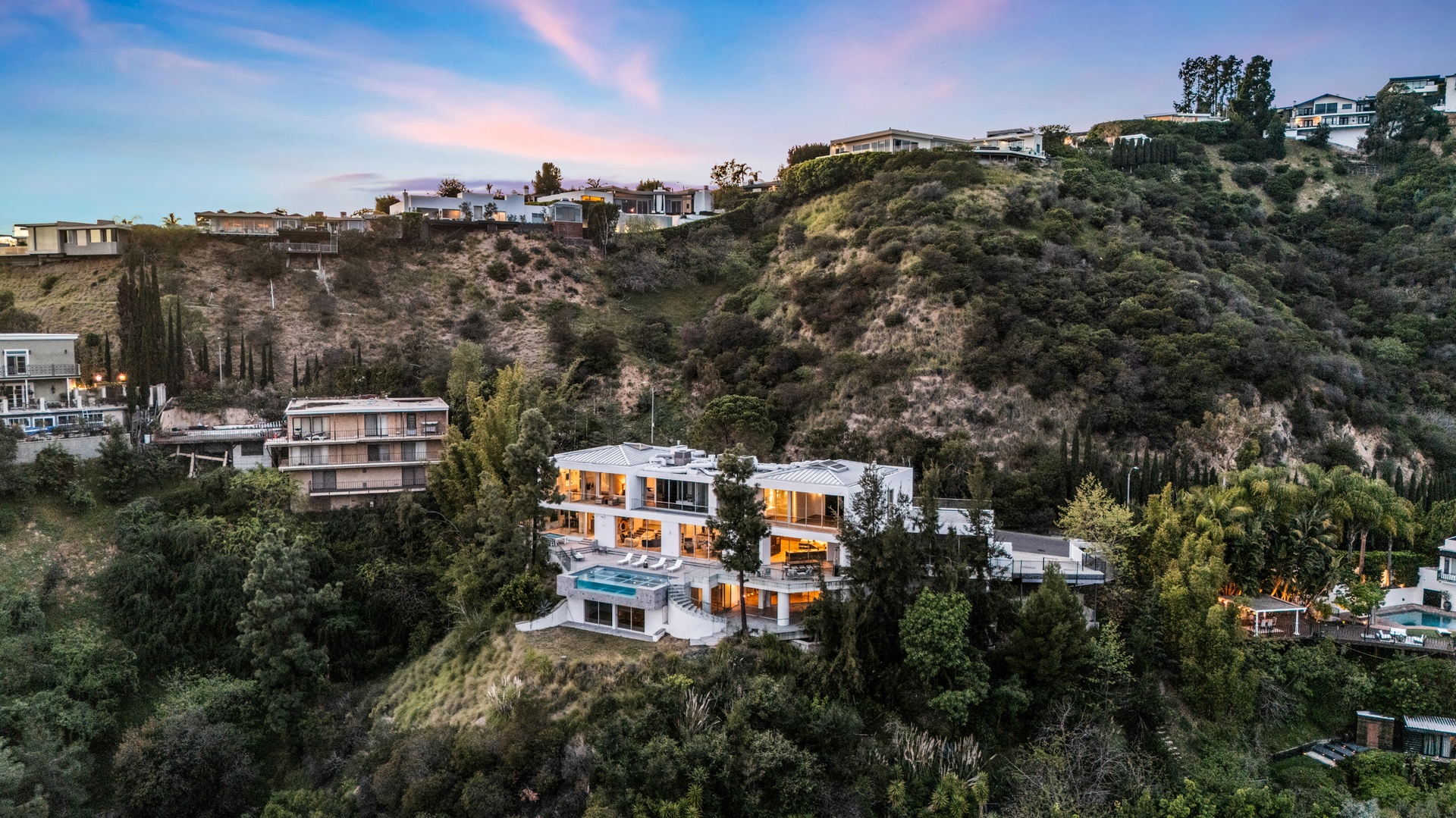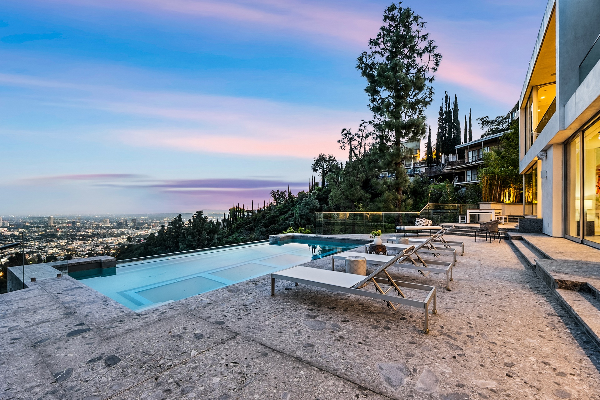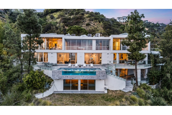Perched above the iconic Sunset Strip in the prestigious Bird Streets, 8854 Thrasher Avenue is a private Hollywood Hills retreat offering sweeping jetliner city views and architectural distinction. Designed by Studio Dardo, this approximately 10,000-square-foot residence blends mid-century modern influence with refined contemporary design.The home features 5 bedrooms and 10 bathrooms, thoughtfully designed with soaring gallery walls ideal for displaying a significant art collection. Warm wood and natural stone finishes complement expansive living spaces, while floor-to-ceiling glass doors open to generous terraces that create seamless indoor-outdoor flow perfect for entertaining and everyday living. The over half-acre lot (approximately 26,000+ square feet) provides privacy and scale rarely found in this coveted enclave. A custom glass-enclosed garage serves as a striking architectural centerpiece and collector showcase. Moments from world-class dining, nightlife, and shopping, this exceptional property offers the ultimate balance of privacy, prestige, and convenience in one of Los Angeles' most sought-after neighborhoods.