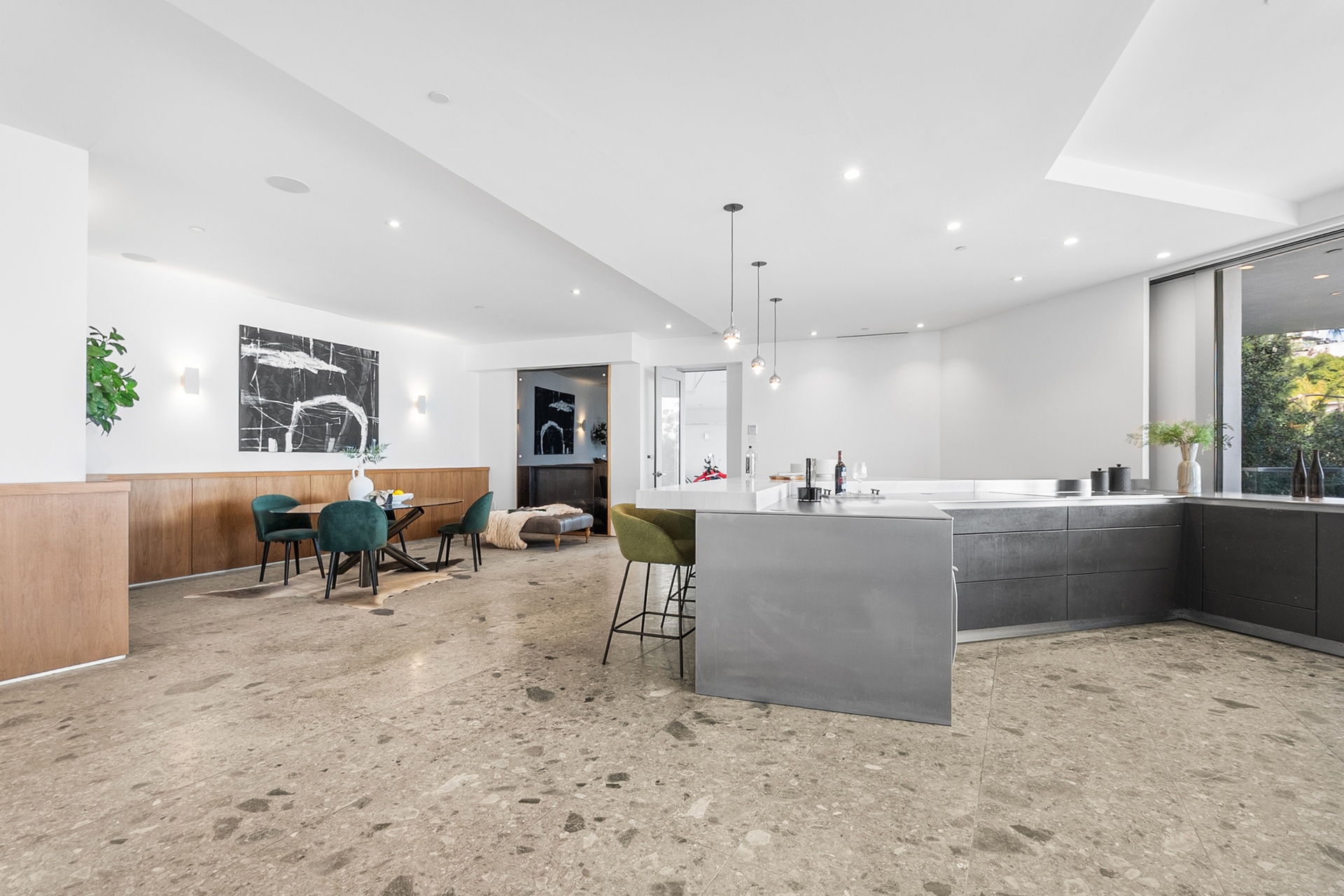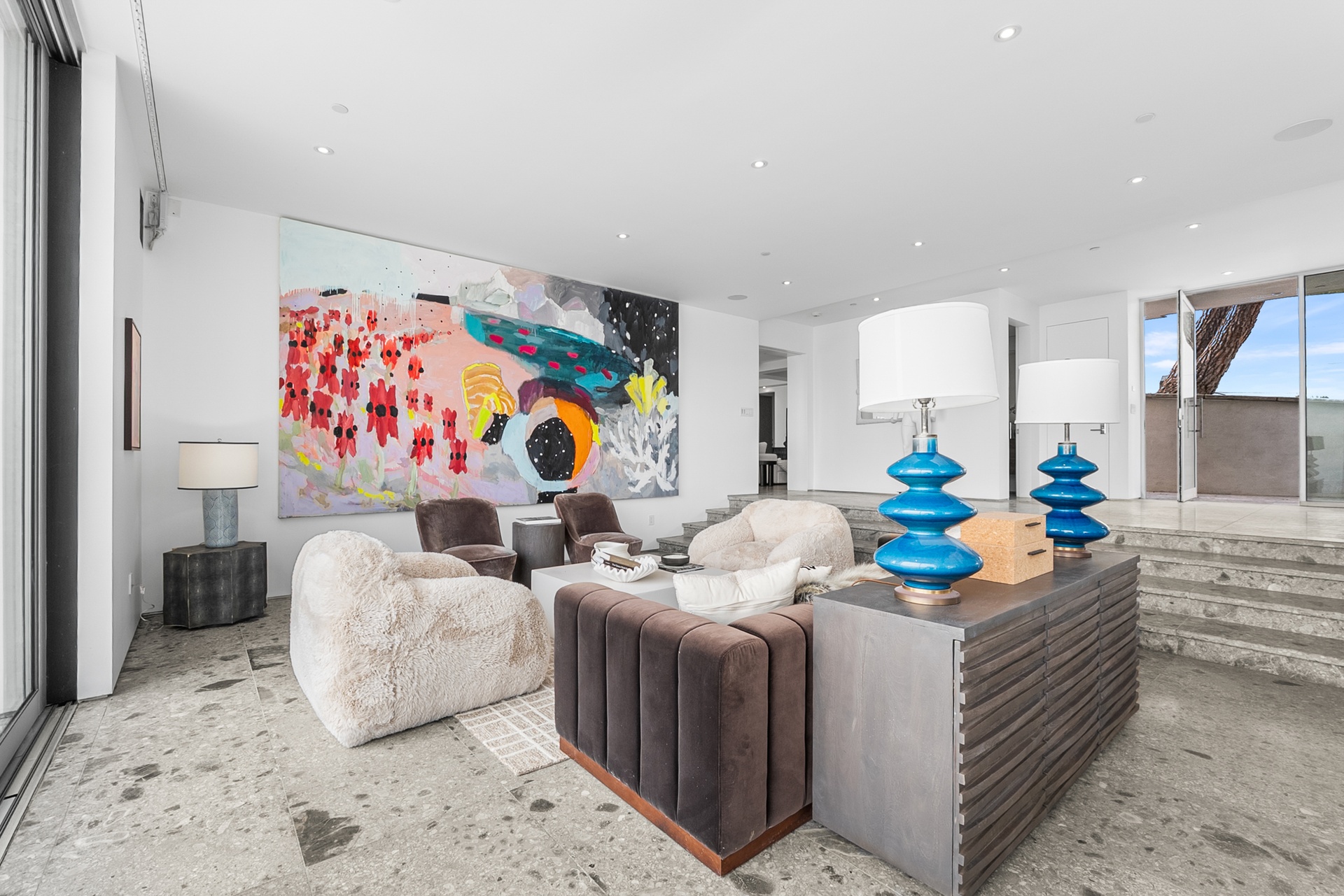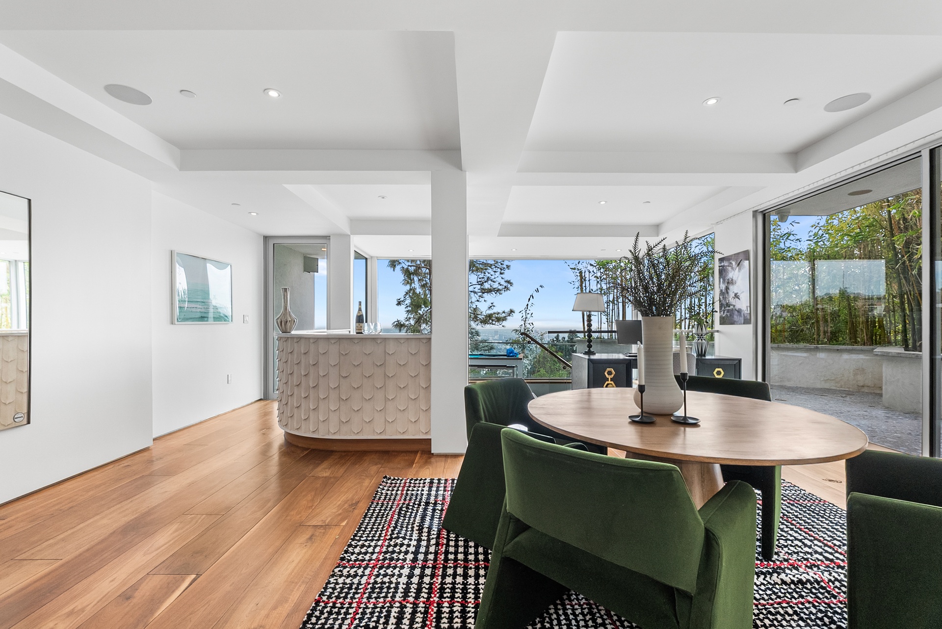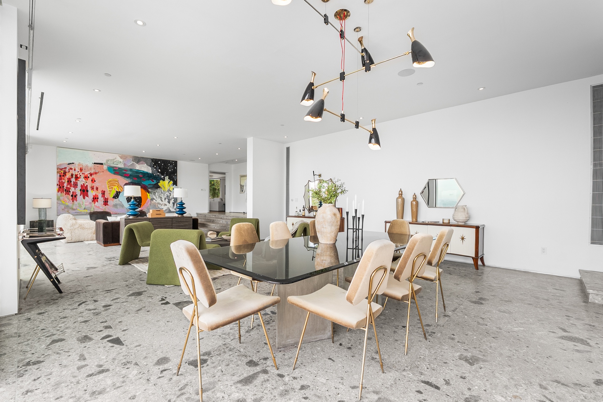 Perched above the iconic Sunset Strip in the prestigious Bird Streets, 8854 Thrasher Avenue is a private Hollywood Hills retreat offering sweeping jetliner city views and architectural distinction. Designed by Studio Dardo, this approximately 10,000-square-foot residence blends mid-century modern influence with refined contemporary design.The home features 5 bedrooms and 10 bathrooms, thoughtfully designed with soaring gallery walls ideal for displaying a significant art collection. Warm wood and natural stone finishes complement expansive living spaces, while floor-to-ceiling glass doors open to generous terraces that create seamless indoor-outdoor flow perfect for entertaining and everyday living. The over half-acre lot (approximately 26,000+ square feet) provides privacy and scale rarely found in this coveted enclave. A custom glass-enclosed garage serves as a striking architectural centerpiece and collector showcase. Moments from world-class dining, nightlife, and shopping, this exceptional property offers the ultimate balance of privacy, prestige, and convenience in one of Los Angeles' most sought-after neighborhoods.
