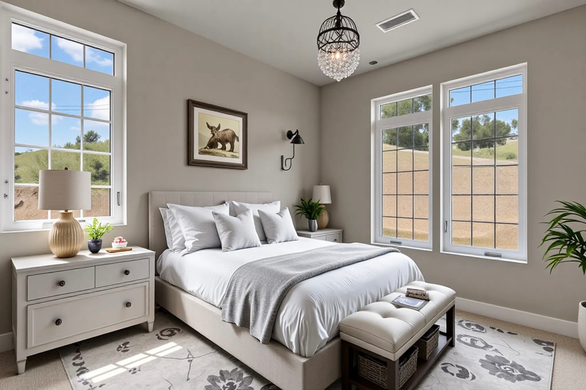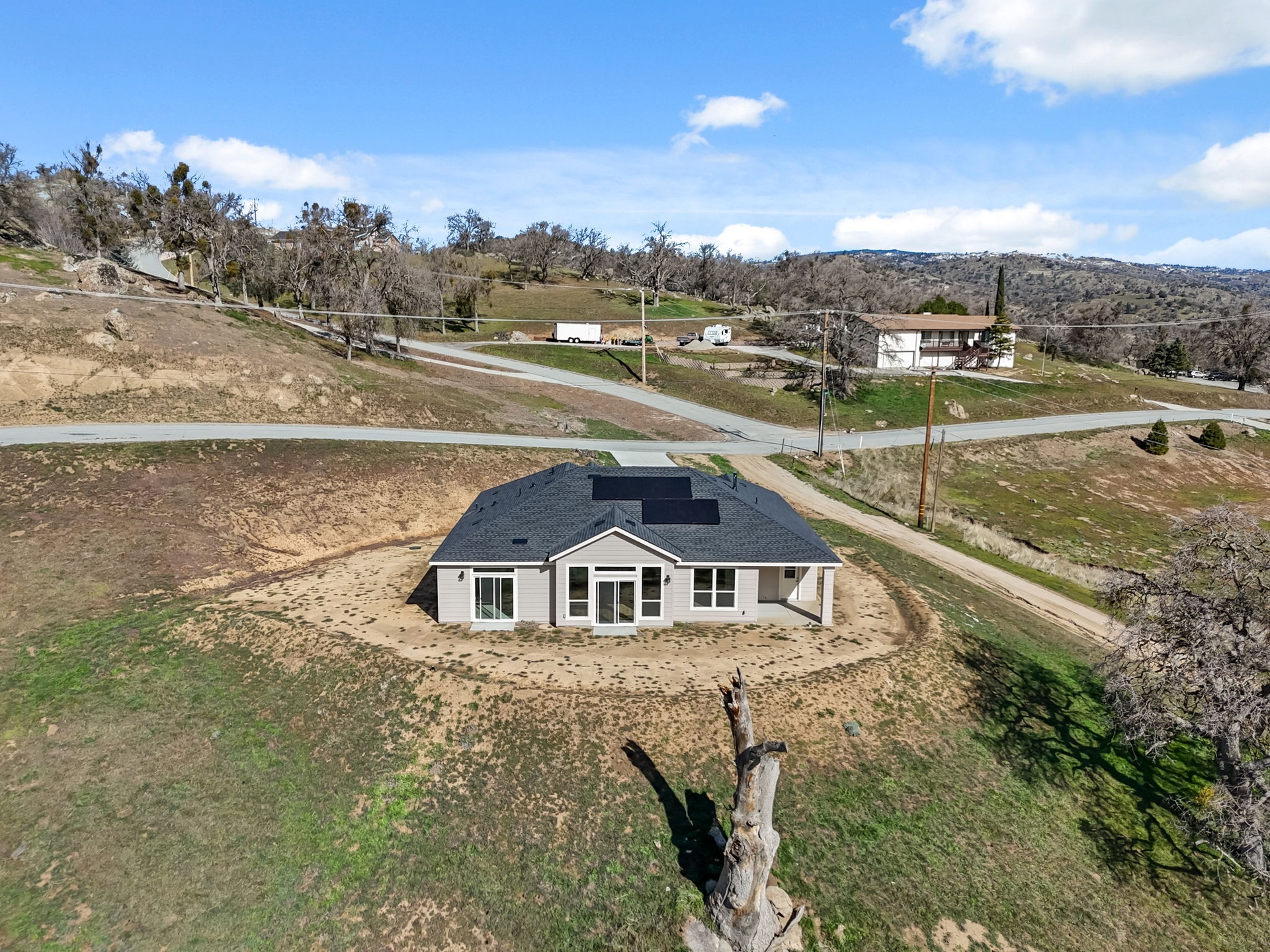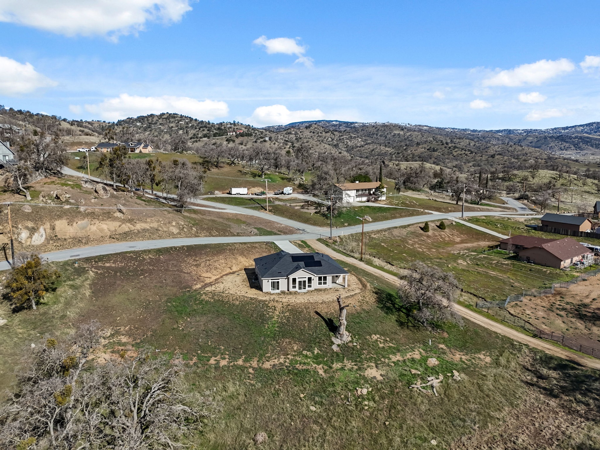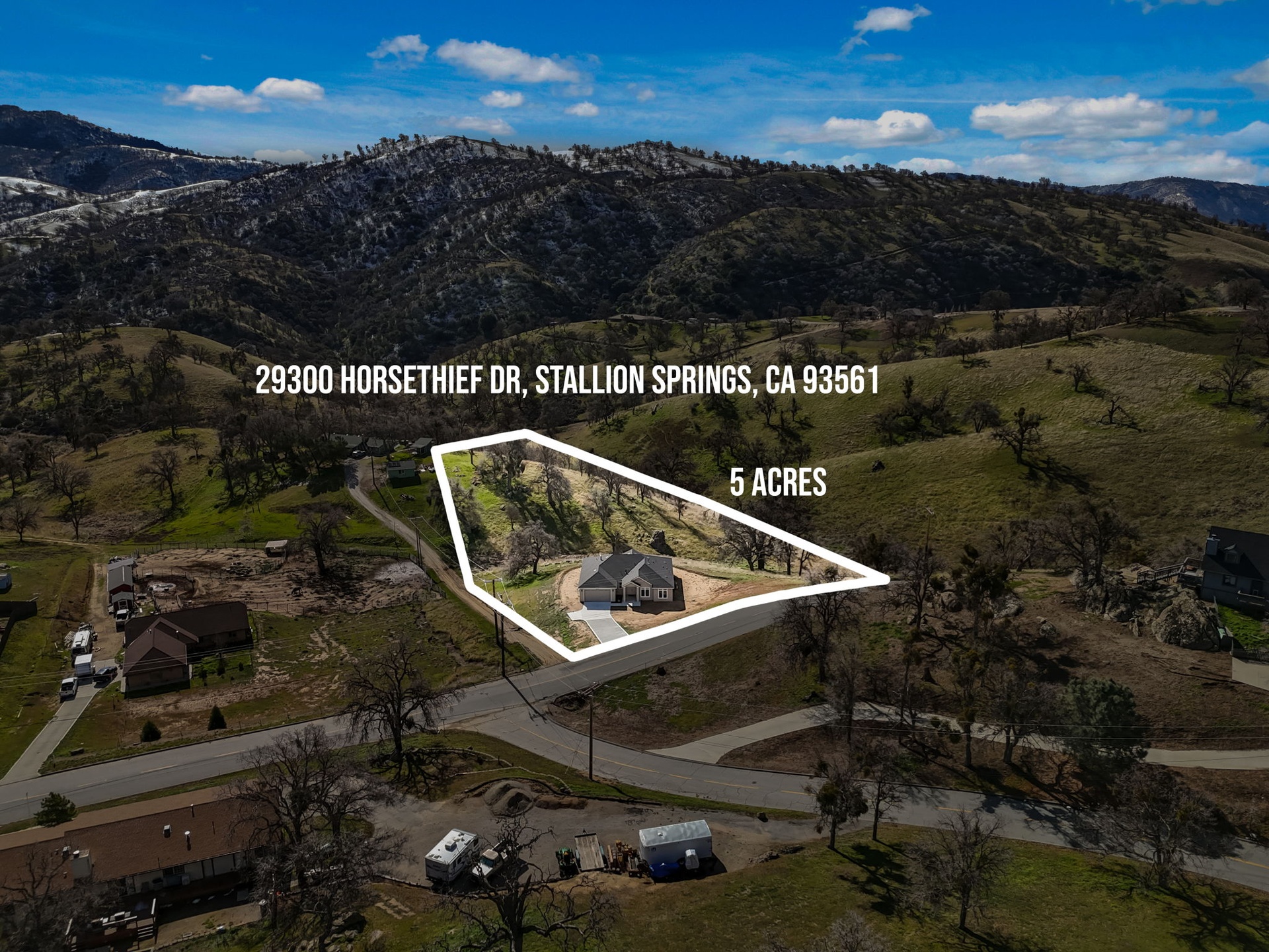 Exceptional brand-new 2026 construction set on approximately 5 acres in the sought-after Stallion Springs community. Built to the latest California Building Code and featuring owned solar, private septic system, and integrated fire alarm and suppression system. Modern design showcases open, bright living spaces with high ceilings and expansive windows framing panoramic mountain and valley views. The open-concept layout is ideal for both entertaining and everyday living. Offering 3 bedrooms and 2 bathrooms, including a spacious primary suite with large bath and walk-in closet. Two additional bedrooms are serviced by a full bathroom. Upgraded finishes throughout provide a clean, contemporary aesthetic. Two-car garage plus approximately 300 sq ft of bonus space perfect for workshop, storage, gym, or private office. With 5 usable acres, there is ample room for outdoor living, recreation, or future possibilities, all surrounded by natural beauty, mature oaks, and local wildlife. Convenient access to Tehachapi shopping, dining, hospital, schools, and Mountain Valley Airport. Centrally located with easy access to Los Angeles, Big Bear, Sequoia National Park, Mammoth Lakes, and Las Vegas.