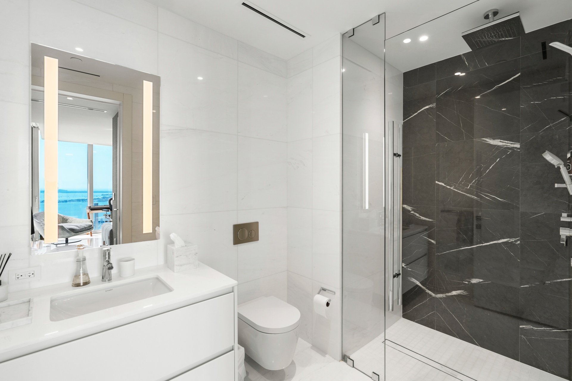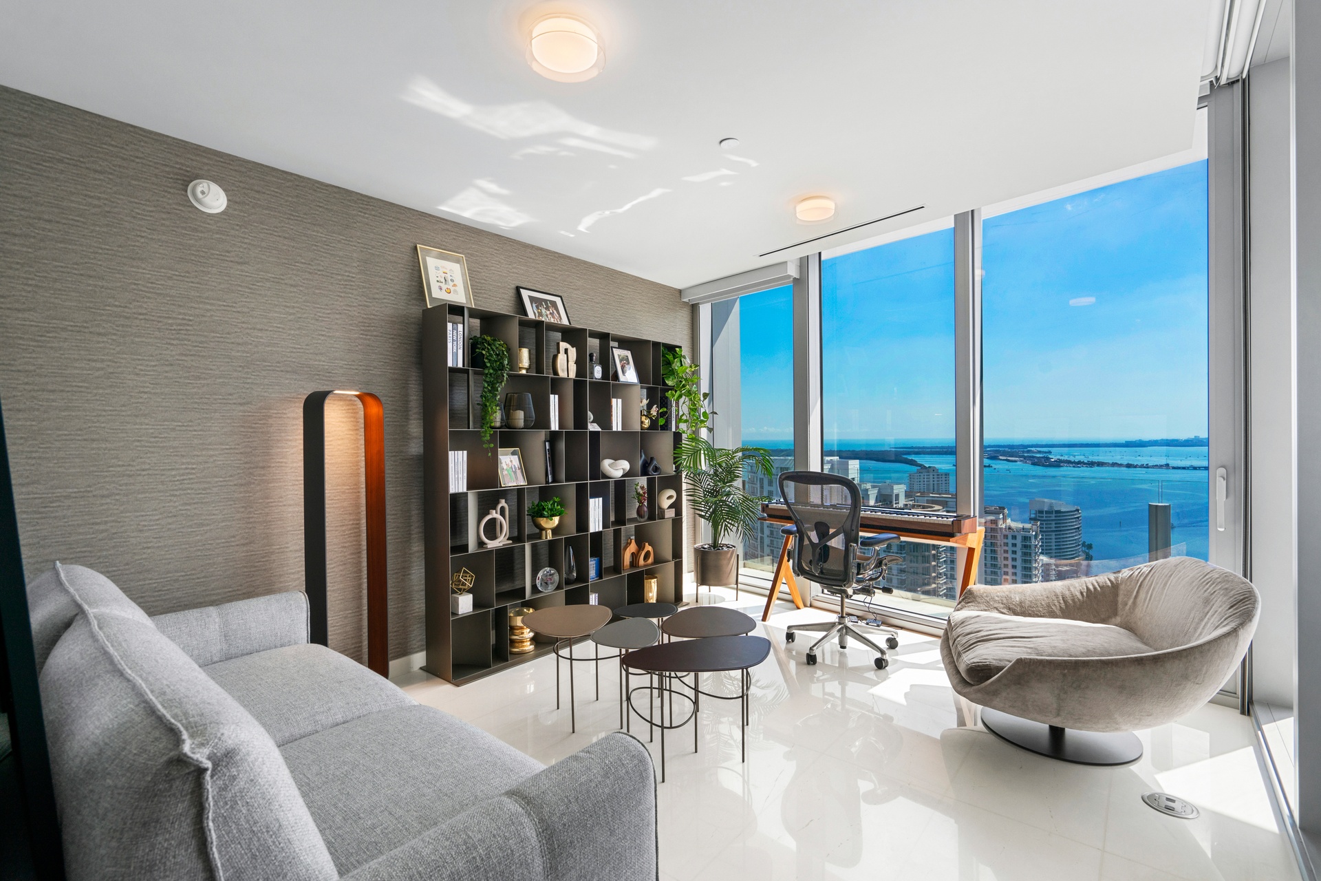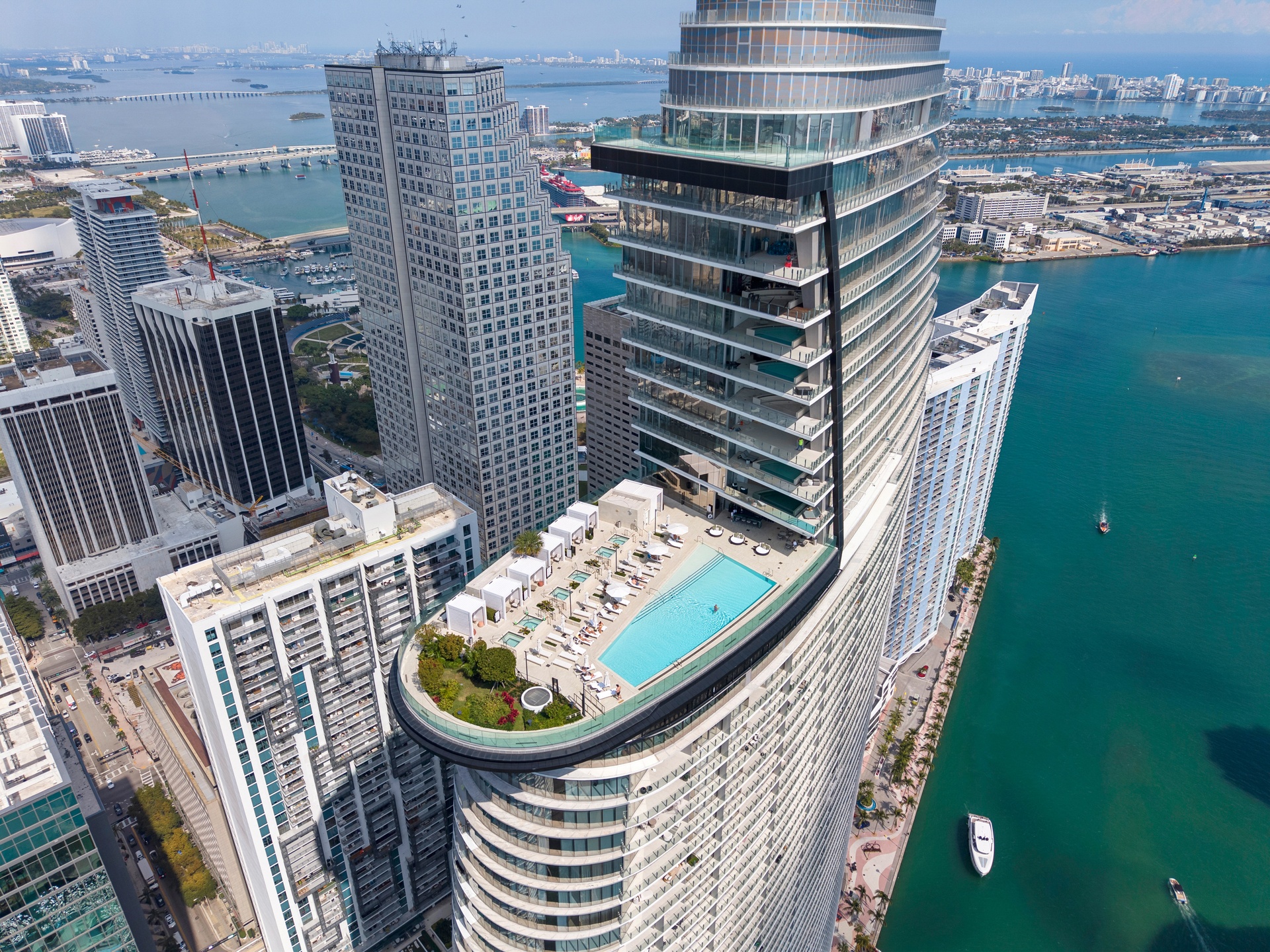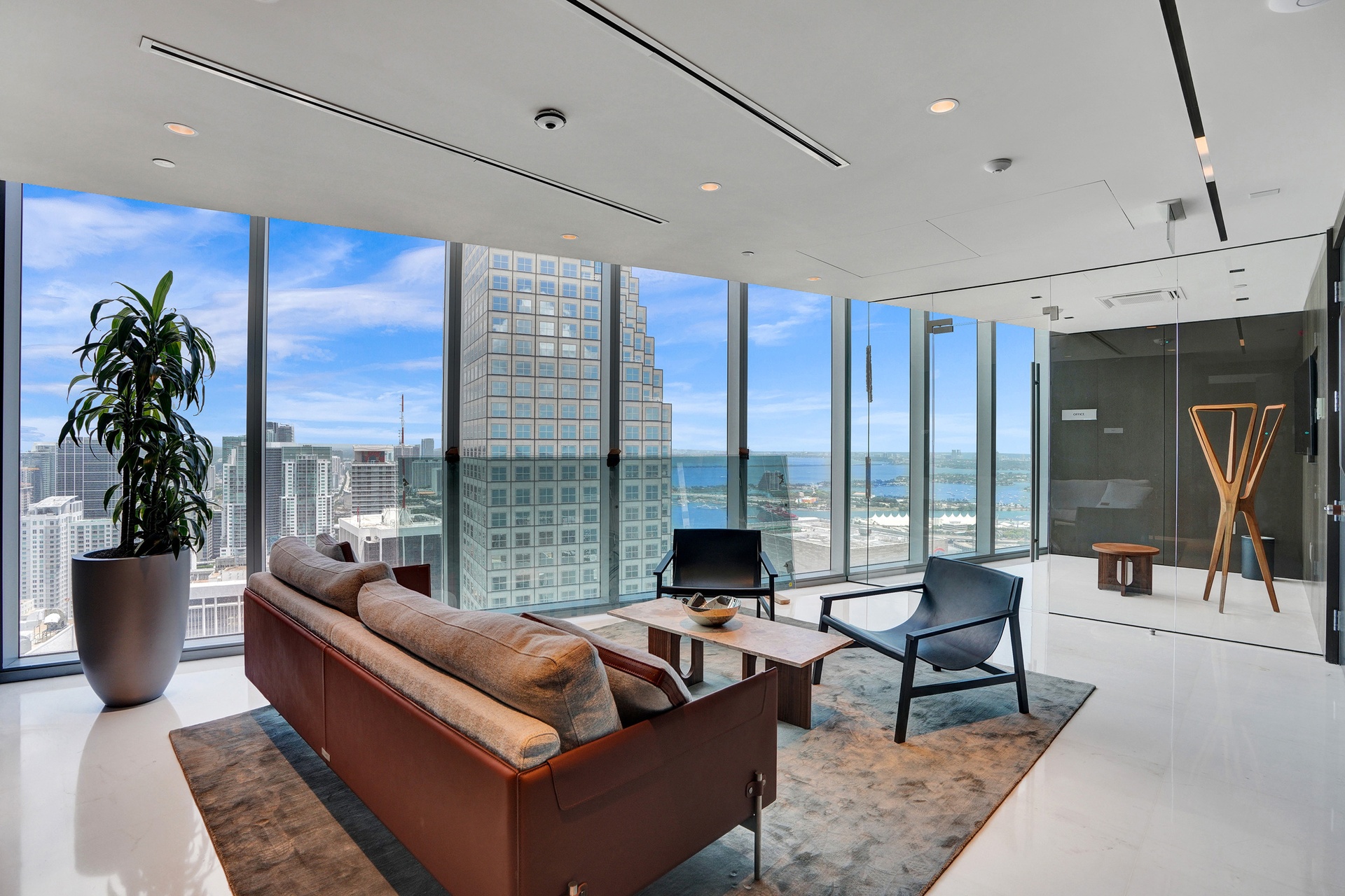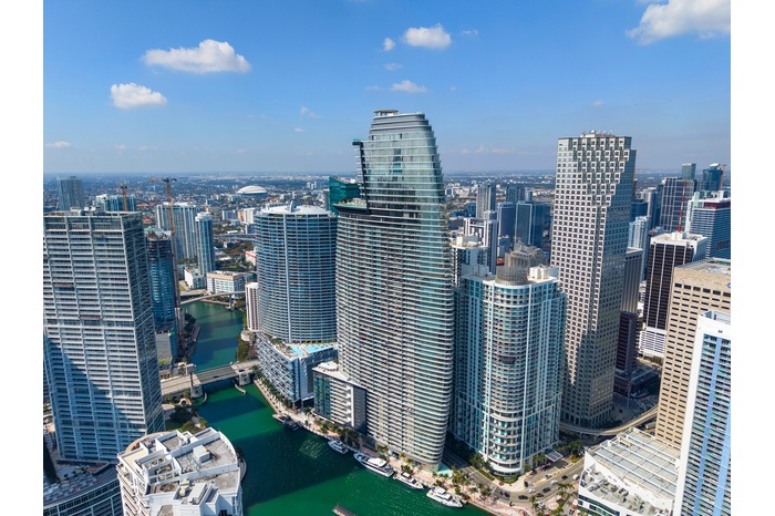 Welcome to Aston Martin 4005, a designer furnished new construction featuring 2 Bed plus an enclosable Den with 3.5 baths in the waterfront between Brickell and Downtown Miami. This stunning high-floor residence features breathtaking panoramic views of Biscayne Bay, the Miami skyline, and the Atlantic Ocean through 10 ft floor-to-ceiling windows and wrap-around balcony. Professionally curated interiors blend modern elegance with comfort, showcasing custom furnishings by Addison House, statement lighting, premium finishes, and bespoke décor throughout. The open-concept living and dining areas flow seamlessly into a gourmet kitchen equipped with top-of-the-line Gaggenau appliances, sleek cabinetry, and refined stone surfaces. Spacious bedrooms offer serene retreats with spa-inspired bathrooms and ample walk-in closets. Wraparound balcony accesible from all bedrooms and living room. Residents also enjoy over 40,000 SqFt of amenities including an infinity pool deck in the sky, state of the art fitness center and spa, theaters, kids rooms, business centre, event salons, boat dock, and more. Building also features 24/7 security, concierge, and is within steps from Miami's hottest restaurants and shops, Downtown and Brickell, and a short drive from Miami Beach, Key Biscayne, Coconut Grove with easy access to the airport. Tenant can chose to change to bedroom furniture in the second bedroom. Must See!