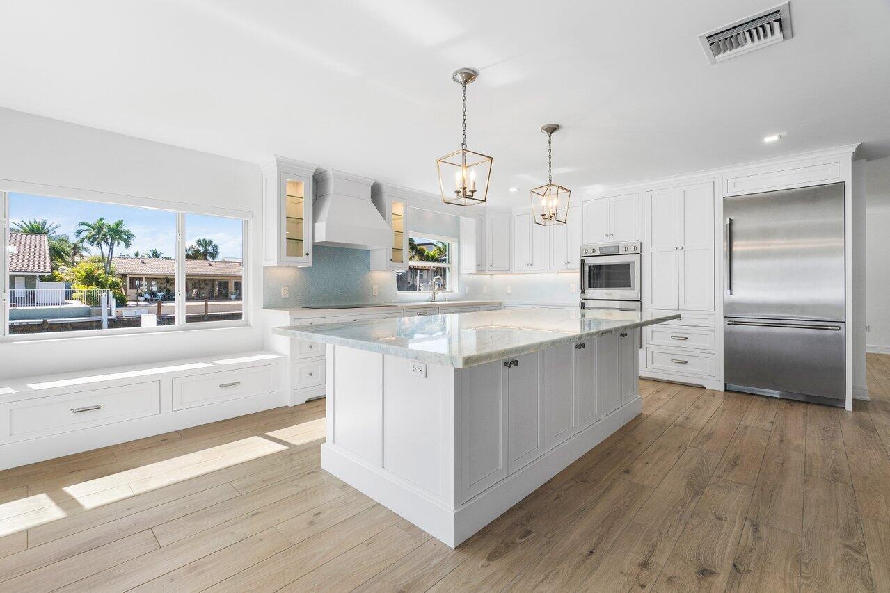 Live the Florida Lifestyle in this Waterfront Boater's Dream Home! Rare SE Deepwater Point Lot boasts 211 feet of Waterfrontage with Intracoastal and Canal Views. Ocean access with no fixed bridges. Upon entering this exquisite 3 bedroom, 2.5-bath-home, you are captivated by the sparkling water views and wide-open space. Completely renovated including new kitchen, baths, flooring, plumbing, insulation, wiring, 5-ton AC unit with new duct work and impact windows and doors. New roof in 2021 with trusses secured to concrete headers with solid steel Simpson plates for additional hurricane protection. Stunning gourmet kitchen features custom cabinetry, large stone cook island and Thermador appliances with double wall ovens. The owner's suite includes a generous walk-in closet, additional built-in cabinetry and an inviting bath with rainfall shower. Relax around your heated saltwater pool and expansive deck oasis, ideal for entertaining while overlooking the sparkling waterway. There is also an outdoor hot/cold shower for convenience after a long day on the boat. New sea wall, batter piles as well as solid concrete wrap around dock which had been raised 18 inches to meet current elevation requirements. 20,000 lb. cradle boat lift with two high-speed motors and an Armor Wave port jet ski dock. The wrap around dock offers ample water, electricity, cleats and whips for multiple boats as well as fiberglass storage boxes and a 6 ft. filet station. Coral Key Villas is one of South Florida's prime waterfront communities located close to the Hillsboro Inlet, Lighthouse Point Yacht Club, marina, upscale shopping and restaurants. All information published and provided including but not limited to measurements, features, finishes, taxes, etc., are subject to errors and omissions. All such information should be independently verified by all parties who should perform their own due diligence to verify all information. The listing company expressly disclaims any warranty or representation regarding such information.
