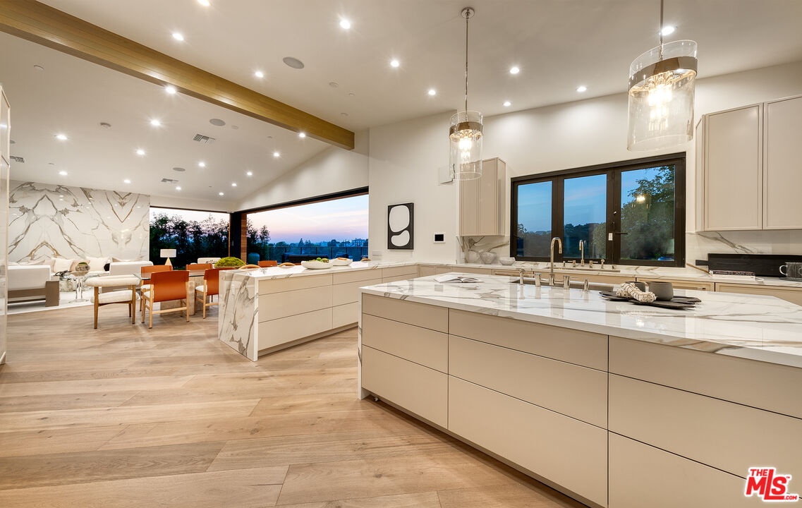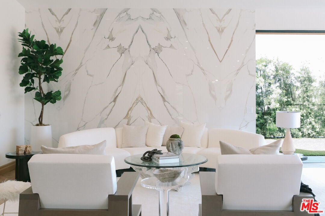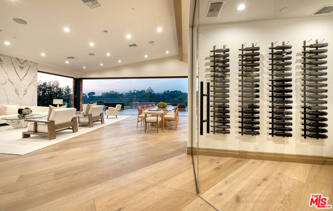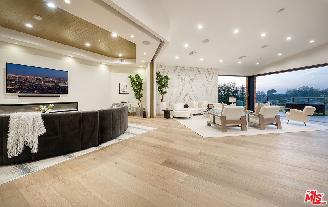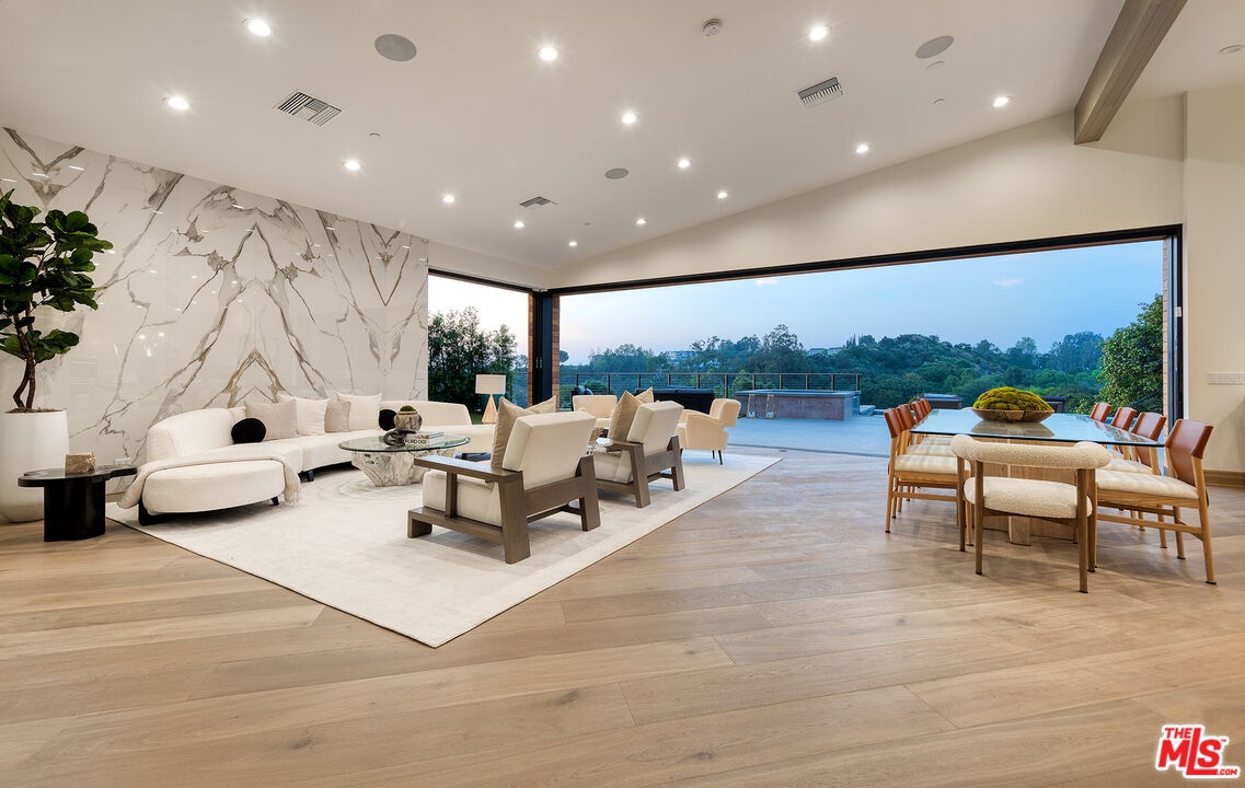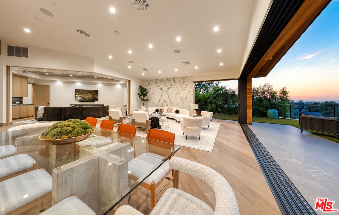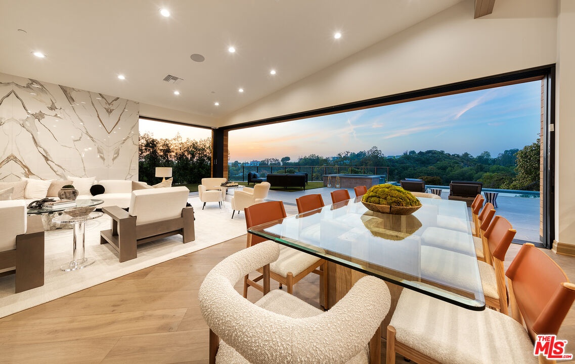 The Janice Place Estate is a brand-new single-story contemporary masterpiece in Beverly Hills 90210 post office, perfectly situated on a serene cul-de-sac one block north of the legendary Trousdale Estates and minutes from Bel Air. Set on a nearly 29,000-square-foot lot, this brand new construction residence spans 6,194 square feet with 6 en-suite bedrooms, 9 bathrooms, and a seamless open floor plan designed for quiet luxury living and world-class entertaining. Floor-to-ceiling automated glass doors dissolve the boundary between indoors and out, opening to a private backyard paradise with an infinity-edge pool, heated spa, waterfall, fire pit, and sweeping canyon views framed by mature trees and lush landscaping. The chef's kitchen features Miele appliances, dual ovens, two dishwashers, built-in espresso maker, Calacatta Borghini waterfall islands, custom cabinetry, walk-in pantry, full wet bar, and a temperature-controlled glass wine room. European hardwood floors flow throughout. The media room features a wide electric fireplace and matchbook porcelain feature wall, converting effortlessly from an open entertainment space to an intimate home theater.The grand primary suite is a private sanctuary with a pearl onyx double-sided fireplace, seating area, private patio, and dual spa-caliber bathrooms each with a soaking tub, steam shower, and walk-in closet. Five additional bedroom suites offer flexible configurations for family, guests, home office, gym, yoga studio, or au-pair quarters. Outside is an entertainer's dream with a custom barbecue station, multiple lounge areas, and a fire pit surrounded by breathtaking canyon scenery. Delivered turnkey with curated interior design and a one-of-a-kind art collection (available for purchase), Sonos Arc whole-home sound, app controlled home technology, and a comprehensive ring camera security system. For those seeking a new construction Beverly Hills PO mansion, a luxury estate near Trousdale Estates, or a private canyon-view home comparable to Bel Air's finest the Janice Place Estate is the quiet luxury escape you have been looking for.