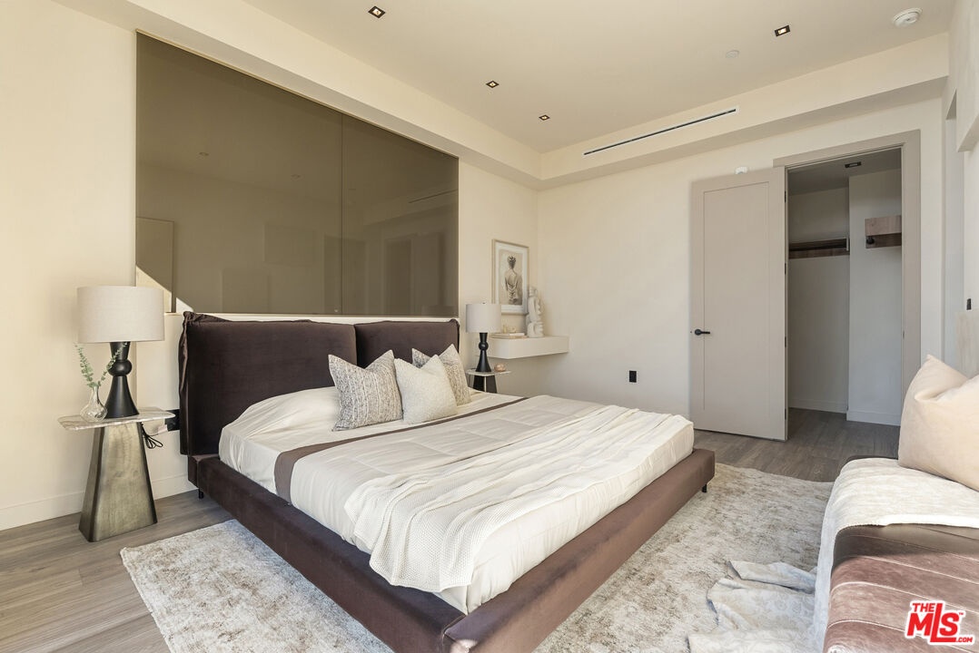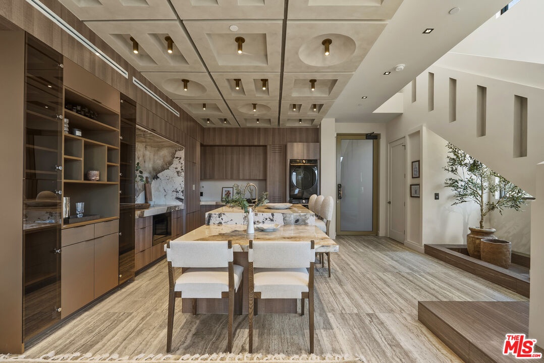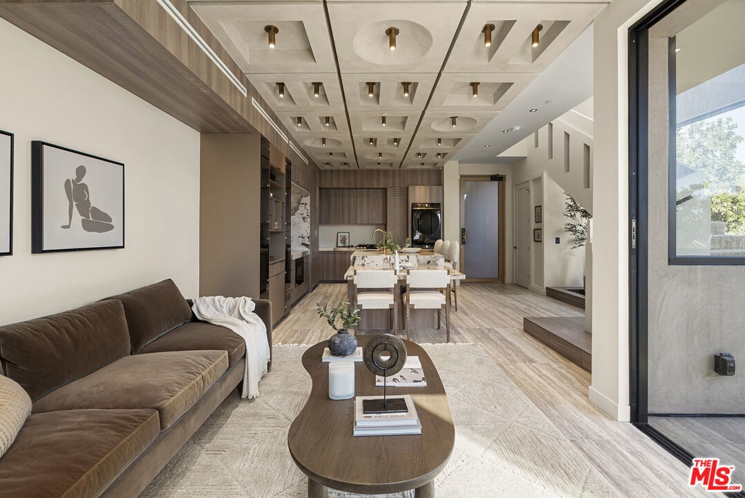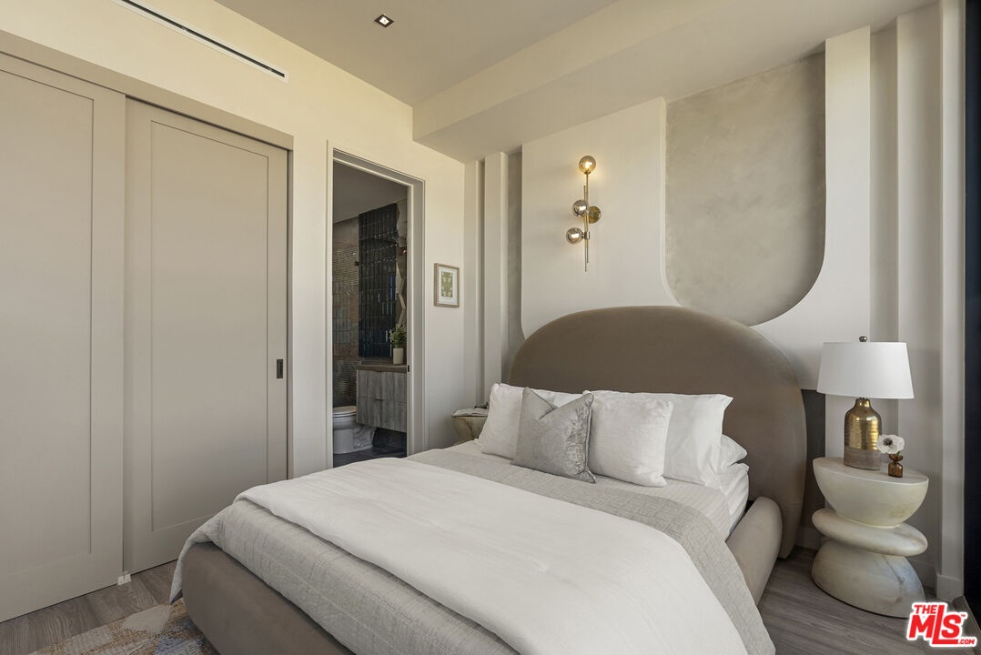 Welcome to The Corten Atelier, a one-of-one architectural residence. A never before lived in two bedroom, 2.5 bath penthouse home within a newly completed design-forward collection, conceived as a sculptural interior composition defined by imported European materials, warm mineral textures, and bespoke architectural detailing rarely found in lease offerings. The dramatic living space is anchored by a custom coffered ceiling grid with integrated bronze lighting and a waterfall quartz kitchen island wrapped in bespoke cabinetry imported from Italy and Spain. A sculptural interior staircase ascends to the private upper level where both bedrooms are positioned, establishing a rare two-level penthouse layout. Walls are finished in ceramic and floors in porcelain, with the majority of tile selections sourced from premier manufacturers in Italy, Spain, and the United Kingdom. The primary suite continues the architectural narrative with sculpted wall detailing, custom upholstered forms, and direct terrace access. The spa bath is finished in layered oxidized-tone European tile with striated textural relief and floating vanity, a boutique-hotel composition rarely seen in new lease construction. Secondary bedrooms maintain the same curated material palette and detailing. Expansive sliding glass doors extend the residence to a 127 sqft private terrace, while residents also enjoy access to a landscaped rooftop retreat featuring sculptural desert plantings including golden barrel cactus, San Pedro cactus, aloe varieties, and flowering planters, an elevated communal lounge framed by sky and city views. Delivered brand new, The Corten Atelier represents a level of architectural leasing product not previously introduced to this West Hollywood pocket. A collectible residence defined by bespoke design, imported materials, and uncompromising craftsmanship.