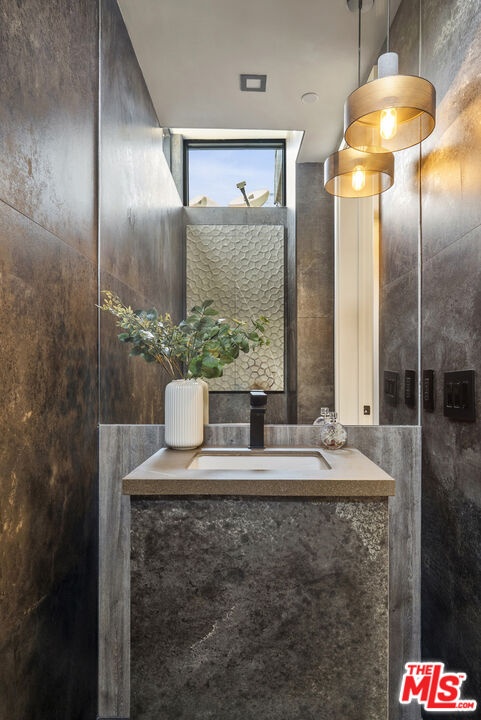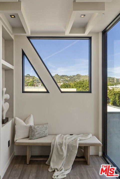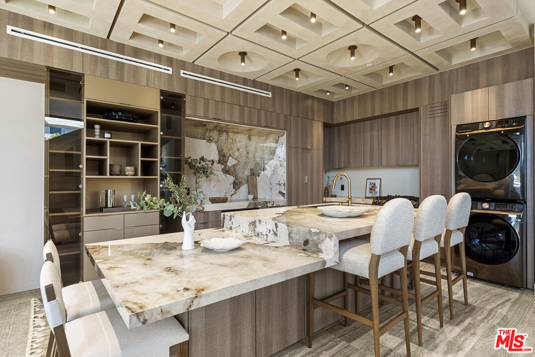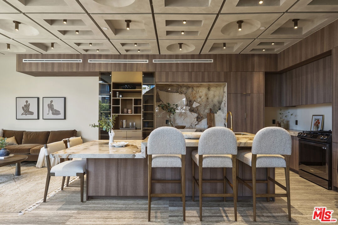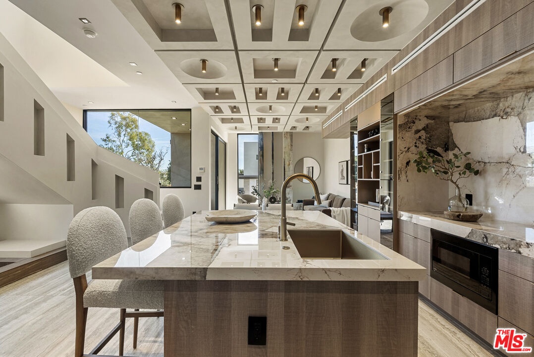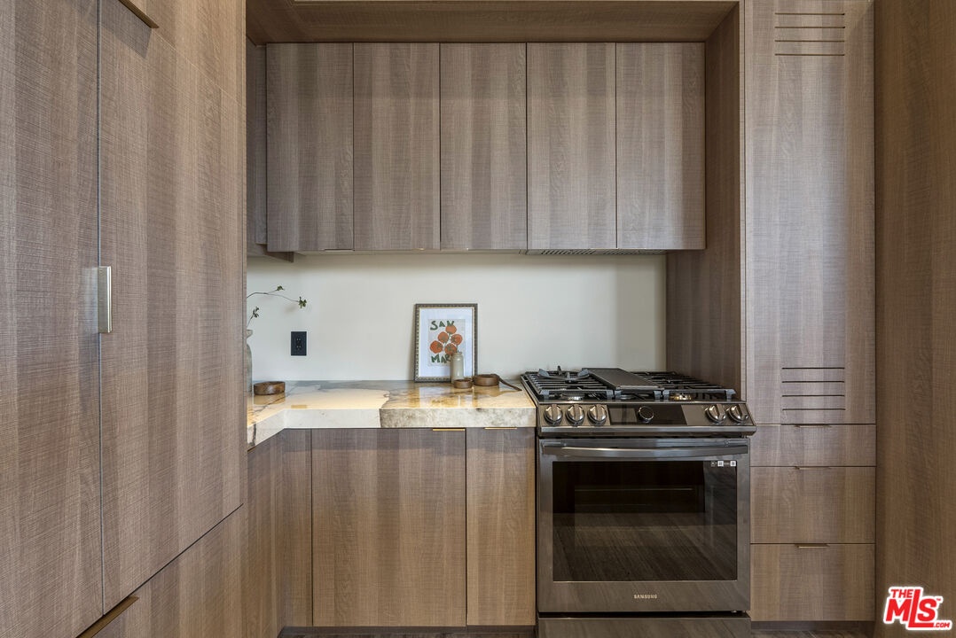 Welcome to The Corten Atelier, a one-of-one architectural residence. A never before lived in two bedroom, 2.5 bath penthouse home within a newly completed design-forward collection, conceived as a sculptural interior composition defined by imported European materials, warm mineral textures, and bespoke architectural detailing rarely found in lease offerings. The dramatic living space is anchored by a custom coffered ceiling grid with integrated bronze lighting and a waterfall quartz kitchen island wrapped in bespoke cabinetry imported from Italy and Spain. A sculptural interior staircase ascends to the private upper level where both bedrooms are positioned, establishing a rare two-level penthouse layout. Walls are finished in ceramic and floors in porcelain, with the majority of tile selections sourced from premier manufacturers in Italy, Spain, and the United Kingdom. The primary suite continues the architectural narrative with sculpted wall detailing, custom upholstered forms, and direct terrace access. The spa bath is finished in layered oxidized-tone European tile with striated textural relief and floating vanity, a boutique-hotel composition rarely seen in new lease construction. Secondary bedrooms maintain the same curated material palette and detailing. Expansive sliding glass doors extend the residence to a 127 sqft private terrace, while residents also enjoy access to a landscaped rooftop retreat featuring sculptural desert plantings including golden barrel cactus, San Pedro cactus, aloe varieties, and flowering planters, an elevated communal lounge framed by sky and city views. Delivered brand new, The Corten Atelier represents a level of architectural leasing product not previously introduced to this West Hollywood pocket. A collectible residence defined by bespoke design, imported materials, and uncompromising craftsmanship.