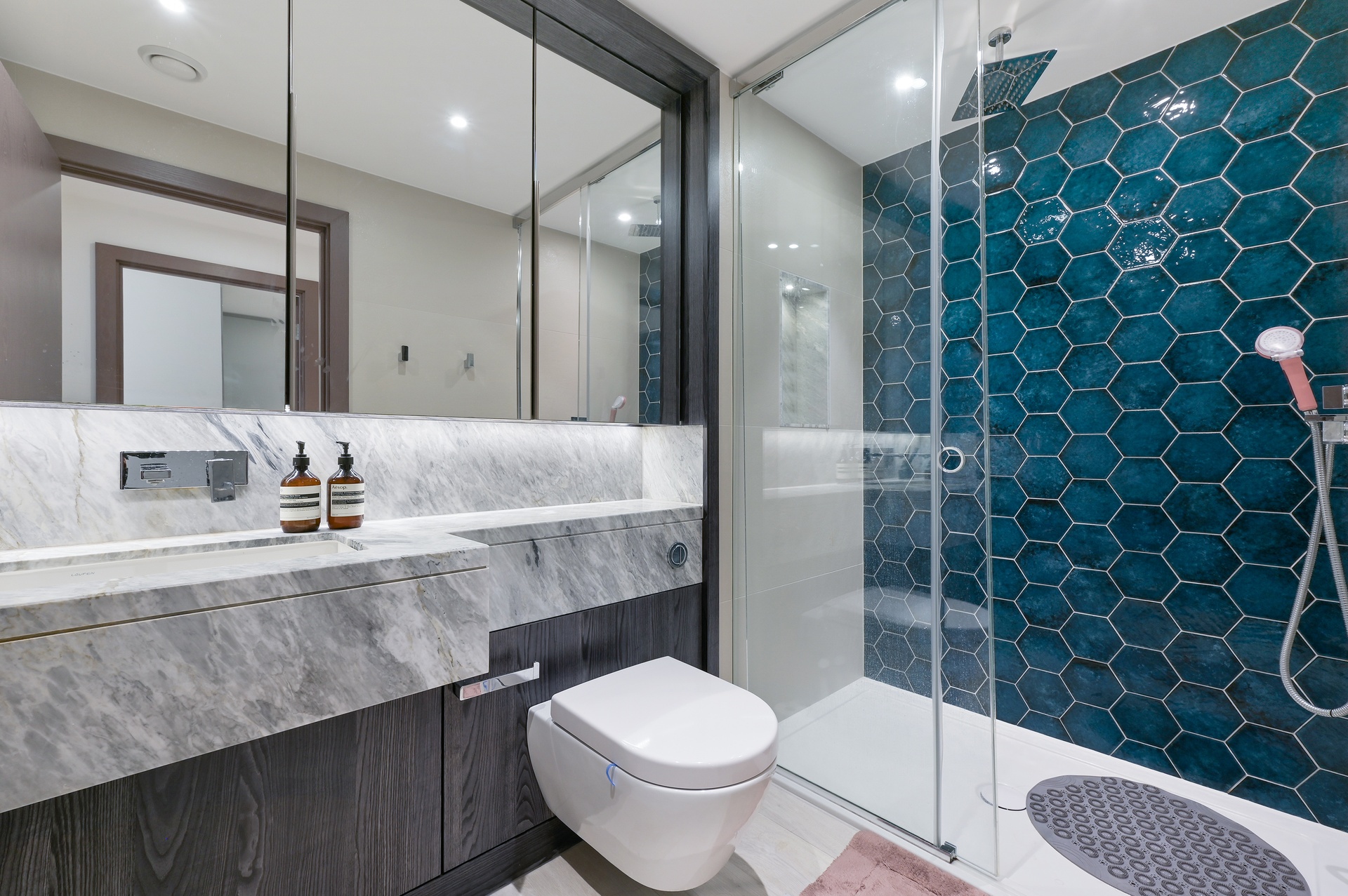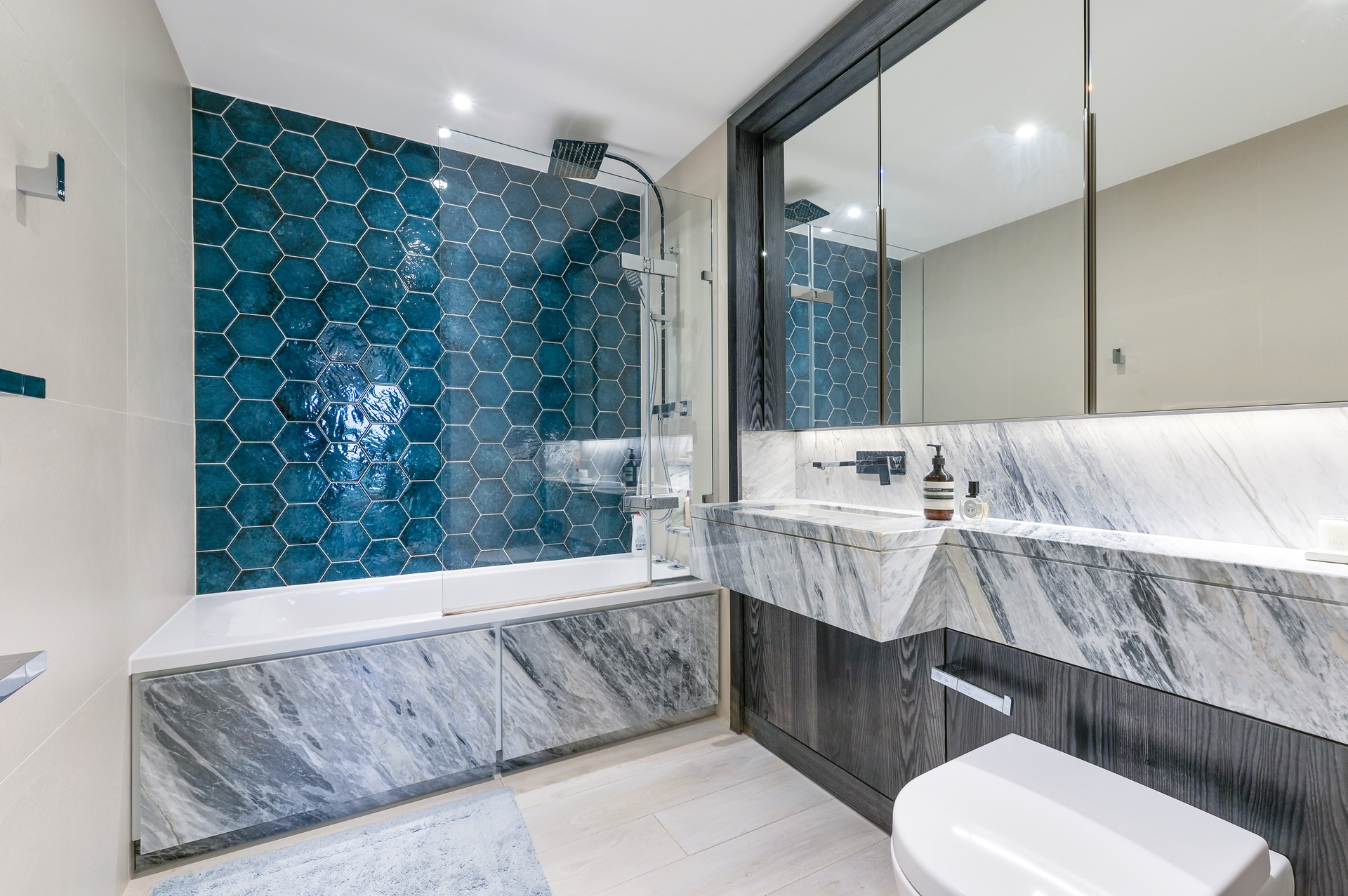 The principal bedroom is generously proportioned and thoughtfully designed, complete with fitted wardrobes incorporating integral lighting, and a luxurious en-suite bathroom. The en-suite benefits from a walk-in shower with overhead rain shower, a stone vanity unit with integrated basin, and an anti-mist mirrored cabinet. The second bedroom is also well-sized, offering excellent natural light through floor-to-ceiling windows. A stylish family bathroom serves the property, complete with a full-size bathtub, overhead rain shower, contemporary vanity unit, and mirrored storage. Additional hallway storage enhances practicality.