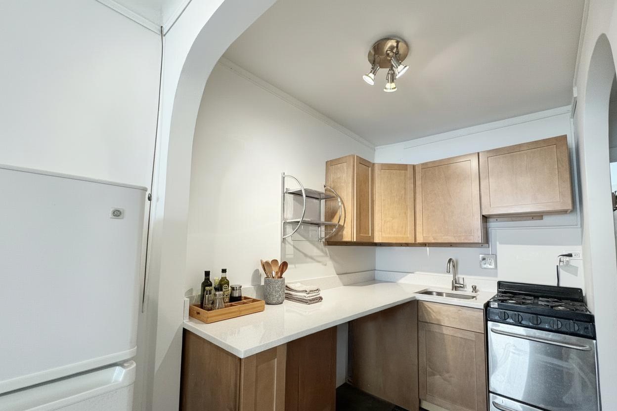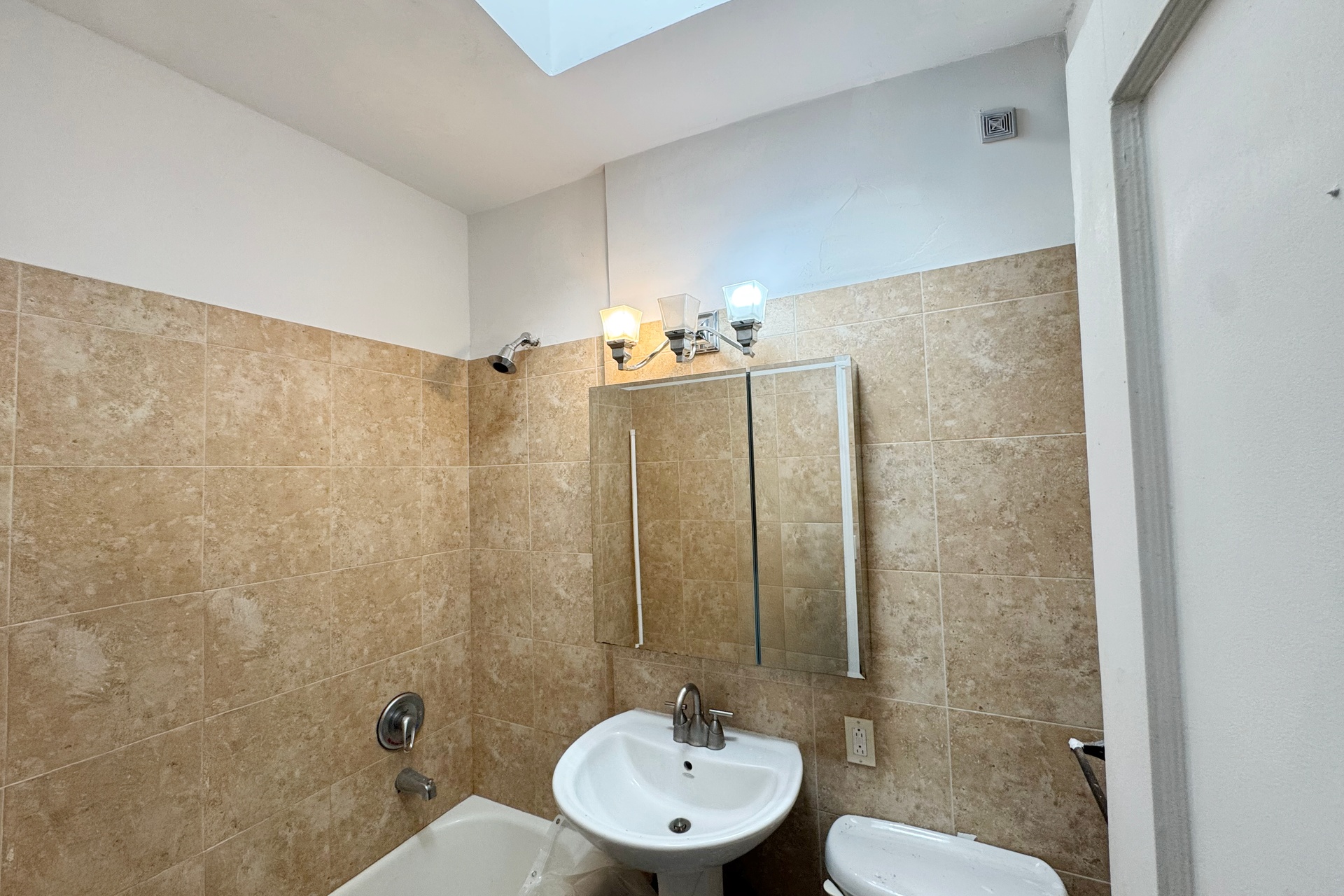 Perched on the top floor (three flights up), this walk-up unit features tall ceilings, hardwood floors, crown moldings, ceiling fans, and track lighting. The updated kitchen includes modern countertops, ample counter space, and stainless steel appliances. A skylight in the bathroom fills the home with abundant natural light throughout the day.