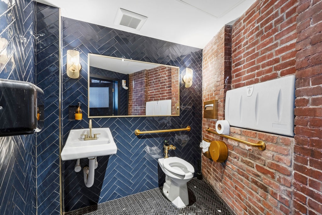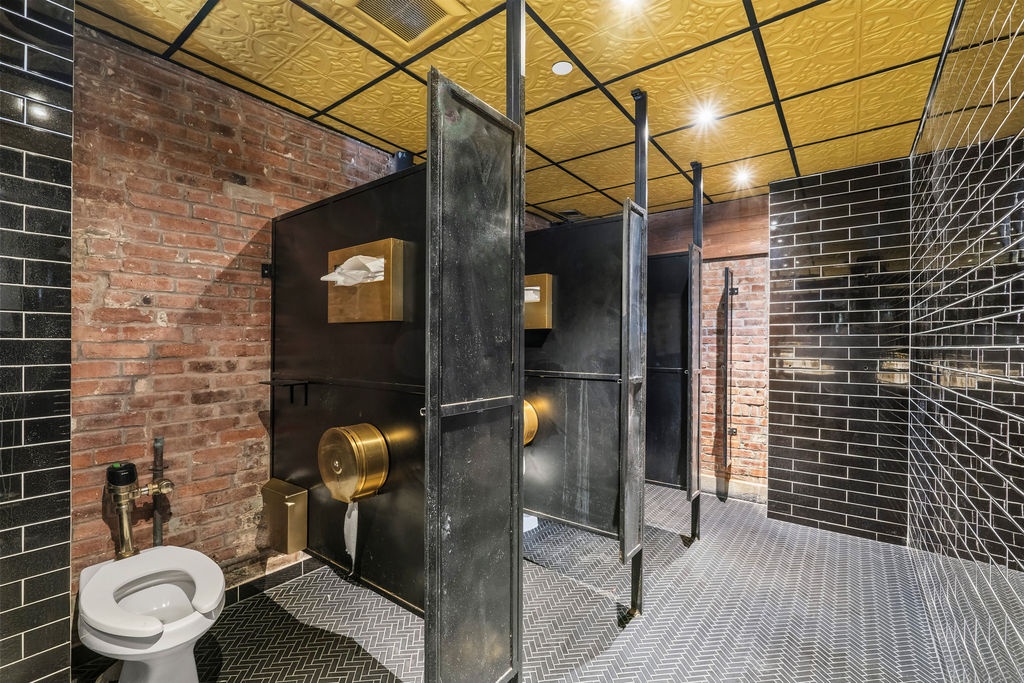 The layout includes three bathrooms (men’s, women’s, and a separate ADA-compliant restroom), multiple private offices, and a separate area that can function as event space or private dining, ideal for private parties, corporate events, or additional seating.