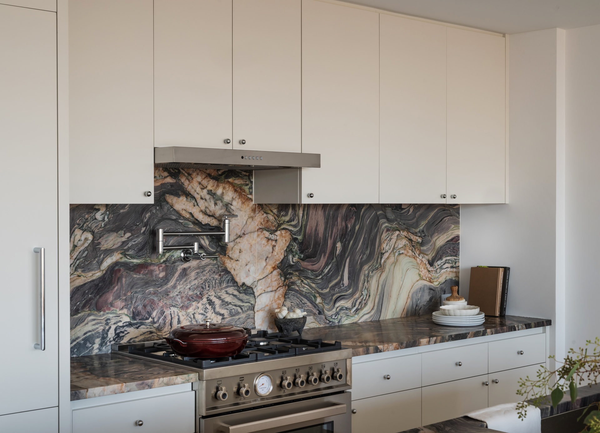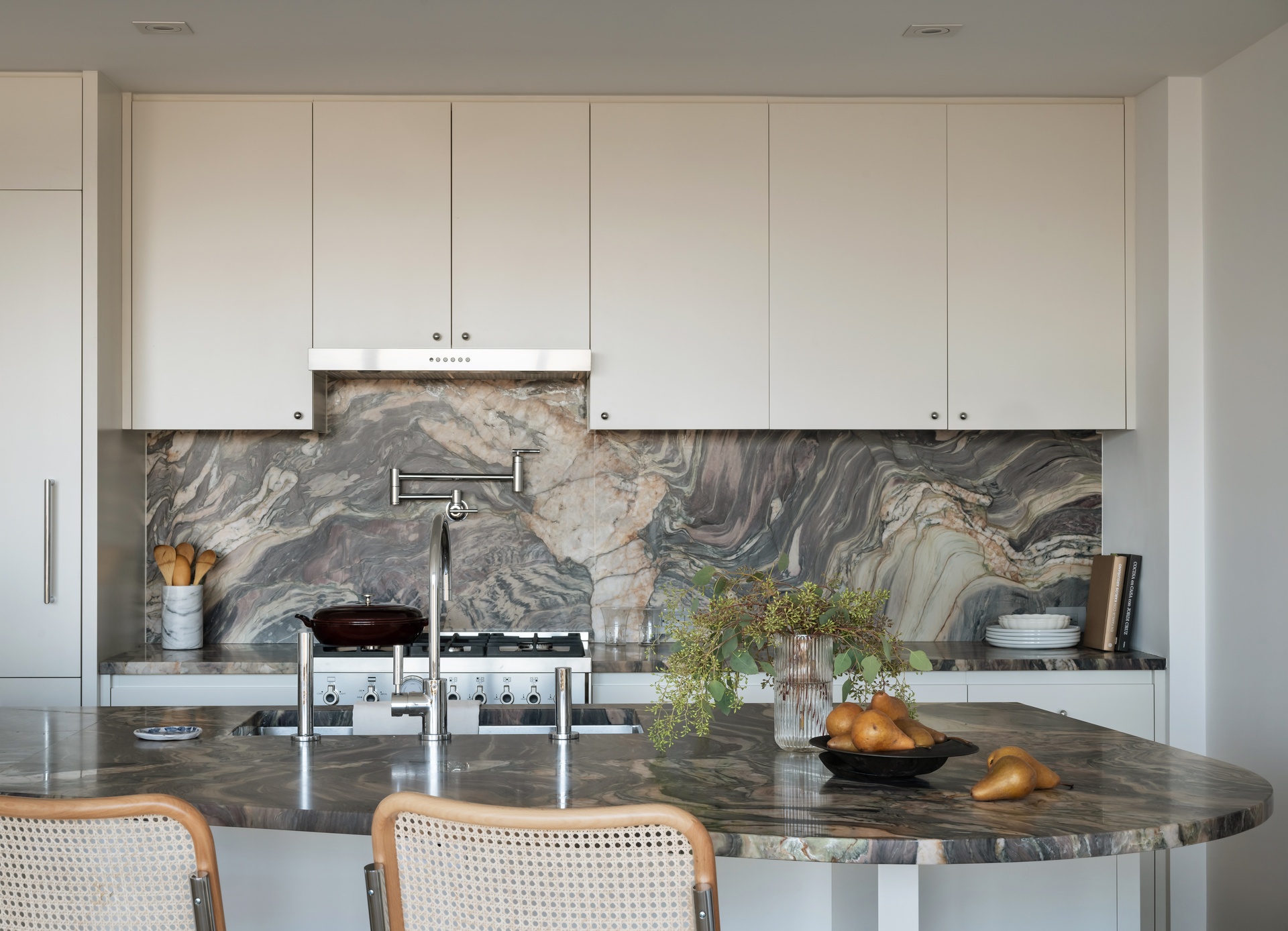 Home chefs of every level will appreciate the brand-new kitchen, crafted with a striking quartzite countertop and full-height slab backsplash, custom lacquer cabinetry with maple plywood interiors, and a suite of premium appliances. Highlights include a Bertazzoni gas range and hood, an integrated Fisher & Paykel refrigerator with ActiveSmart technology, a Bosch Benchmark dishwasher, and a sleek Sharp microwave drawer, delivering a kitchen that is as beautiful as it is functional.