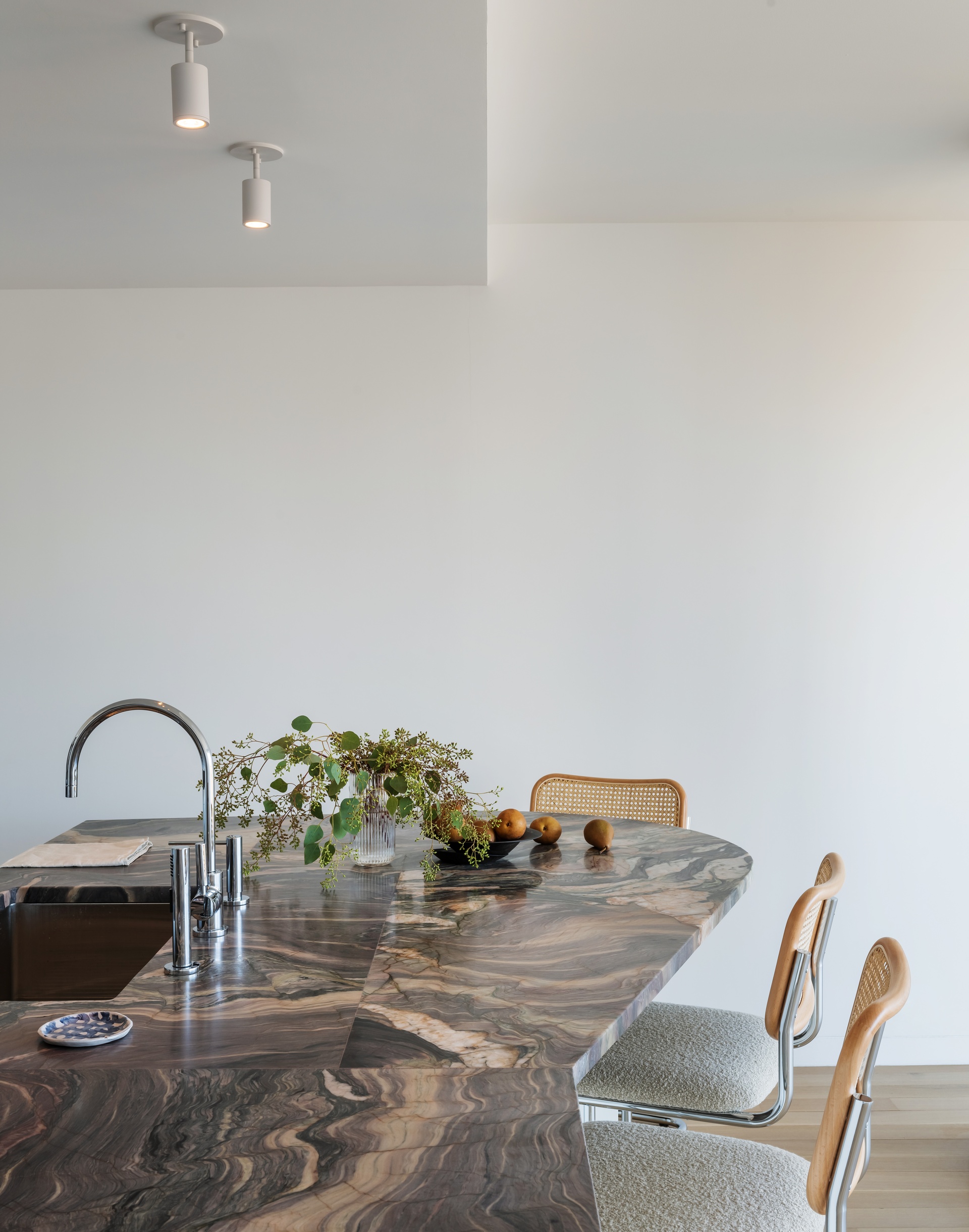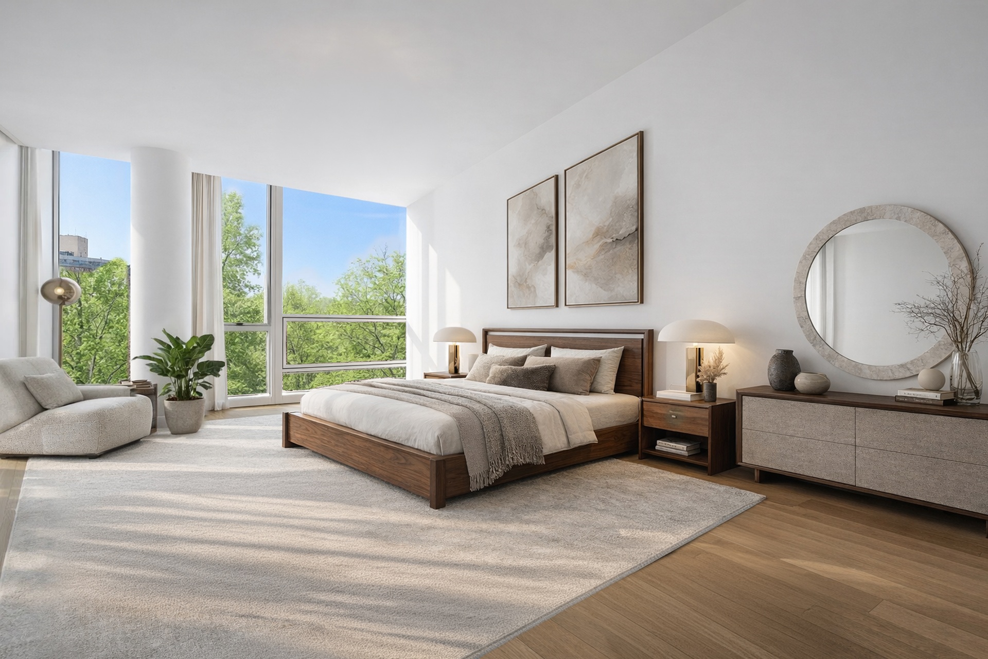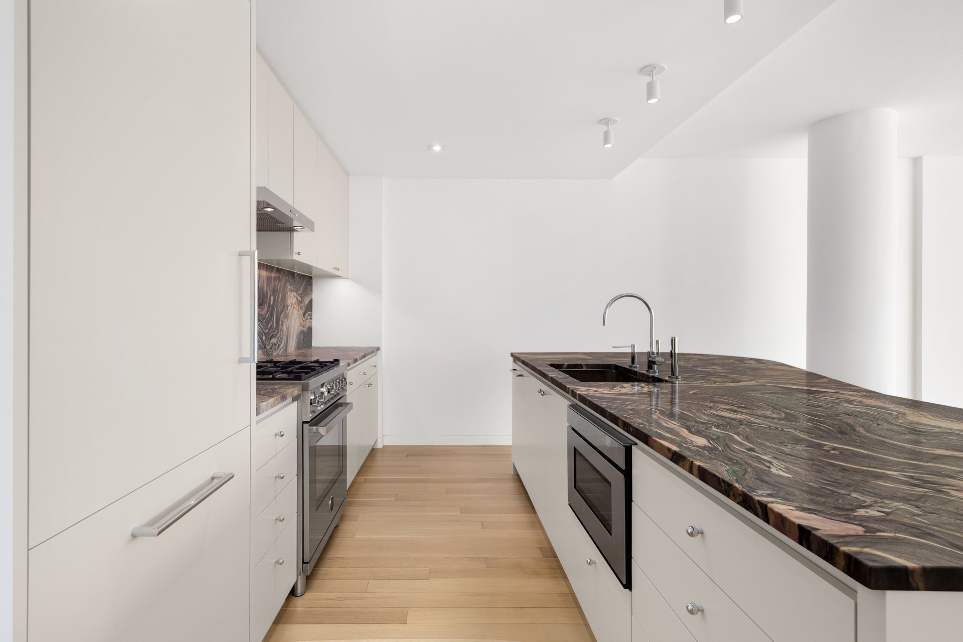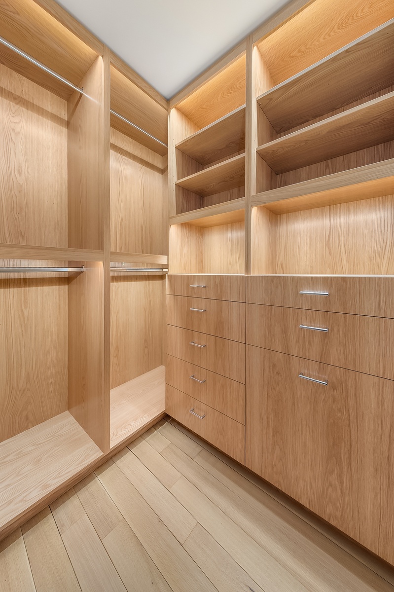 The primary bedroom spans over 23 feet in length and feels like a true retreat, offering serene open views and exceptional storage. Custom white oak walk-in closets and bespoke millwork throughout maximize organization while maintaining a crisp, gallery-like aesthetic.