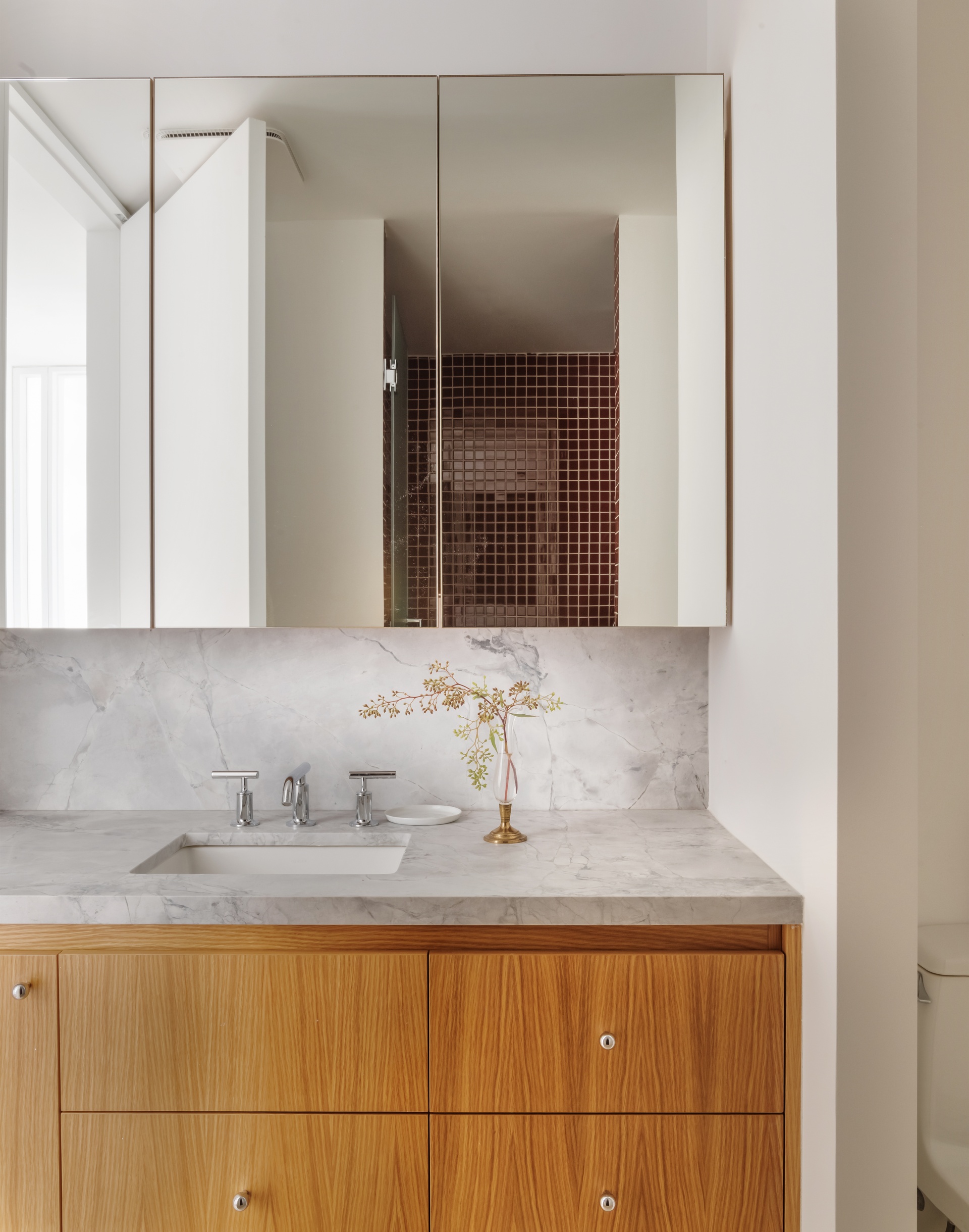 The bathroom has been completely rebuilt with quartzite surfaces, a custom white oak vanity and matching medicine cabinet, Kohler fixtures, and refined modern finishes that feel polished and timeless.