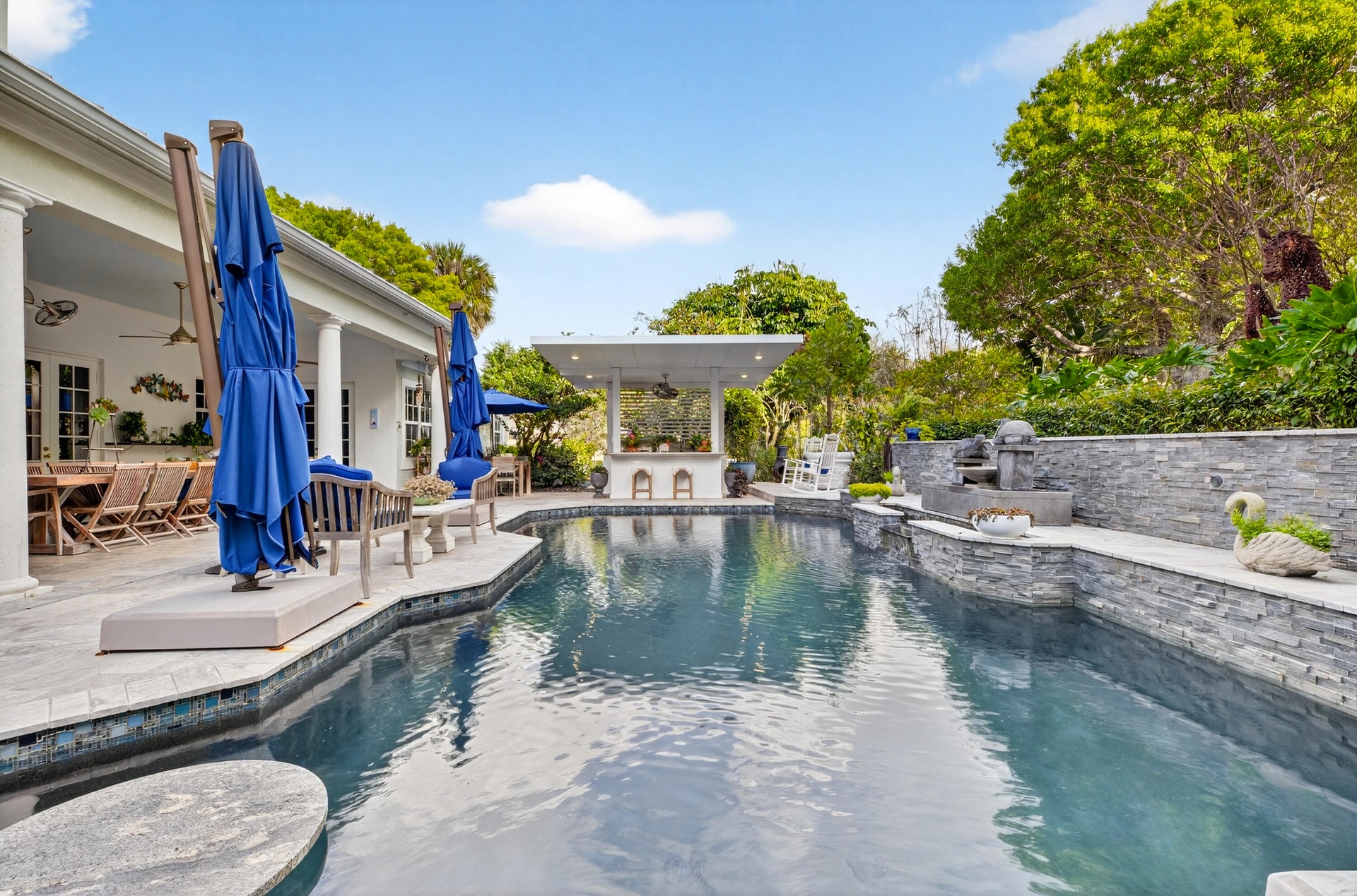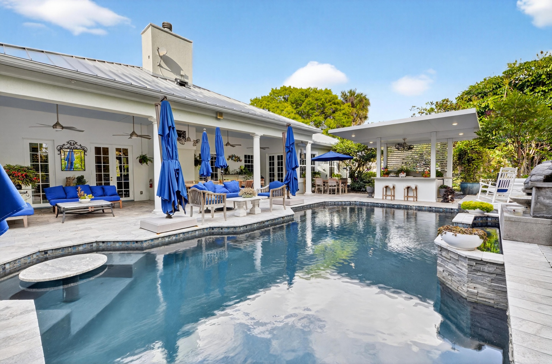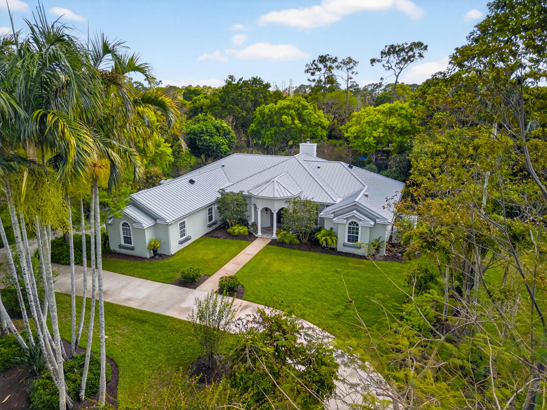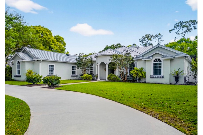 Experience the ultimate Wellington lifestyle in this impeccably maintained 4-bedroom, 3-bathroom estate situated on a lush, fully fenced, over an acre lot in the prestigious Paddock Park in Wellington. This beautifully maintained residence offers the perfect blend of elegance, comfort, and modern upgrades. The minute you drive up the circular driveway and see the covered entry with a custom etched-glass mahogany front door, you know it is special. As you enter, you are greeted by a fieldstone fireplace, the focal point of this fabulous grand space. Major improvements offer peace of mind, including a new metal roof (2025), A/C units (2024), water heater (2022), impact windows & doors, a 1,000-gallon propane tank, and a reverse osmosis water treatment system. At the heart of the home is a custom gourmet chef's kitchen featuring newer appliances and a downdraft Jenn-Air stove perfectly positioned in the center island - ideal for entertaining and everyday living. The spacious primary suite is a true retreat, complete with dual his-and-her closets, a luxurious spa-style bath with soaking tub, and dual sinks. Step outside to your breathtaking private backyard oasis, fully fenced for privacy and highlighted by a dramatic two-story pergola, fruit trees, and manicured garden. Enjoy Florida living at its finest with an oversized saltwater pool heated by both gas and electric, a relaxing spa, an expansive patio, and a brand-new outdoor kitchen. Located just minutes from world-renowned equestrian venues, top-rated schools, shopping, and dining, this exceptional property offers luxury living in one of Wellington's most desirable non-HOA communities.