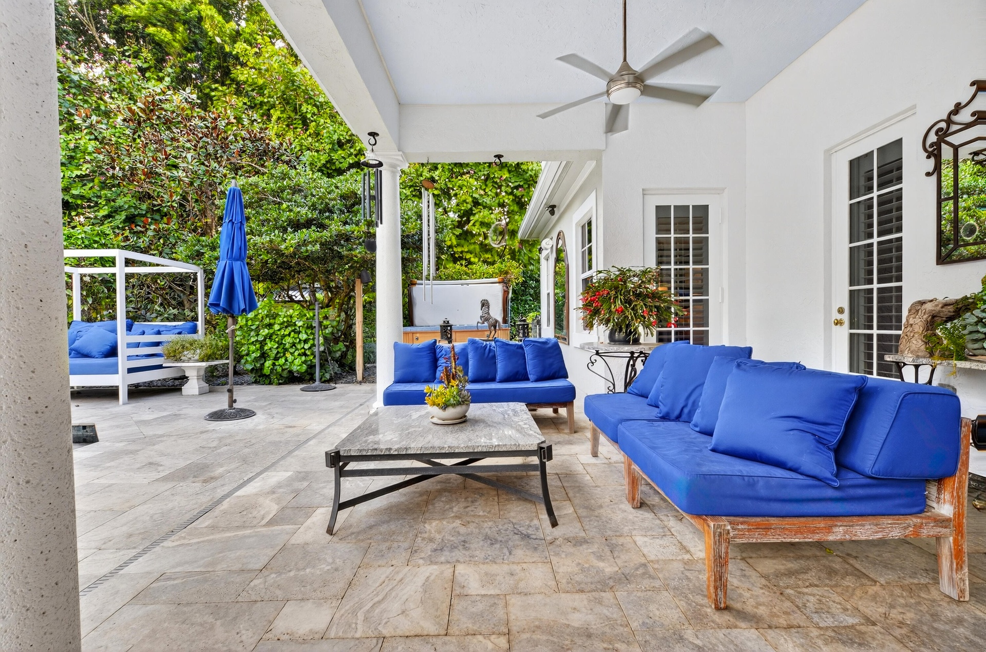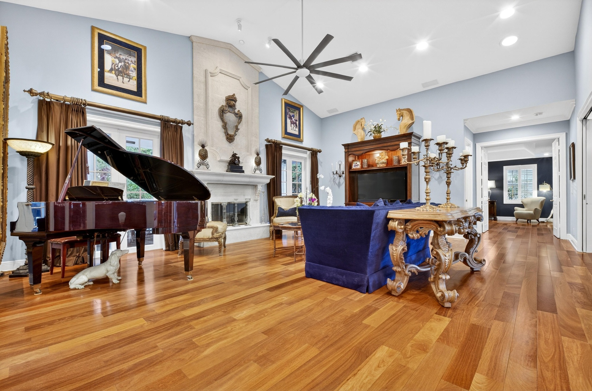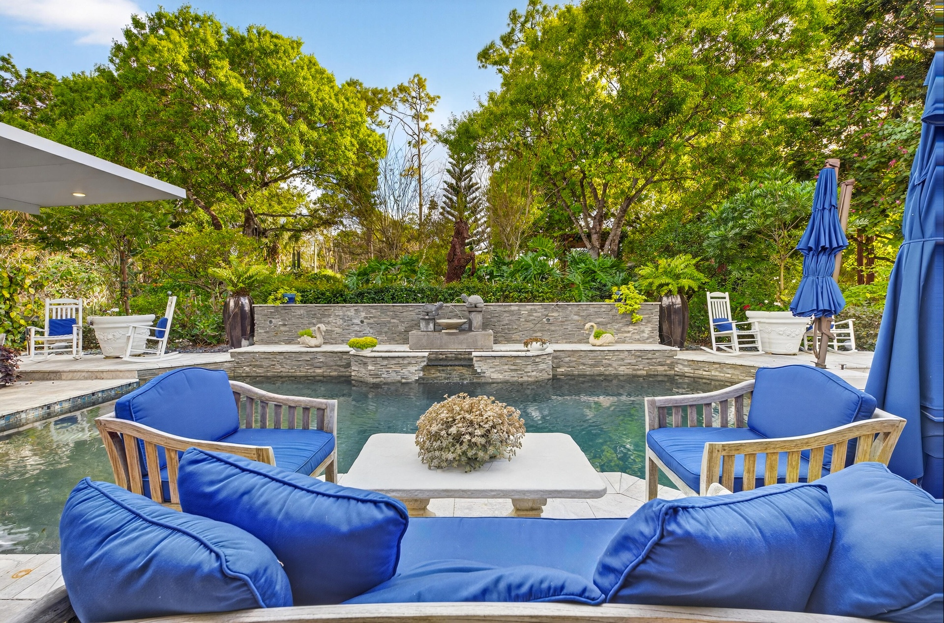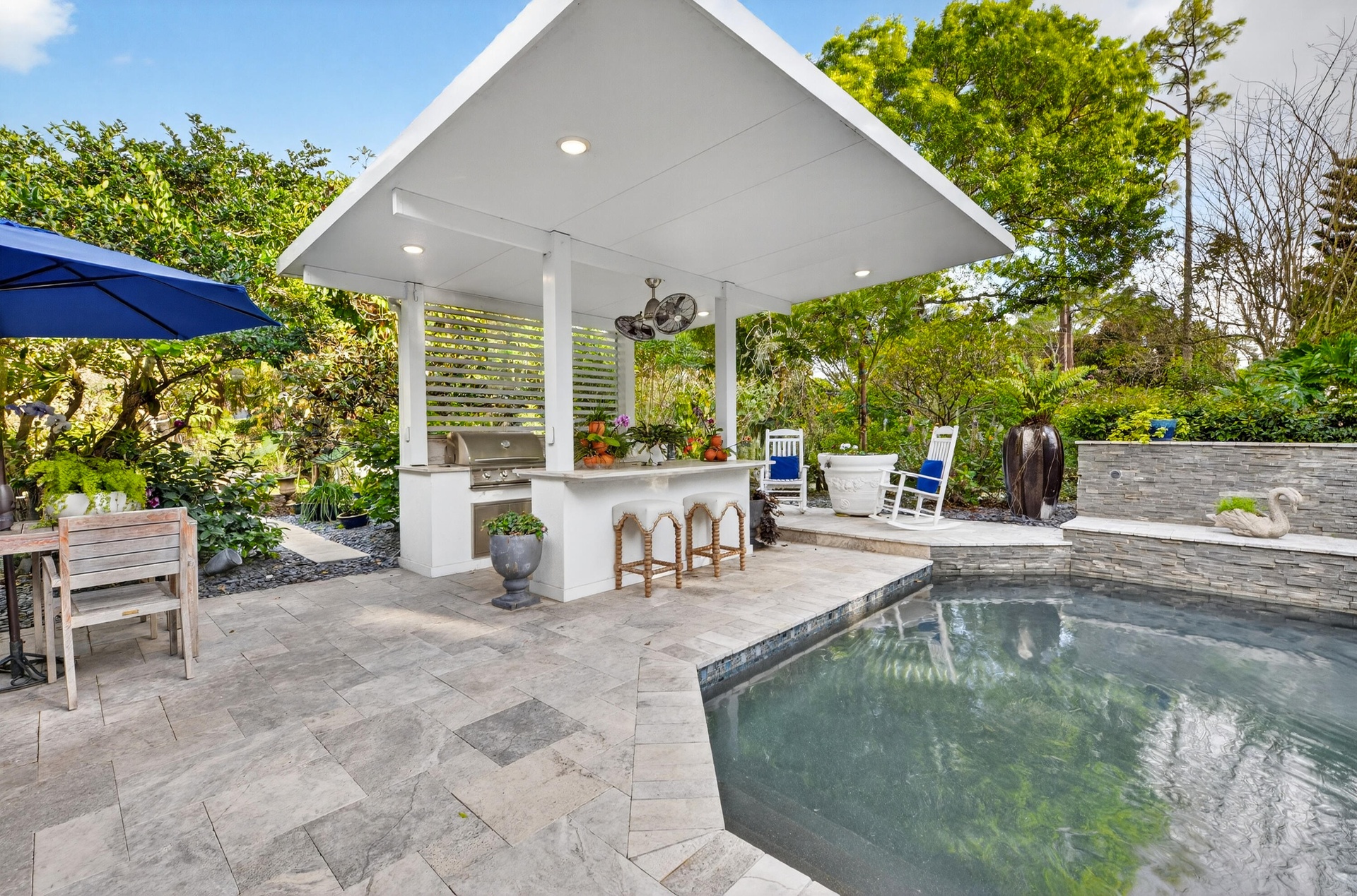 Experience the ultimate Wellington lifestyle in this impeccably maintained 4-bedroom, 3-bathroom estate situated on a lush, fully fenced, over an acre lot in the prestigious Paddock Park in Wellington. This beautifully maintained residence offers the perfect blend of elegance, comfort, and modern upgrades. The minute you drive up the circular driveway and see the covered entry with a custom etched-glass mahogany front door, you know it is special. As you enter, you are greeted by a fieldstone fireplace, the focal point of this fabulous grand space. Major improvements offer peace of mind, including a new metal roof (2025), A/C units (2024), water heater (2022), impact windows & doors, a 1,000-gallon propane tank, and a reverse osmosis water treatment system. At the heart of the home is a custom gourmet chef's kitchen featuring newer appliances and a downdraft Jenn-Air stove perfectly positioned in the center island - ideal for entertaining and everyday living. The spacious primary suite is a true retreat, complete with dual his-and-her closets, a luxurious spa-style bath with soaking tub, and dual sinks. Step outside to your breathtaking private backyard oasis, fully fenced for privacy and highlighted by a dramatic two-story pergola, fruit trees, and manicured garden. Enjoy Florida living at its finest with an oversized saltwater pool heated by both gas and electric, a relaxing spa, an expansive patio, and a brand-new outdoor kitchen. Located just minutes from world-renowned equestrian venues, top-rated schools, shopping, and dining, this exceptional property offers luxury living in one of Wellington's most desirable non-HOA communities.
