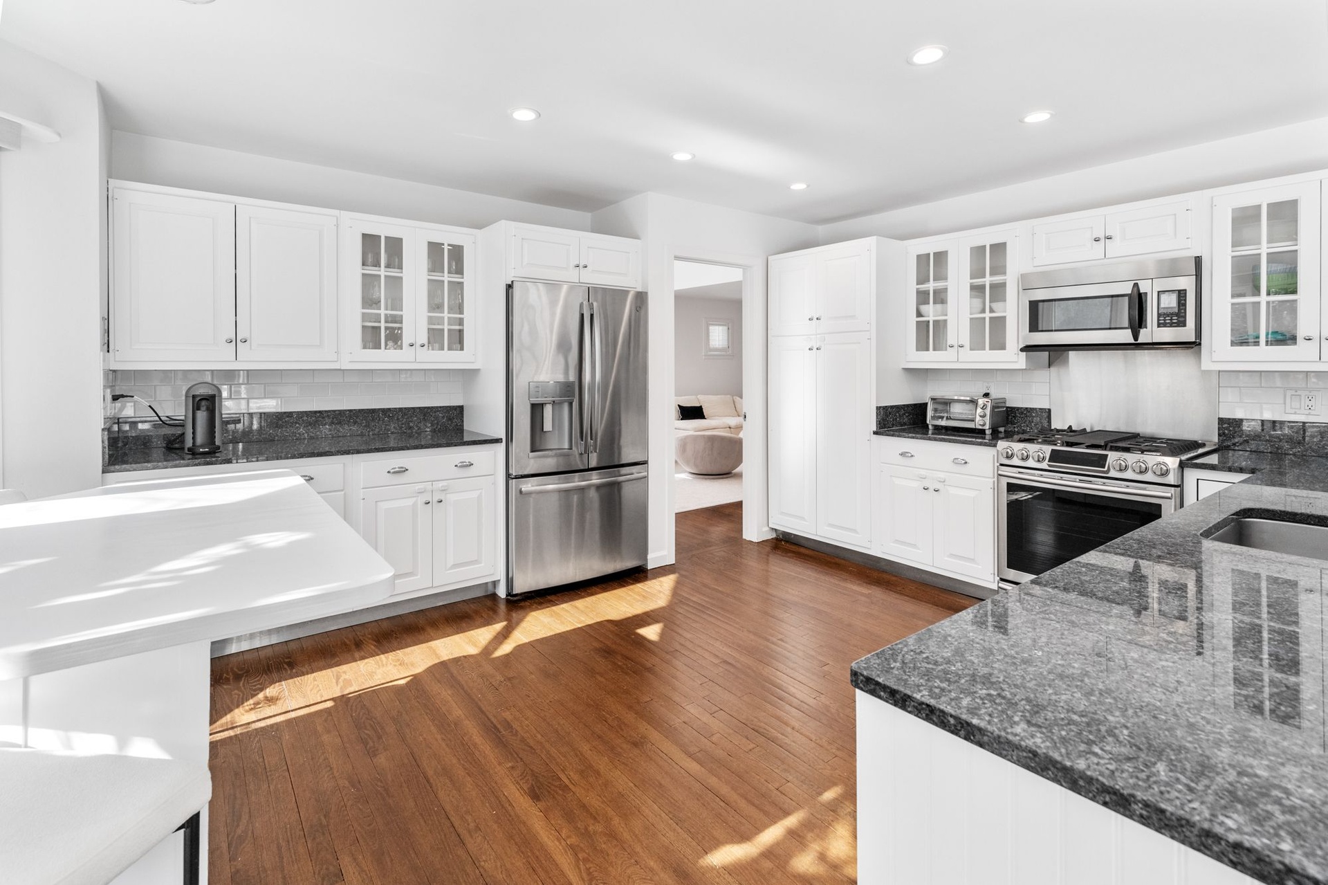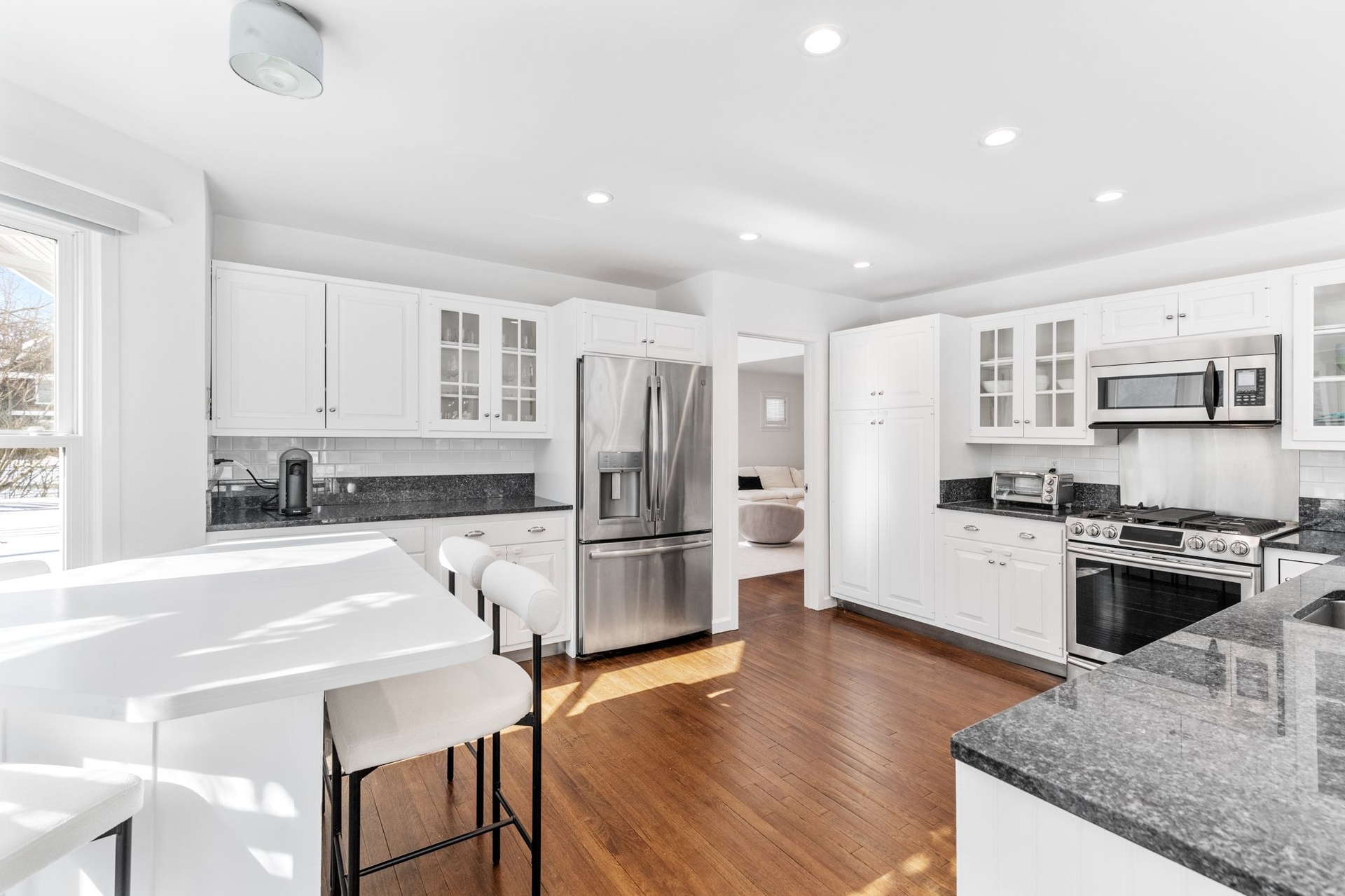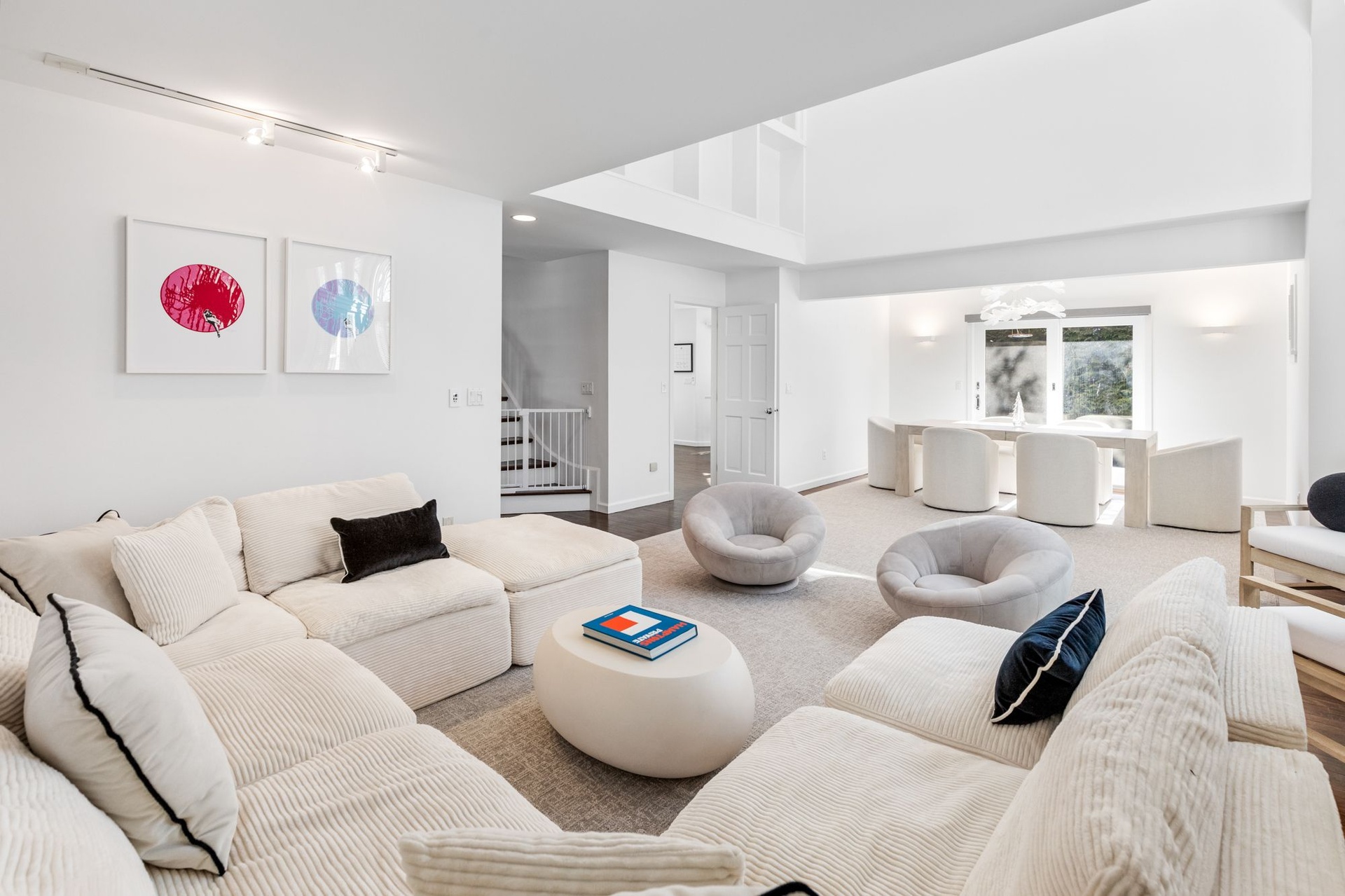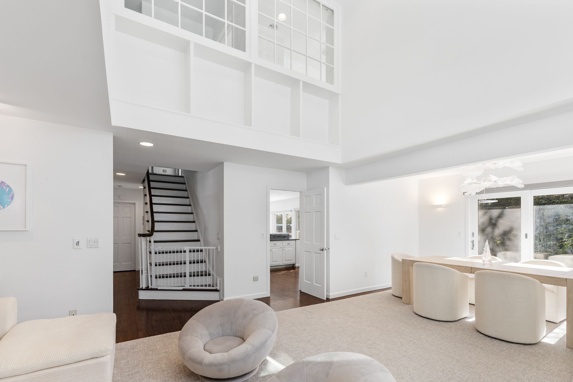The home offers five generously proportioned bedrooms and three and two-half baths. A beautifully appointed eat-in kitchen flows effortlessly into the inviting family room, while a dramatic double-height living room and formal dining area create an impressive setting for entertaining.