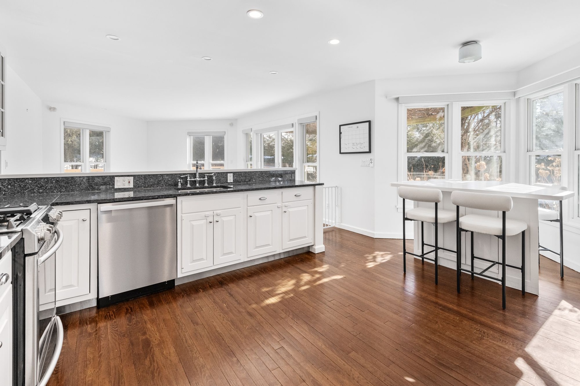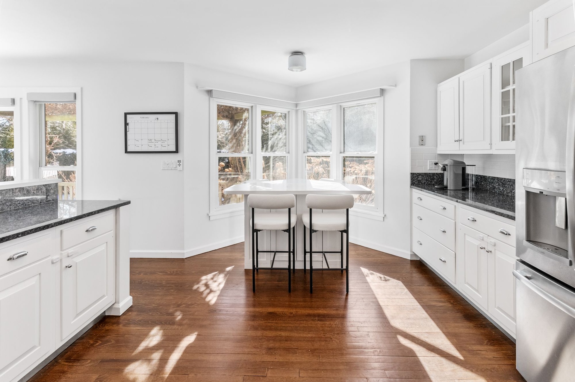 Outdoors, the private, landscaped grounds are enhanced by mature plantings, irrigation, a heated pool, and a shaded side deck with a comfortable seating area—perfect for relaxed summer living.