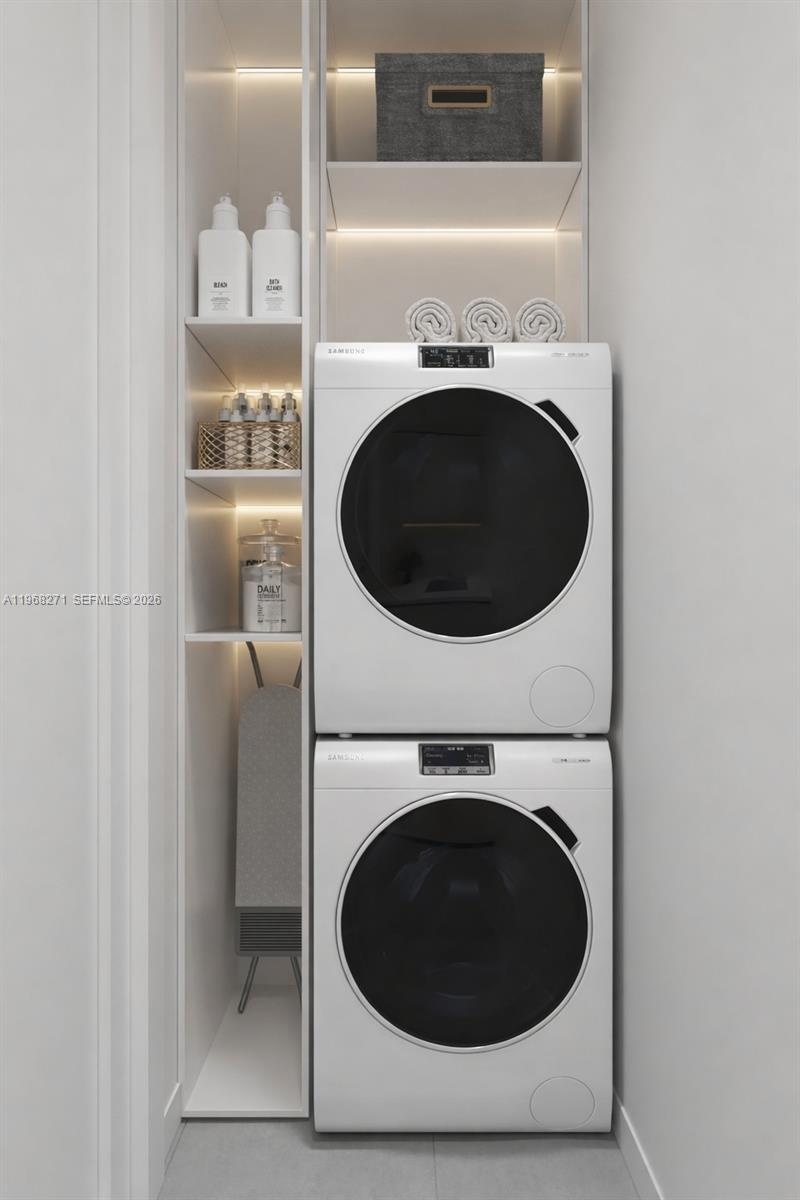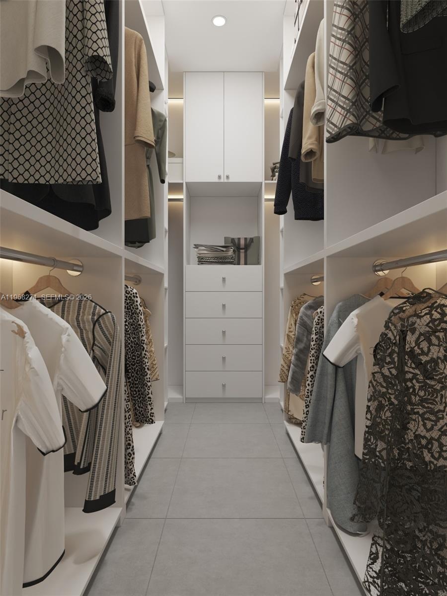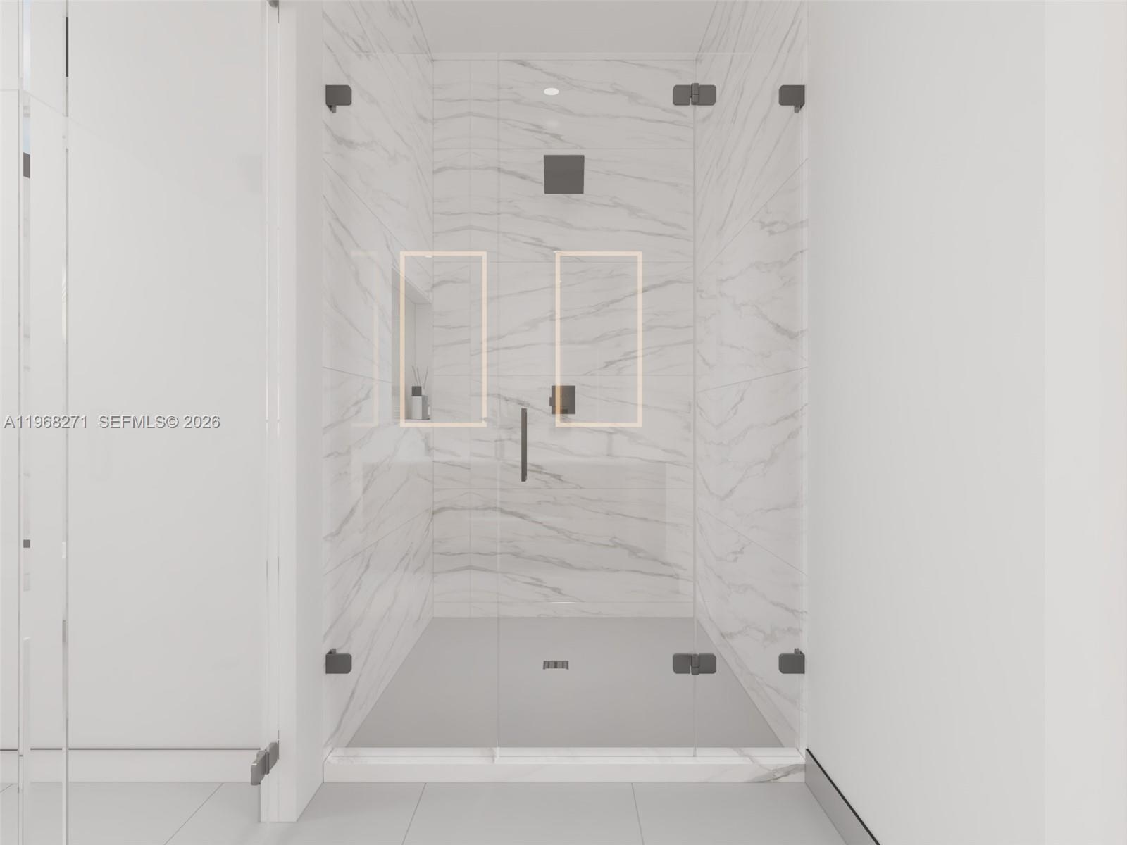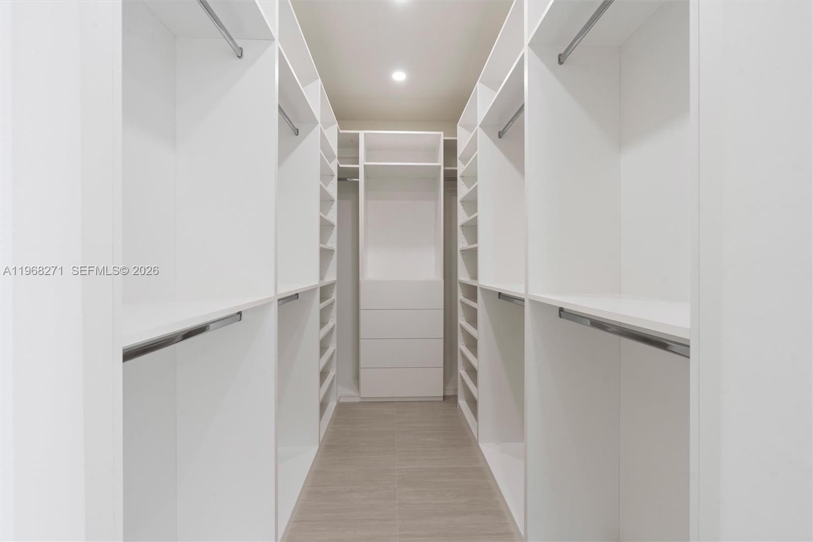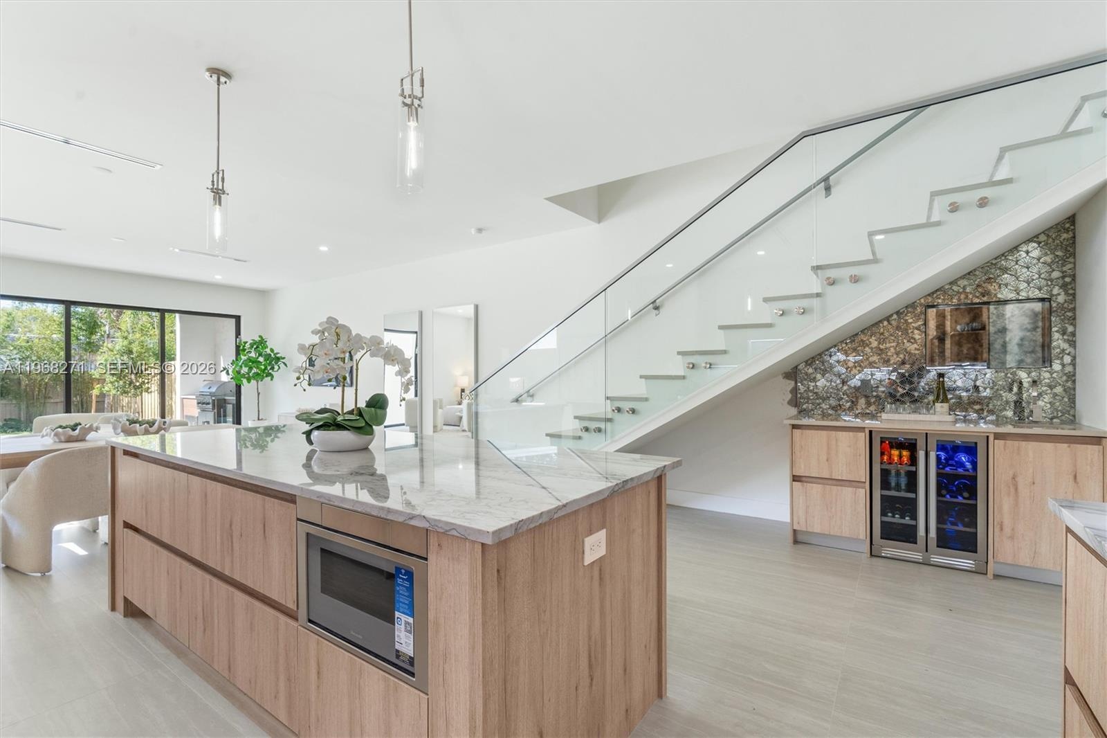 The chef’s kitchen is equipped with a Thermador Professional appliance package, gas range, built-in refrigerator, imported stone countertops, and floor-to-ceiling cabinetry. An indoor bar with dedicated wine and beverage centers enhances entertaining.