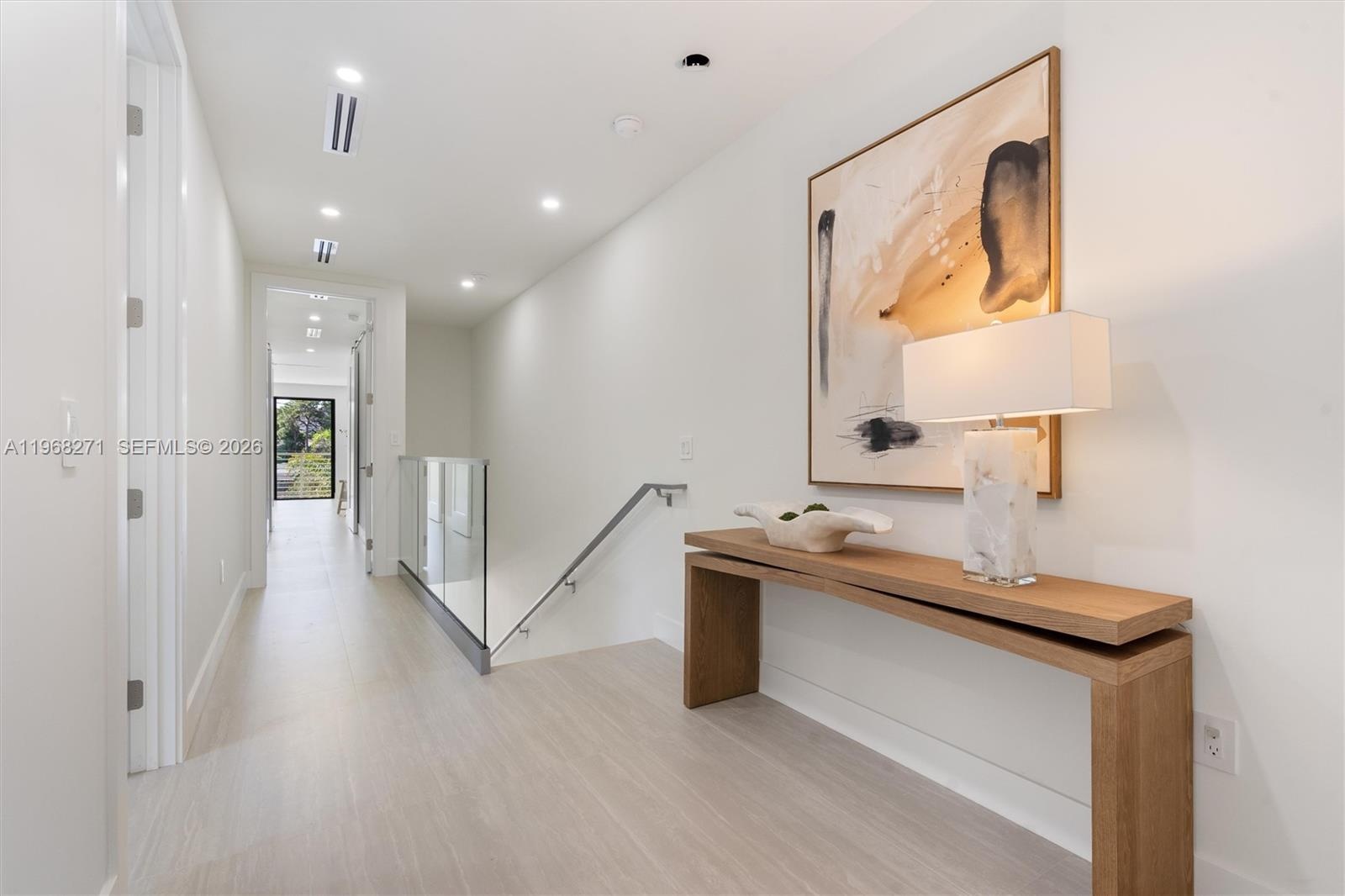 Spacious bedrooms feature en-suite baths and walk-in finished closets throughout with custom built-ins. The primary suite offers dual finished closets and a spa-inspired bath with soaking tub and oversized shower. Architectural highlights include glass railings and 8-foot doors throughout, creating an open, elevated feel.