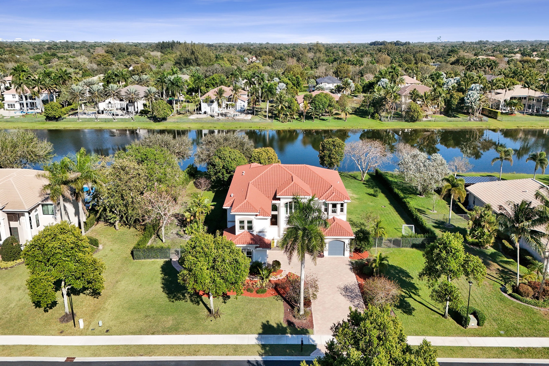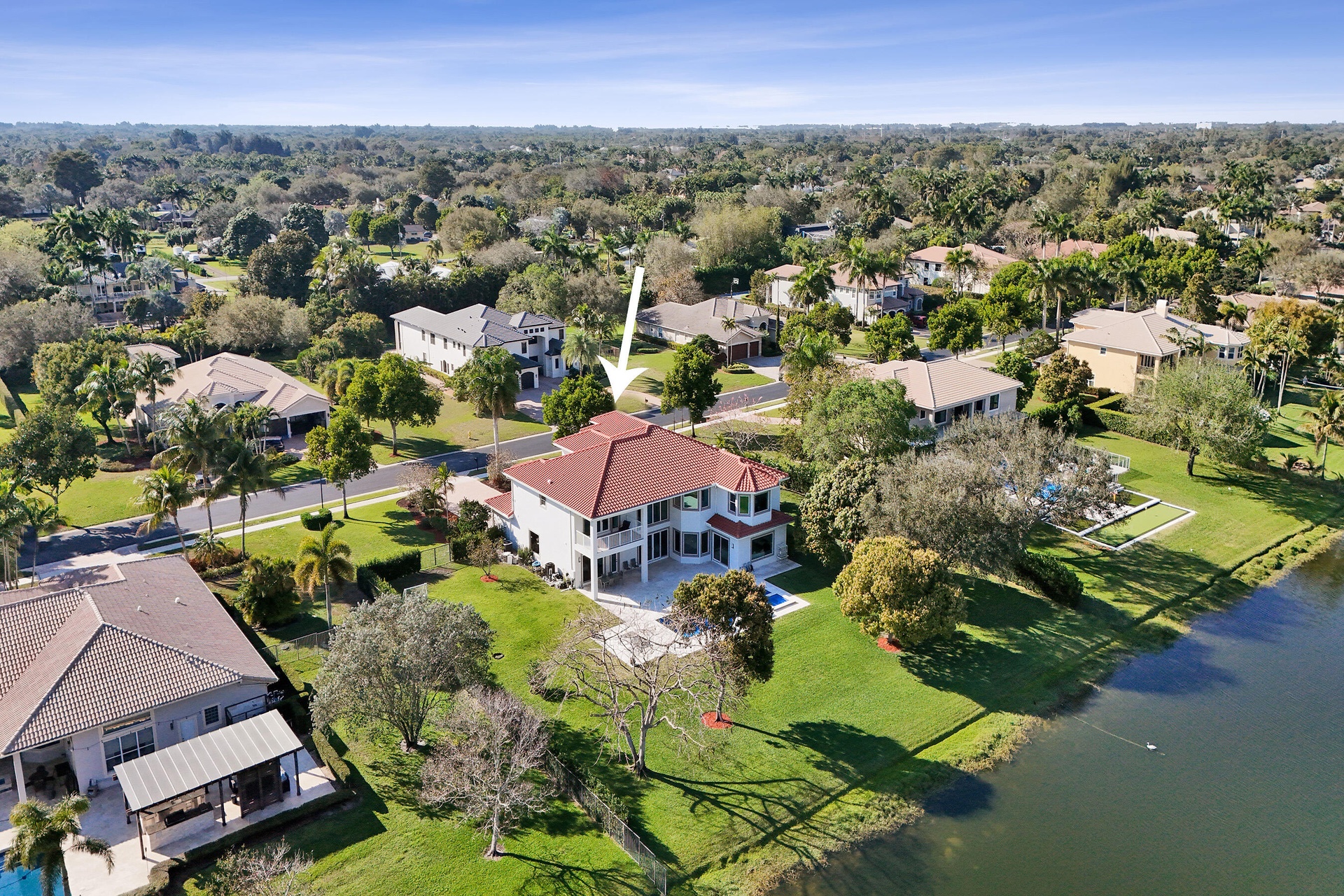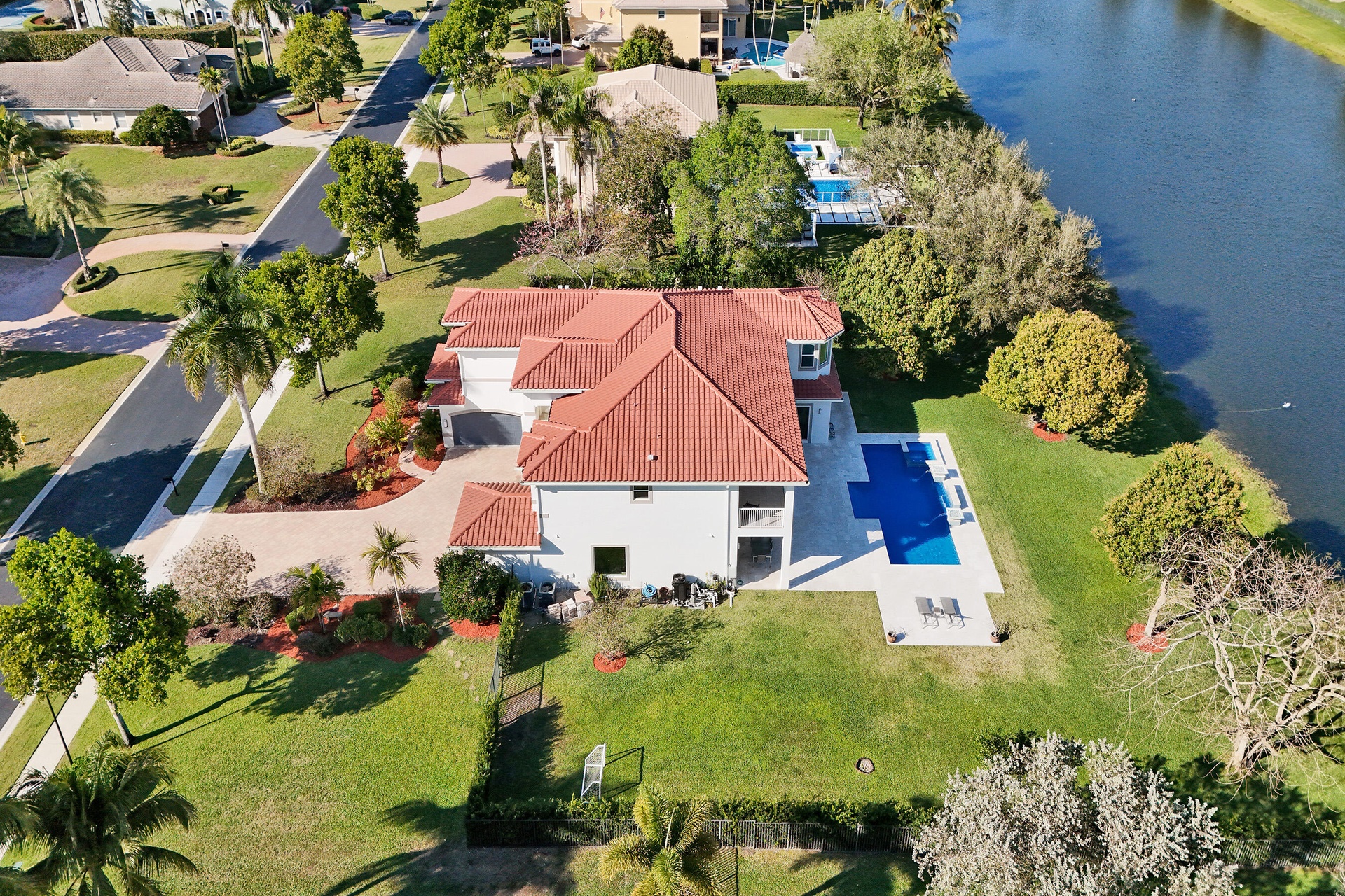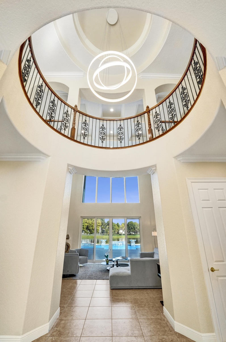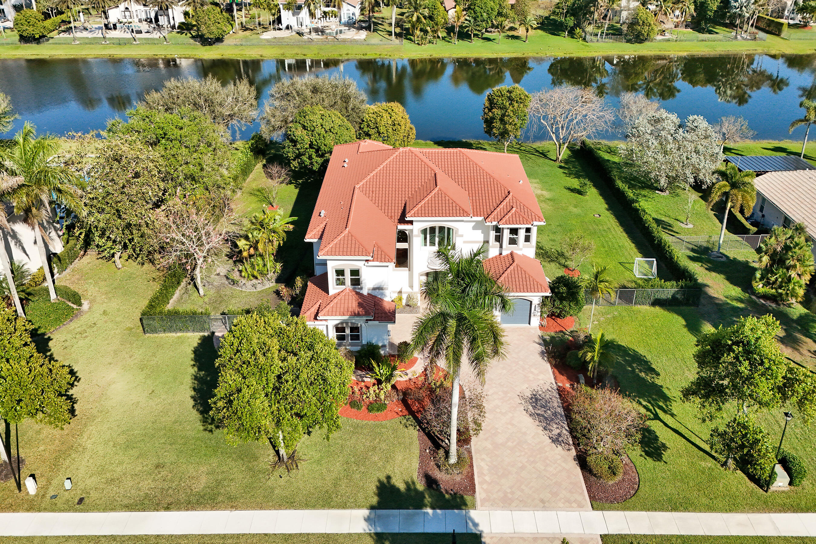 Experience true luxury living in this stunning 5 BR 6 BA estate on a massive (35,000+ SQ FT) lot complete with a brand new sparkling Van Kirk designed saltwater pool and spa, overlooking the lake! Towering floor to ceiling windows draw in an abundance of light to every room. Enjoy the spectacular water views from the moment you enter your home and its grand foyer. The large impressive living room w/ wet bar and the bright kitchen open up to your oasis backyard making this a true indoor-outdoor home, perfect for entertaining! Your immense backyard is surrounded by lush mature fruit trees adding to its tropical feel and lending much privacy. No detail has been spared. New gourmet kitchen with an oversized island & gorgeous marbled Brazilian stone countertops, new Monogram double-oven, smart wi-fi appliances, a walk-in pantry, including the custom led lighting makes for a very light, appealing open kitchen. This expanded Van Gogh model gives you the convenience of a bedroom on the main floor for guests or a live-in nanny. Main level also features a true dedicated substantial home office with large bookcases, plenty of shelving and room for two. Your private dining-room is stunning, with coffered ceilings, a picture window letting in lush, green garden views and light while comfortably seating 12 for dinner parties. New roof and AC. New impact windows. On the second story, enjoy a grand primary BR overlooking the water, his & her separate walk-in closets and a very large spa like bath with whirlpool jacuzzi tub. You have 3 additional bedrooms all with their own en-suite bath, a loft/media room which opens to an expansive covered balcony, overlooking your private backyard water oasis. Living here, you feel like you are on vacation every day! The epitome of Florida lifestyle! Ample consideration for cars here with 2 garages and an extended driveway to fit many more automobiles. Adding to convenience for electric vehicles you have not one but two EV stations. Utilizing modern technology this smart home offers Savant home automation system for integrating lighting, climate, entertainment, security and energy from one customizable interface. Long Lake Ranches is a coveted guard gated community known for its proximity to THE TOP-RATED SCHOOLS in the nation! Amenities include clubhouse, fitness center, tennis courts & basketball court. You are near equestrian trails & the scenic Tree Tops Park and minutes to great dining, restaurants and entertainment. This home provides the perfect mix of luxury, privacy and location.