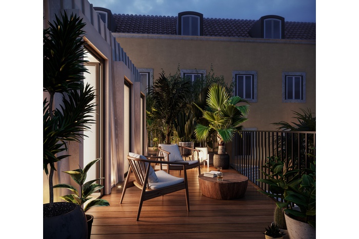 As soon as you step in this compound, you’ll feel immediately connected to nature, either from using the green solar energy collected by solar panels or just beholding the patio garden with blooming flora. You’ll feel the depth of the water that connects the patio to the private gardens 5 metres below, part of the reserved duplexes. You’ll be able to quietlu enjoy Lisbon’s sun on the swimming pool or have a good laugh with friends in the mini bar. With the 27 units available (26 apartments and 1 shop) you’ll find just what you need, exclusively for yourself.