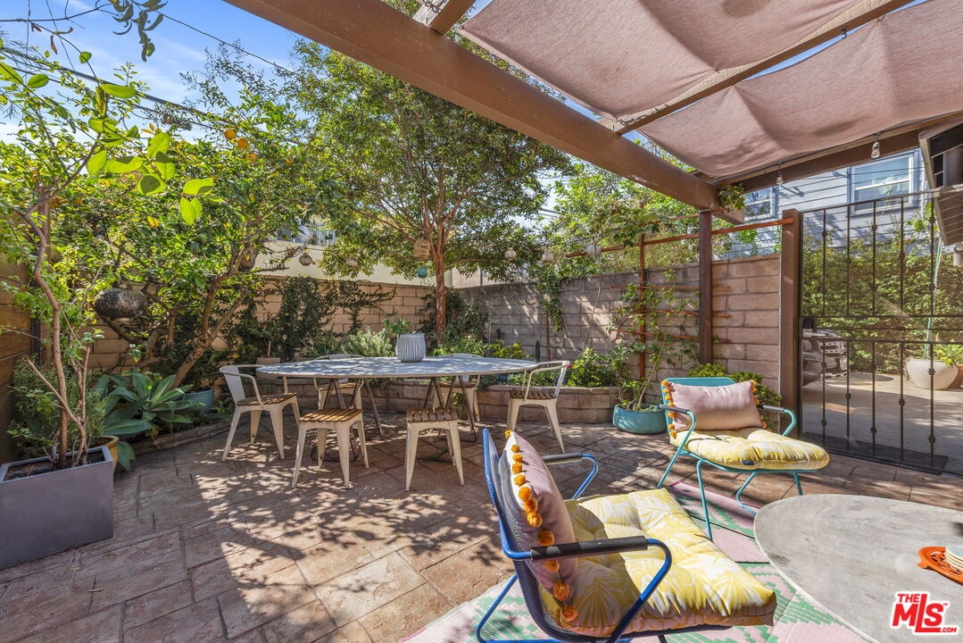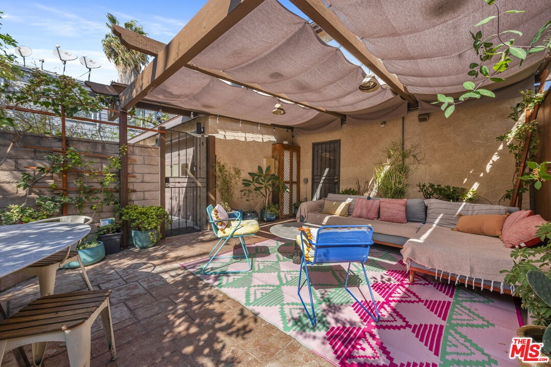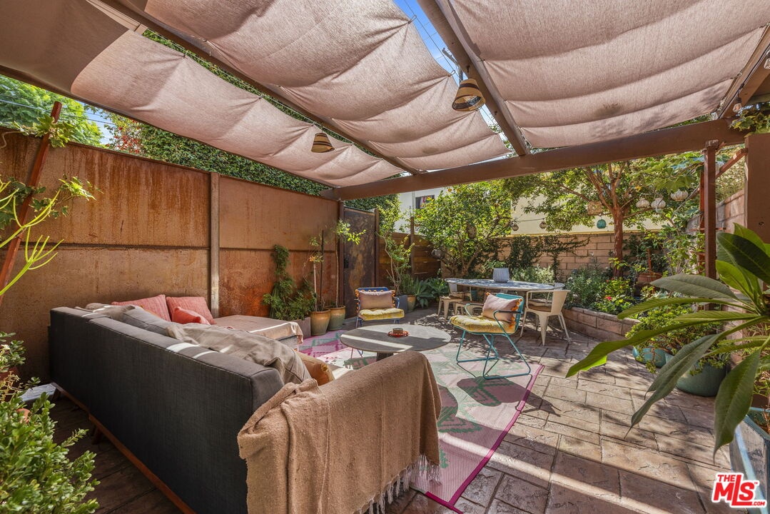 Tucked within a peaceful and highly coveted pocket of Santa Monica, this rare 4-bedroom, 3-bath townhouse lives like a single-family home. One of only tworesidences in the complex, it offers a lush outdoor patio, privacy, natural light, and the feeling of a detached single-family home. The home's inviting layout revolves arounda dramatic two-story living room with soaring ceilings, a central fireplace, and a skylight that floods the space with sunshine. Upstairs, the open circulation around the livingarea creates an airy, architectural sense of volume. The main level includes a bedroom with its own private terrace, a cheerful dining area with vibrant color accents, and awell-appointed kitchen that opens to the enchanting backyard. This serene and meticulously maintained outdoor space complete with a lemon tree, garden plantings, and alarge dining area is perfect for entertaining, al fresco dinners, or relaxing under twinkling string lights. Upstairs, the spacious primary suite features abundant light, a walk-incloset, and a recently remodeled bathroom showcasing colorful bohemian-chic tile, double vanity, soaking tub, and separate shower. Two additional bedrooms share amodern bathroom with bold red tile and a generous shower. Warm, welcoming, and full of charm, this home combines modern convenience with creative and eclecticcharacteroffering multiple private outdoor spaces, natural light from every direction, and the rare feel of a standalone home in the heart of Santa Monica. Located minutes from Water Garden and Colorado Garden Park, walking distance from Erewhon, within proximity to the beach, restaurants, markets, this charming property is truly in one ofLA's most iconic coastal neighborhoods.