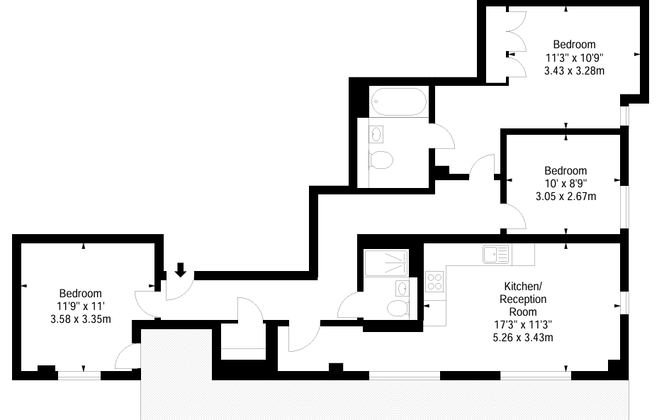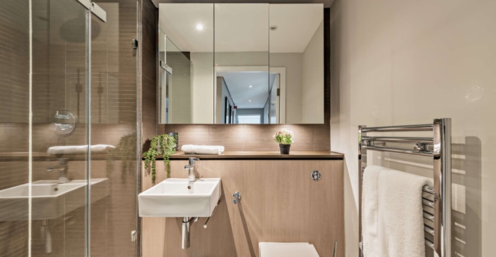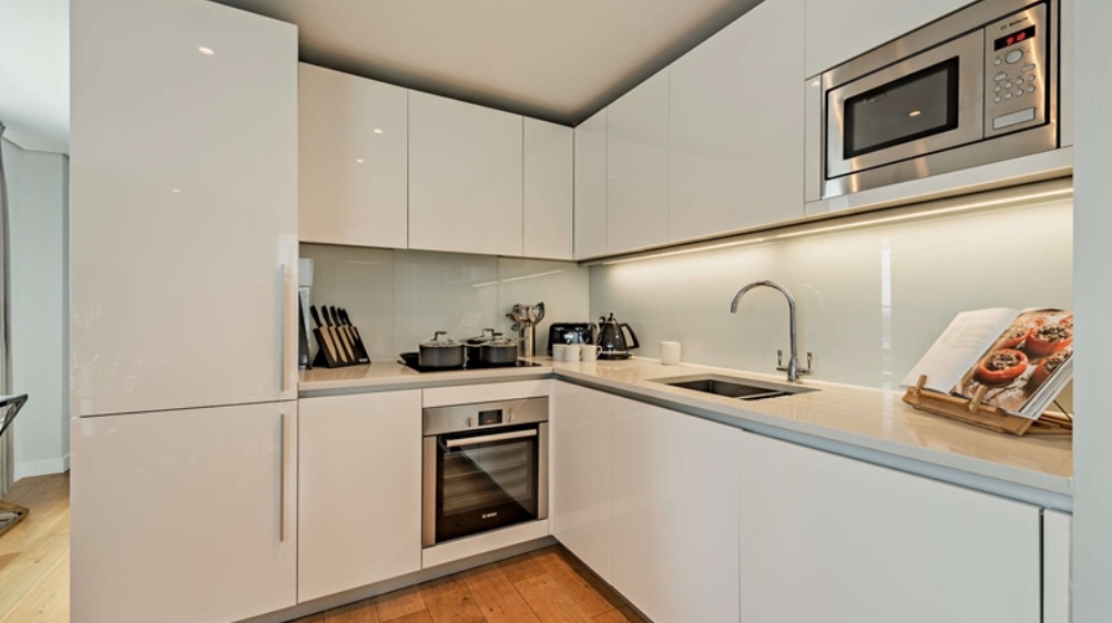 The property comprises three generously sized bedrooms and two well-appointed bathrooms, offering flexible living space for professionals, families, or sharers. Floor-to-ceiling windows enhance the sense of light and space, while the private balcony/terrace provides tranquil water views — a rare find in central London.