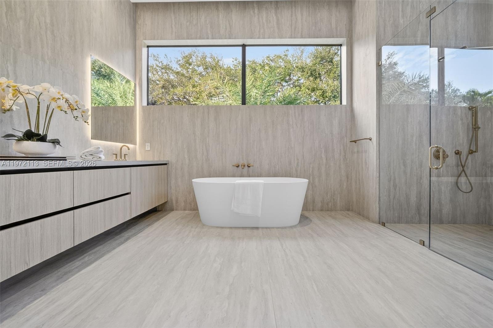 Completed in December 2025, this modern luxury residence sits on an expansive 34,000 SF corner lot, offering exceptional privacy and a quiet setting. The single-story home spans 6,658 SF and features 12-foot ceilings throughout, with a dramatic 16-foot ceiling in the main living area. The home offers 5 bedrooms, each with its own walk-in closet, and 6 full bathrooms. Designed for both everyday comfort and entertaining, the chef’s kitchen is equipped with Wolf and Sub-Zero appliances, a hidden walk-in pantry, and a stunning glass-enclosed wine cellar. Oversized 48” x 48” porcelain flooring flows throughout the home, complemented by porcelain finishes in all bathrooms. Additional features include a 3-car garage with 12-foot ceilings and the potential for car lifts, a concrete roof, speaker and camera system throughout and top-tier impact windows, providing durability, energy efficiency, and peace of mind.