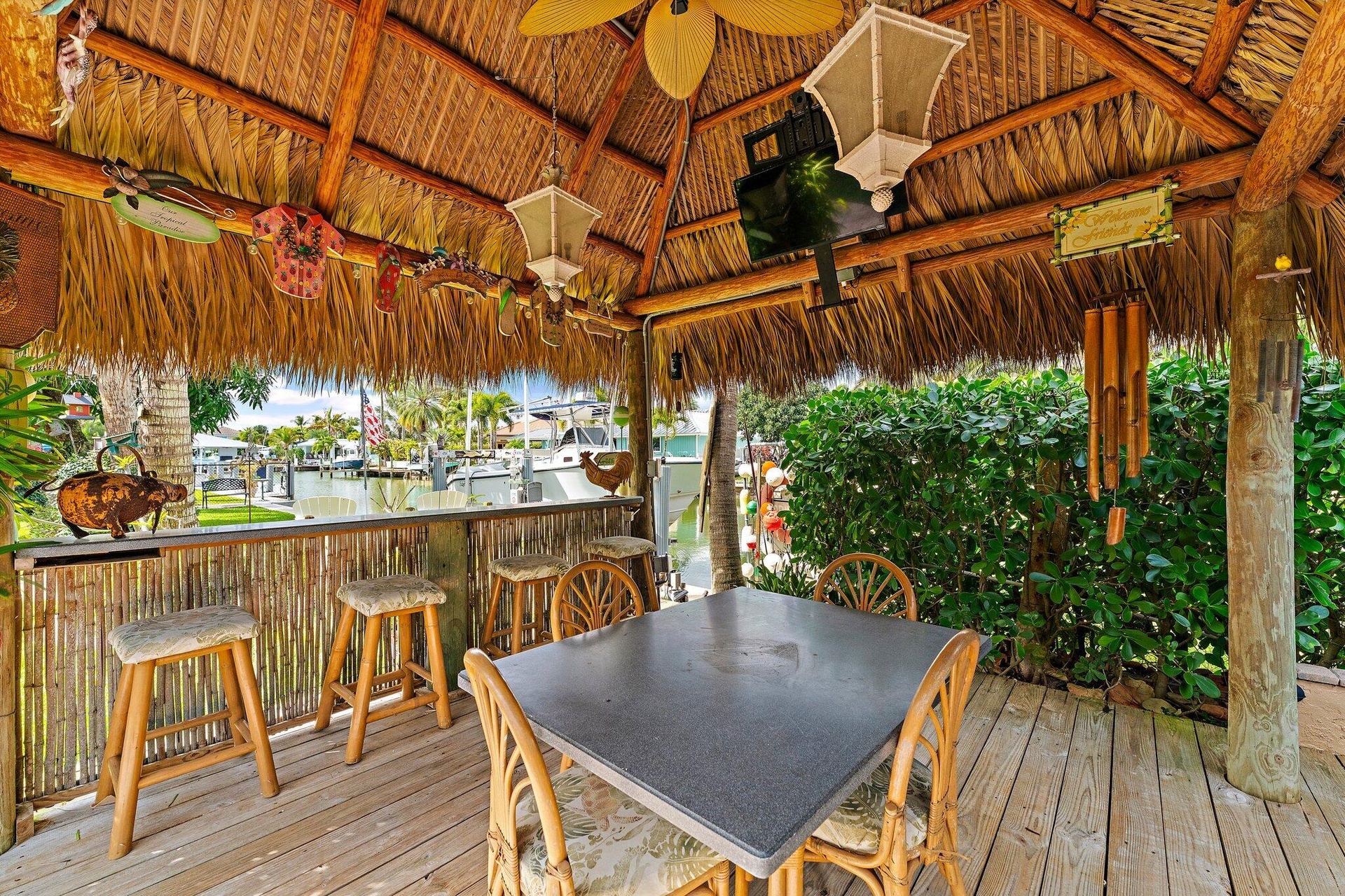 Slip away to your deep-water canal home. Feel like you are on vacation everyday! Charming features include: wood floors, split level master bedroom, spacious patio with separate tiki hut (new tiki roof 11/24), seawall raised & capped 2023, metal roof, impact glass, and boat lift. House remodeled in 2014 & addition in 2020. A short boat ride to sandbar, local waterfront restaurants and bars. Be the first out on Bahama crossings. A true backyard paradise!