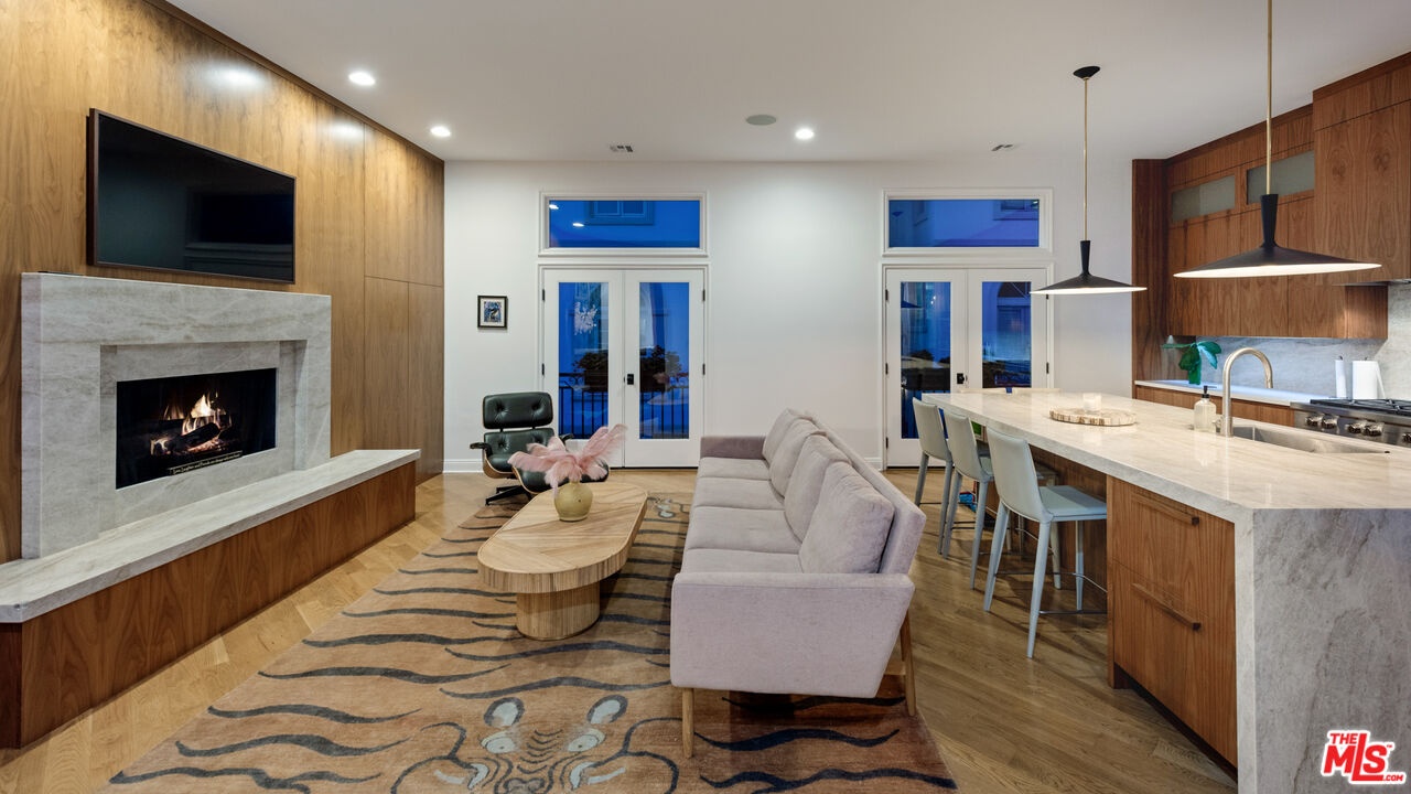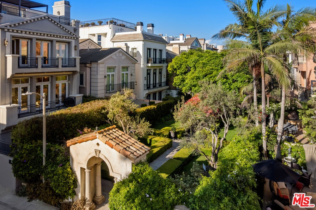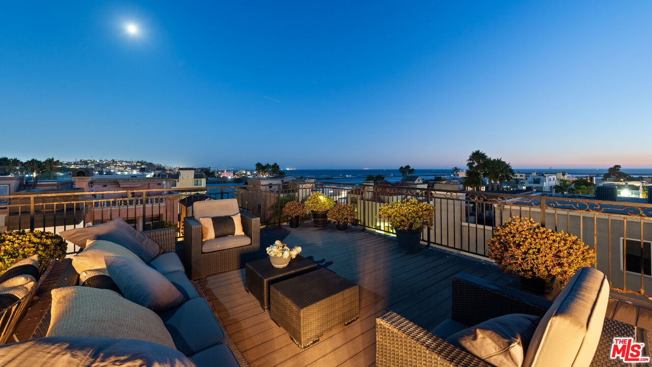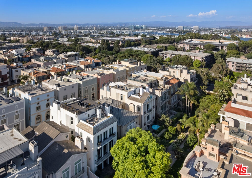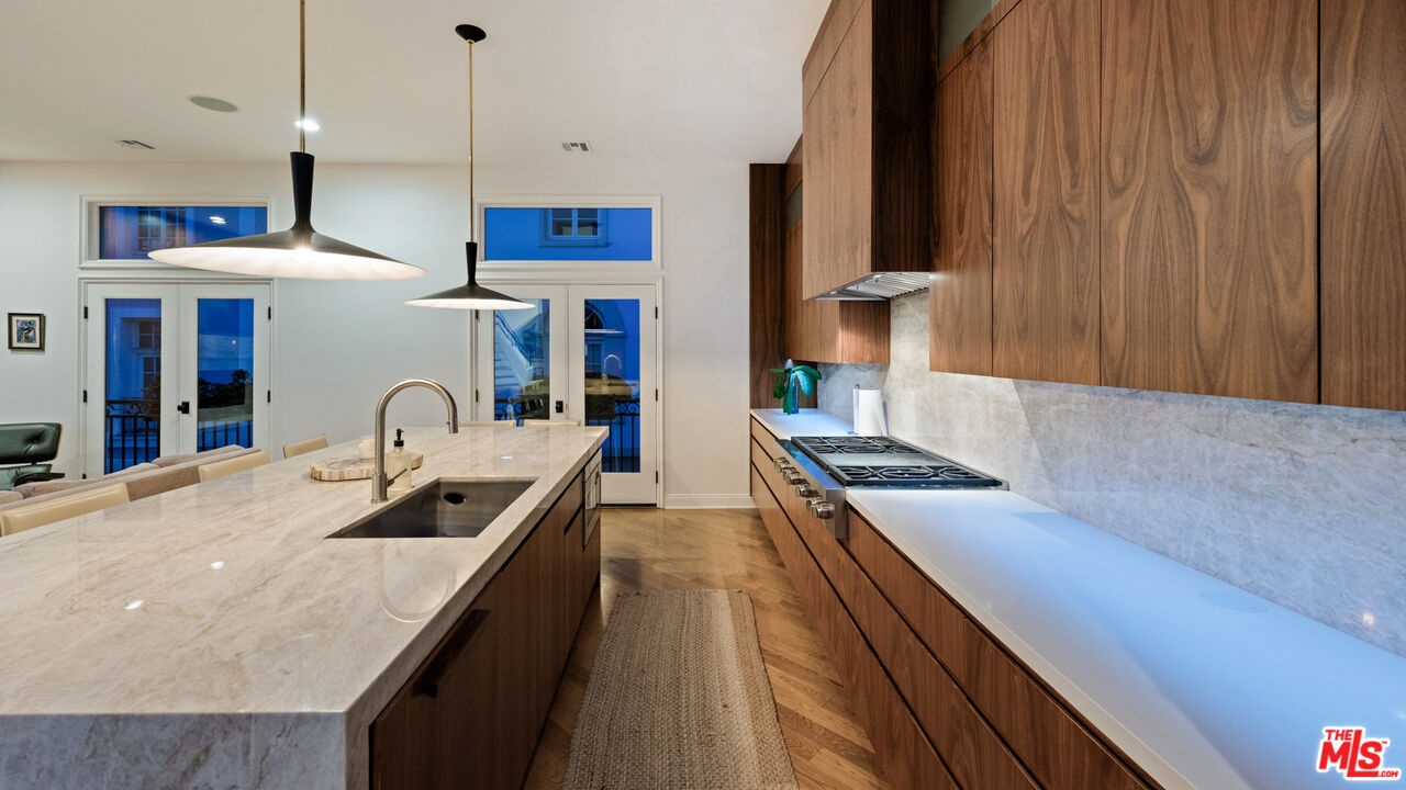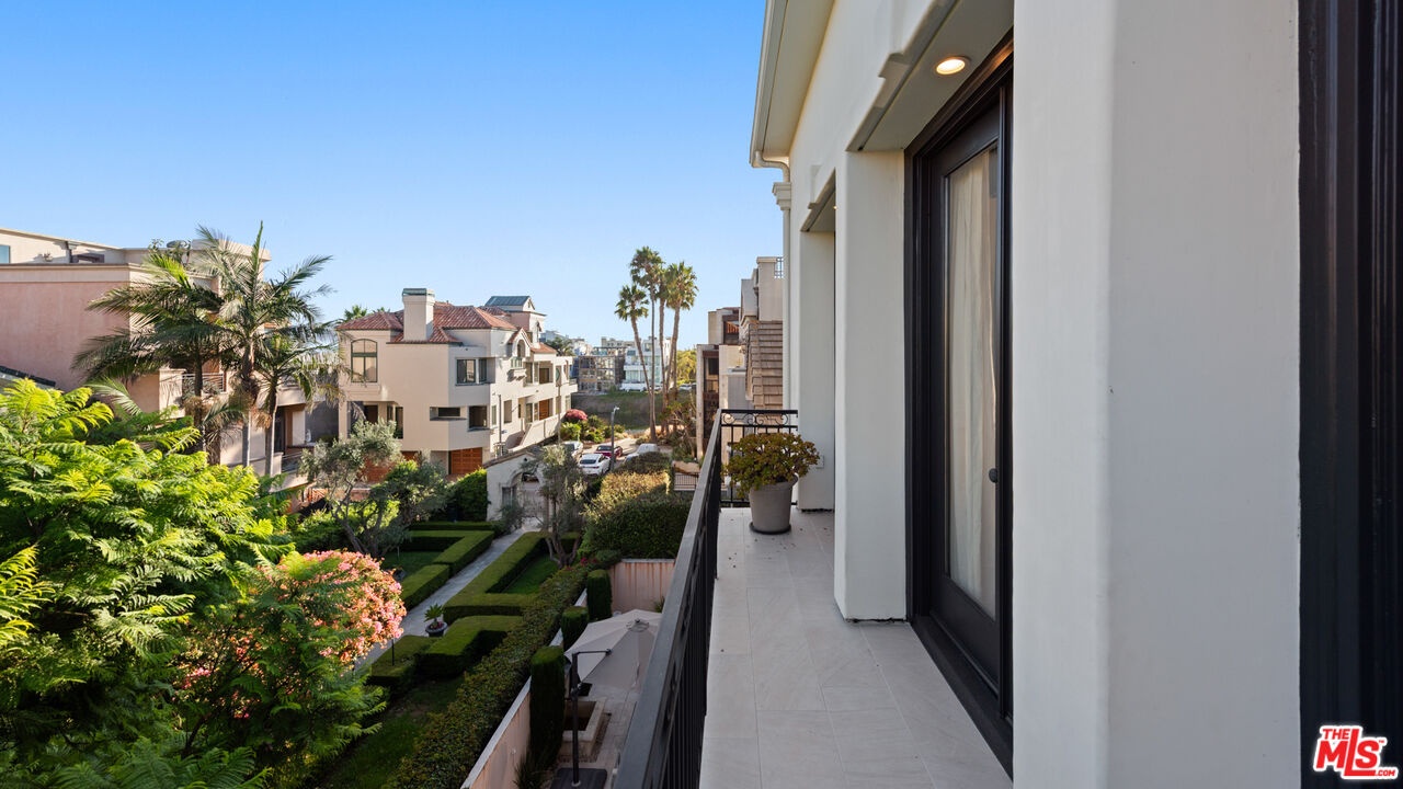 Step into a beautifully designed living area with soaring ceilings, expansive windows, and real oak hardwood floors throughout. Floor to ceiling French doors fill the home with natural light and open to lush greenery, creating seamless indoor-outdoor flow. Architectural ceilings with recessed lighting, a fully integrated LED lighting system, crown molding, and stately columns add timeless character. The open split-level layout is enhanced by custom wrought-iron railings. A Lutron RadioRA smart lighting system provides effortless ambiance control, and a built-in Sonos sound system delivers immersive audio throughout. The generous living space easily accommodates a grand piano and multiple seating areas, making it ideal for entertaining or everyday living. Neutral tones and curated finishes complete the refined design. The chef's kitchen blends modern style with warm natural textures. A dramatic waterfall edge island crafted from Taj Mahal quartzite offers ample prep space, integrated storage, and seating. Custom walnut cabinetry extends to the ceiling for a sleek built-in look and maximum storage. Additional Caesarstone surfaces complement the quartzite, paired with a full height stone backsplash and minimalist hardware. A professional grade Wolf range and Sub-Zero refrigerator provide premium performance and seamless integration. Matte black pendant lighting adds architectural interest. The oversized island includes an integrated sink with a statement faucet and luxury fixtures. Adjacent floor to ceiling French doors and a Juliet balcony bring in abundant natural light. The spa inspired primary bathroom features a floating dual sink vanity, designer lighting, custom tile flooring, a freestanding soaking tub, and a glass enclosed walk-in shower with Brizo fixtures. Marble surfaces and designer tile selections create a serene retreat. Bathrooms throughout the home are predominantly finished in marble for cohesive luxury. Each generously sized bedroom includes its own en-suite, appointed with marble finishes and designer tile for a refined and cohesive look. A garage level guest suite includes a spacious living area, versatile bonus space, and a stylish bar overlooking the patio, offering flexible living and entertaining options. Crowning the top is a double decker rooftop capturing panoramic ocean, city skyline, and mountain views. Ideal for entertaining, sunset lounging, or morning coffee. Spanning four levels with a private 4-stop elevator, designer finishes, integrated smart home features, fully integrated LED lighting, and discreet home protection, this residence delivers exceptional coastal city living. Located just moments from boutique shopping, restaurants, and the sand, the home also benefits from 24-hour security patrol for added peace of mind.