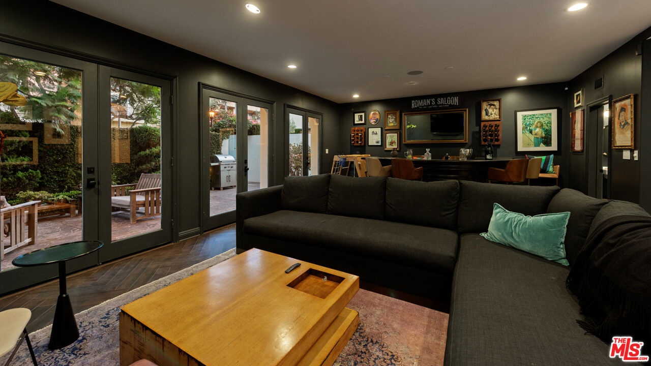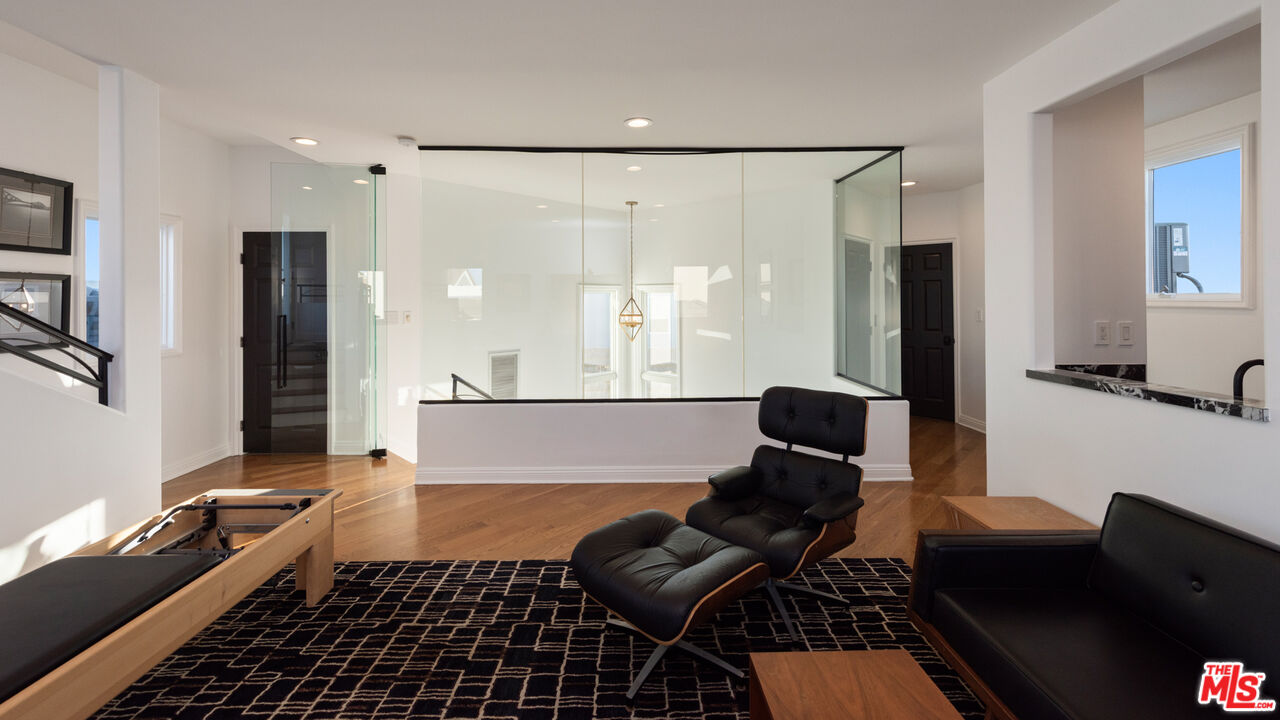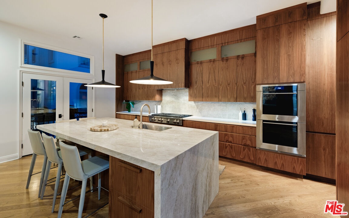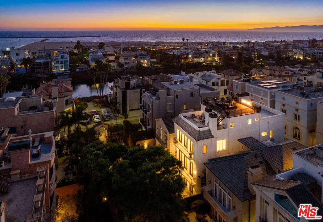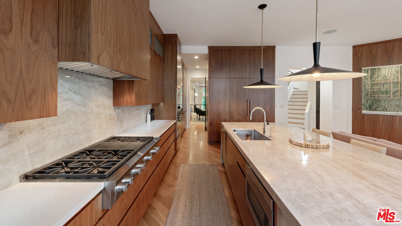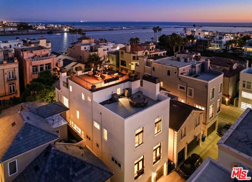 Step into a beautifully designed living area with soaring ceilings, expansive windows, and real oak hardwood floors throughout. Floor to ceiling French doors fill the home with natural light and open to lush greenery, creating seamless indoor-outdoor flow. Architectural ceilings with recessed lighting, a fully integrated LED lighting system, crown molding, and stately columns add timeless character. The open split-level layout is enhanced by custom wrought-iron railings. A Lutron RadioRA smart lighting system provides effortless ambiance control, and a built-in Sonos sound system delivers immersive audio throughout. The generous living space easily accommodates a grand piano and multiple seating areas, making it ideal for entertaining or everyday living. Neutral tones and curated finishes complete the refined design. The chef's kitchen blends modern style with warm natural textures. A dramatic waterfall edge island crafted from Taj Mahal quartzite offers ample prep space, integrated storage, and seating. Custom walnut cabinetry extends to the ceiling for a sleek built-in look and maximum storage. Additional Caesarstone surfaces complement the quartzite, paired with a full height stone backsplash and minimalist hardware. A professional grade Wolf range and Sub-Zero refrigerator provide premium performance and seamless integration. Matte black pendant lighting adds architectural interest. The oversized island includes an integrated sink with a statement faucet and luxury fixtures. Adjacent floor to ceiling French doors and a Juliet balcony bring in abundant natural light. The spa inspired primary bathroom features a floating dual sink vanity, designer lighting, custom tile flooring, a freestanding soaking tub, and a glass enclosed walk-in shower with Brizo fixtures. Marble surfaces and designer tile selections create a serene retreat. Bathrooms throughout the home are predominantly finished in marble for cohesive luxury. Each generously sized bedroom includes its own en-suite, appointed with marble finishes and designer tile for a refined and cohesive look. A garage level guest suite includes a spacious living area, versatile bonus space, and a stylish bar overlooking the patio, offering flexible living and entertaining options. Crowning the top is a double decker rooftop capturing panoramic ocean, city skyline, and mountain views. Ideal for entertaining, sunset lounging, or morning coffee. Spanning four levels with a private 4-stop elevator, designer finishes, integrated smart home features, fully integrated LED lighting, and discreet home protection, this residence delivers exceptional coastal city living. Located just moments from boutique shopping, restaurants, and the sand, the home also benefits from 24-hour security patrol for added peace of mind.