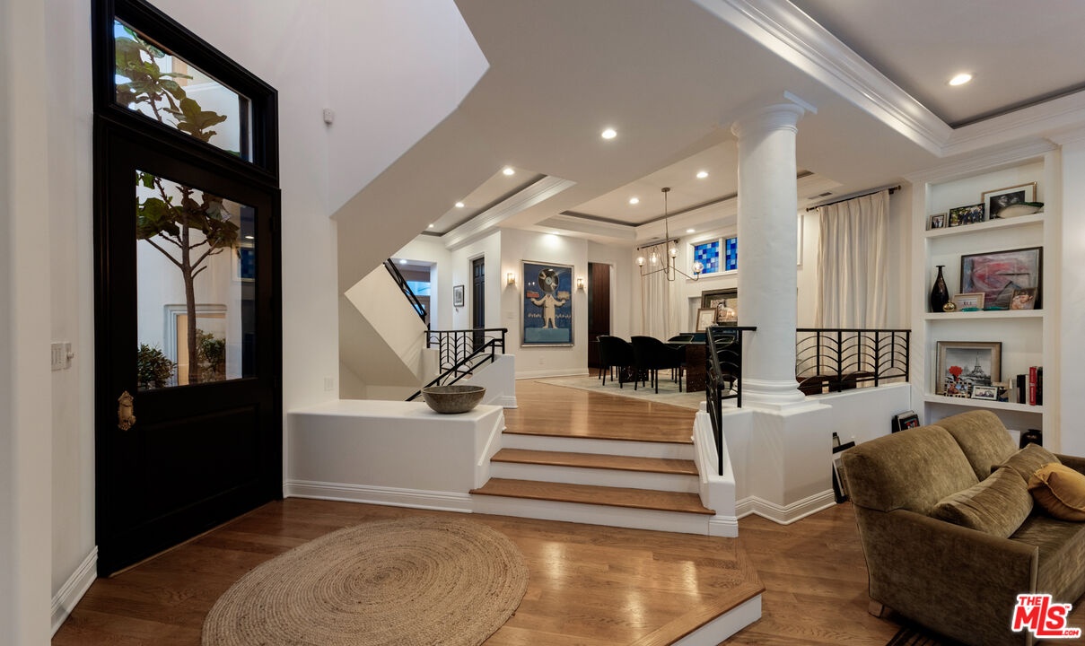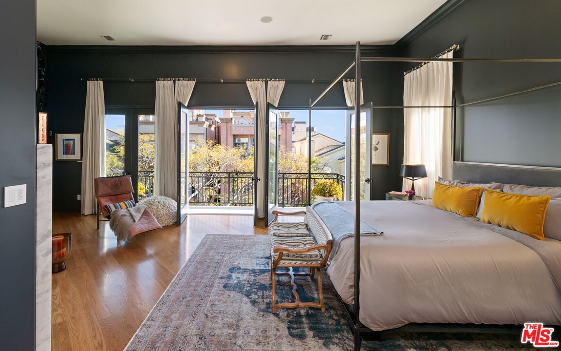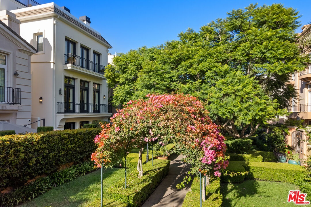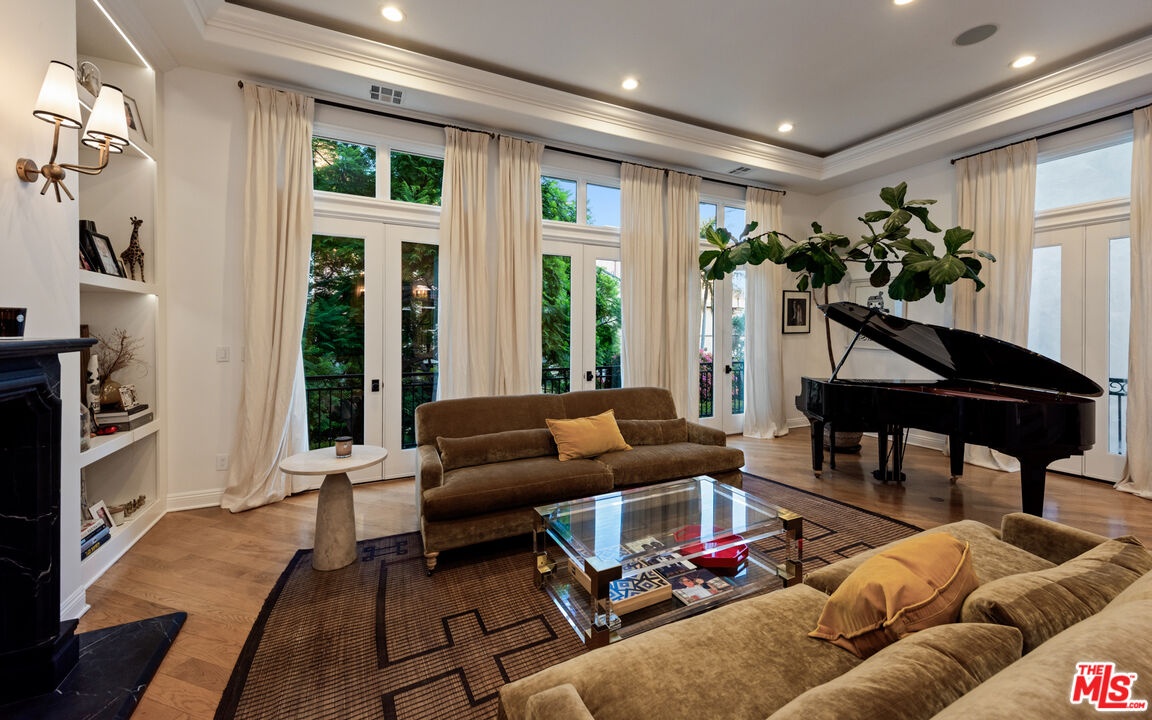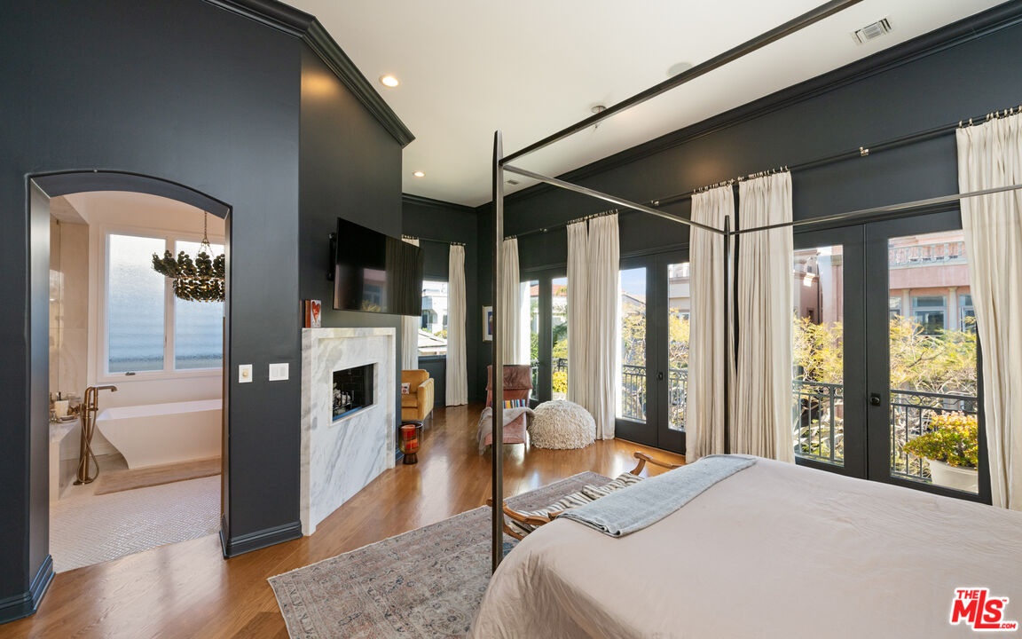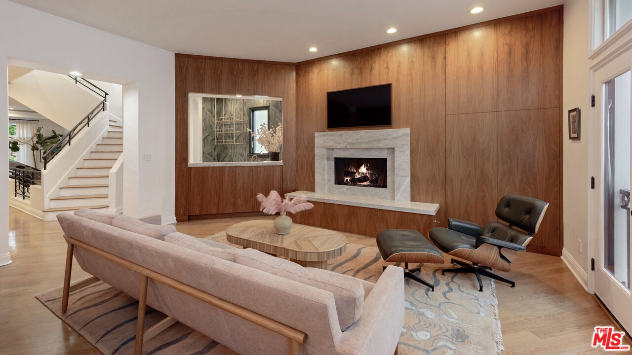 Step into a beautifully designed living area with soaring ceilings, expansive windows, and real oak hardwood floors throughout. Floor to ceiling French doors fill the home with natural light and open to lush greenery, creating seamless indoor-outdoor flow. Architectural ceilings with recessed lighting, a fully integrated LED lighting system, crown molding, and stately columns add timeless character. The open split-level layout is enhanced by custom wrought-iron railings. A Lutron RadioRA smart lighting system provides effortless ambiance control, and a built-in Sonos sound system delivers immersive audio throughout. The generous living space easily accommodates a grand piano and multiple seating areas, making it ideal for entertaining or everyday living. Neutral tones and curated finishes complete the refined design. The chef's kitchen blends modern style with warm natural textures. A dramatic waterfall edge island crafted from Taj Mahal quartzite offers ample prep space, integrated storage, and seating. Custom walnut cabinetry extends to the ceiling for a sleek built-in look and maximum storage. Additional Caesarstone surfaces complement the quartzite, paired with a full height stone backsplash and minimalist hardware. A professional grade Wolf range and Sub-Zero refrigerator provide premium performance and seamless integration. Matte black pendant lighting adds architectural interest. The oversized island includes an integrated sink with a statement faucet and luxury fixtures. Adjacent floor to ceiling French doors and a Juliet balcony bring in abundant natural light. The spa inspired primary bathroom features a floating dual sink vanity, designer lighting, custom tile flooring, a freestanding soaking tub, and a glass enclosed walk-in shower with Brizo fixtures. Marble surfaces and designer tile selections create a serene retreat. Bathrooms throughout the home are predominantly finished in marble for cohesive luxury. Each generously sized bedroom includes its own en-suite, appointed with marble finishes and designer tile for a refined and cohesive look. A garage level guest suite includes a spacious living area, versatile bonus space, and a stylish bar overlooking the patio, offering flexible living and entertaining options. Crowning the top is a double decker rooftop capturing panoramic ocean, city skyline, and mountain views. Ideal for entertaining, sunset lounging, or morning coffee. Spanning four levels with a private 4-stop elevator, designer finishes, integrated smart home features, fully integrated LED lighting, and discreet home protection, this residence delivers exceptional coastal city living. Located just moments from boutique shopping, restaurants, and the sand, the home also benefits from 24-hour security patrol for added peace of mind.