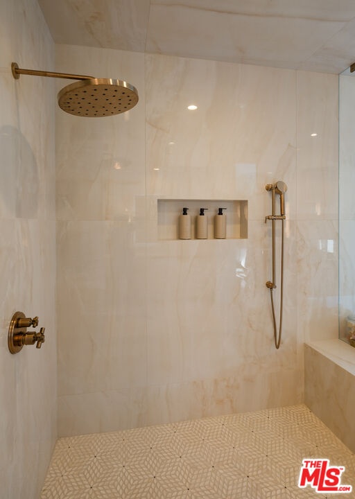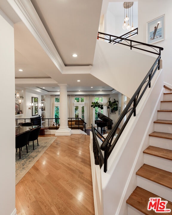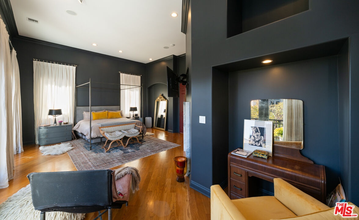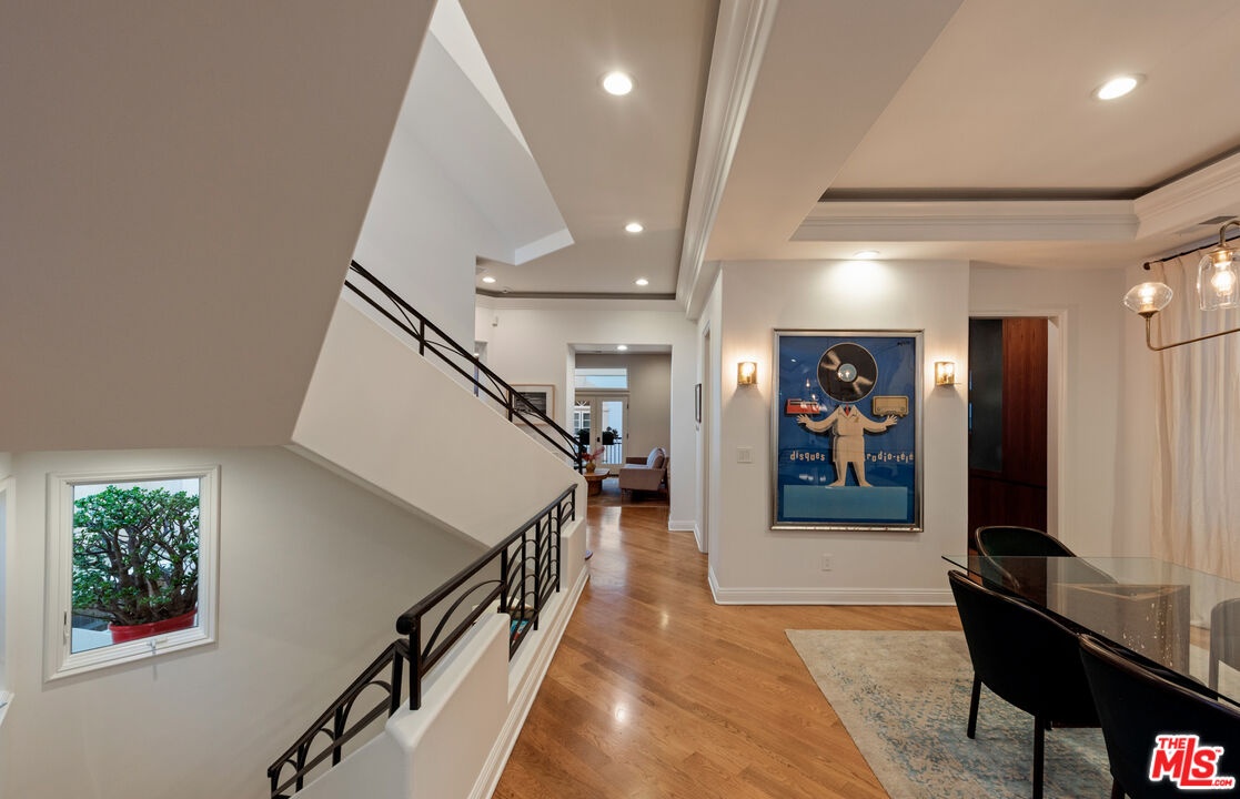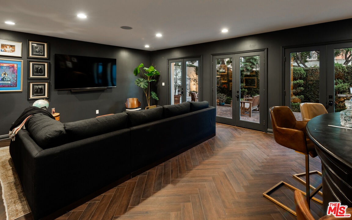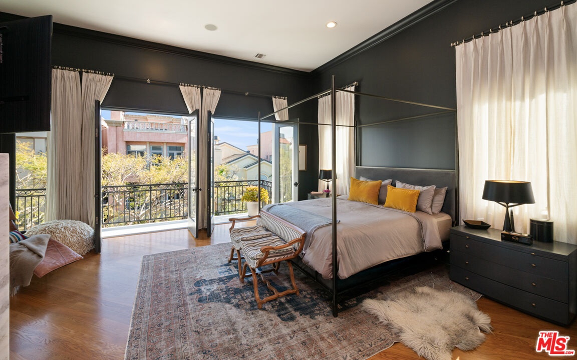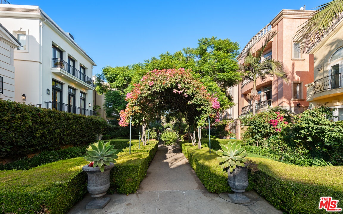 Step into a beautifully designed living area with soaring ceilings, expansive windows, and real oak hardwood floors throughout. Floor to ceiling French doors fill the home with natural light and open to lush greenery, creating seamless indoor-outdoor flow. Architectural ceilings with recessed lighting, a fully integrated LED lighting system, crown molding, and stately columns add timeless character. The open split-level layout is enhanced by custom wrought-iron railings. A Lutron RadioRA smart lighting system provides effortless ambiance control, and a built-in Sonos sound system delivers immersive audio throughout. The generous living space easily accommodates a grand piano and multiple seating areas, making it ideal for entertaining or everyday living. Neutral tones and curated finishes complete the refined design. The chef's kitchen blends modern style with warm natural textures. A dramatic waterfall edge island crafted from Taj Mahal quartzite offers ample prep space, integrated storage, and seating. Custom walnut cabinetry extends to the ceiling for a sleek built-in look and maximum storage. Additional Caesarstone surfaces complement the quartzite, paired with a full height stone backsplash and minimalist hardware. A professional grade Wolf range and Sub-Zero refrigerator provide premium performance and seamless integration. Matte black pendant lighting adds architectural interest. The oversized island includes an integrated sink with a statement faucet and luxury fixtures. Adjacent floor to ceiling French doors and a Juliet balcony bring in abundant natural light. The spa inspired primary bathroom features a floating dual sink vanity, designer lighting, custom tile flooring, a freestanding soaking tub, and a glass enclosed walk-in shower with Brizo fixtures. Marble surfaces and designer tile selections create a serene retreat. Bathrooms throughout the home are predominantly finished in marble for cohesive luxury. Each generously sized bedroom includes its own en-suite, appointed with marble finishes and designer tile for a refined and cohesive look. A garage level guest suite includes a spacious living area, versatile bonus space, and a stylish bar overlooking the patio, offering flexible living and entertaining options. Crowning the top is a double decker rooftop capturing panoramic ocean, city skyline, and mountain views. Ideal for entertaining, sunset lounging, or morning coffee. Spanning four levels with a private 4-stop elevator, designer finishes, integrated smart home features, fully integrated LED lighting, and discreet home protection, this residence delivers exceptional coastal city living. Located just moments from boutique shopping, restaurants, and the sand, the home also benefits from 24-hour security patrol for added peace of mind.